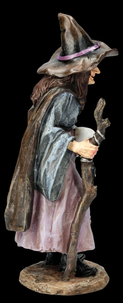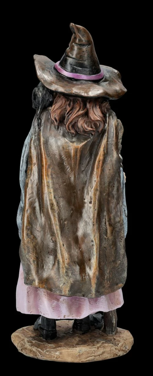 Böse oder doch gute Hexe? So genau kann man das bei dieser Hexe nicht feststellen, denn einerseits lächelt sie sehr nett, auf der anderen Seite trägt sie aber einen Schädel in ihrer Hand und die schwarze Hexenkatze auf ihrer Schulter duckt sich doch recht verdächtig. Allerdings ist ihr Zauberstock mit einem Pentagramm geschmückt und wie wir wissen, ist das Pentagramm eines der mächtigsten Schutzsymbole. Die Hexe wirkt so authentisch, als würde sie direkt aus dem Märchenland kommen. Für alle Hexen und alle, die Sinn für das Übernatürliche haben, ist die liebevoll handbemalte Hexe aus Kunststein (Polyresin) ein tolles Geschenk. Sie ist 21,5 cm hoch, 8,5 cm breit und 8 cm tief und wird garantiert überall zum sofortigen Blickfang.