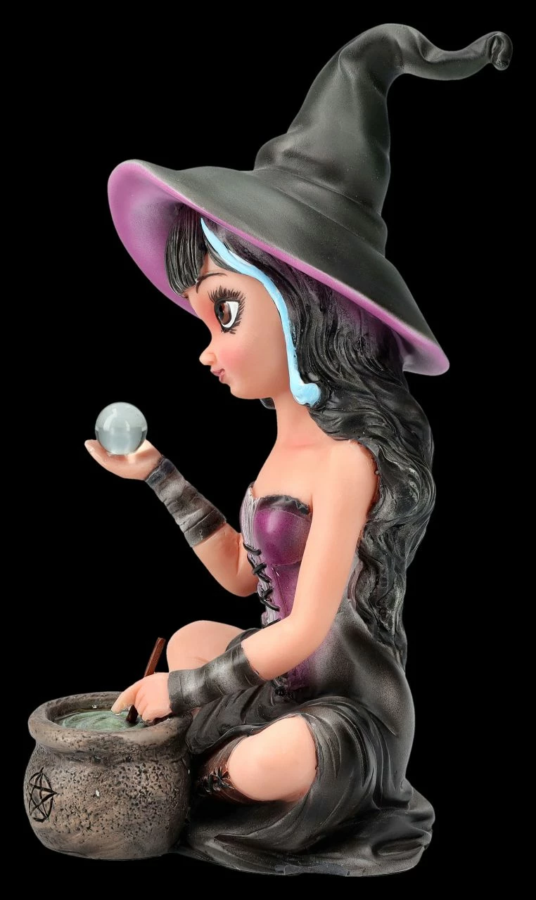 In ihrem lila-schwarzen Kleid und Hexenhut sitzt Pruedence vor dem Hexenkessel, in dem sie ihren Zaubertrank braut. Während sie mit der linken Hand im Kessel rührt, zeigt sie uns mit der rechten Hand ihre magische Zauberkugel. Ist Pruedence die gefährlichste unter ihren Schwestern – oder wirkt das nur so? Mit den großen Augen und dem Augenaufschlag wirkt sie eher unschuldig – aber kann man ihr trauen? Die 15 cm hohe, 8 cm breite und 7,5 cm tiefe Hexen Figur ist detailreich aus Kunststein (Polyresin) gefertigt und liebevoll von Hand bemalt. Die bezaubernde Hexe Proedence ist – vielleicht auch gleich mit ihren Hexenschwestern aus unserem Shop – auch ein wunderbares Geschenk.