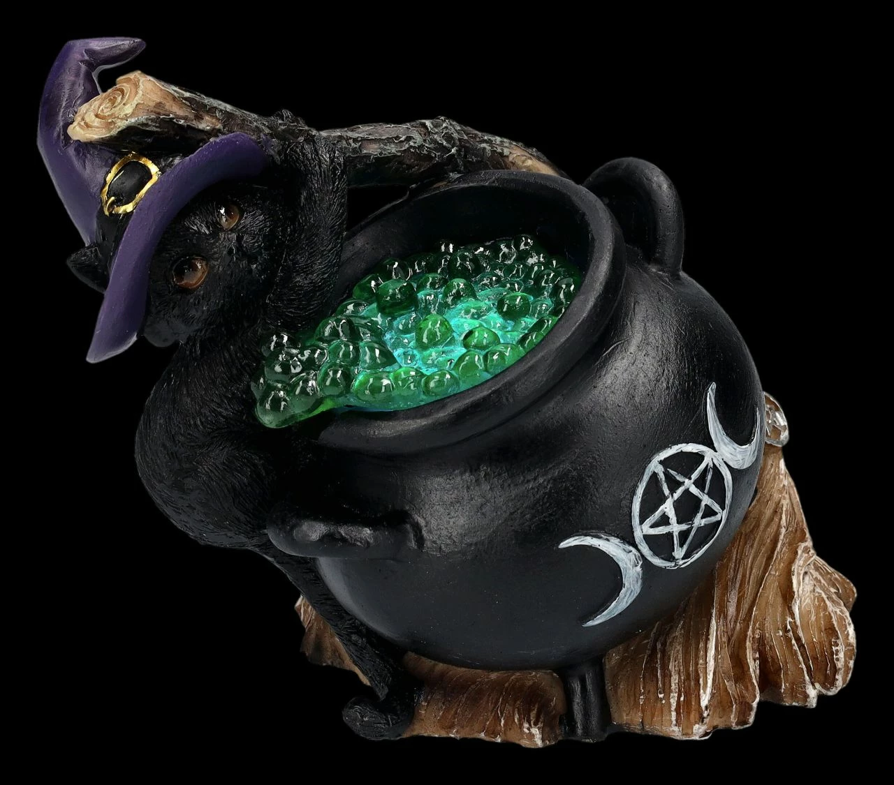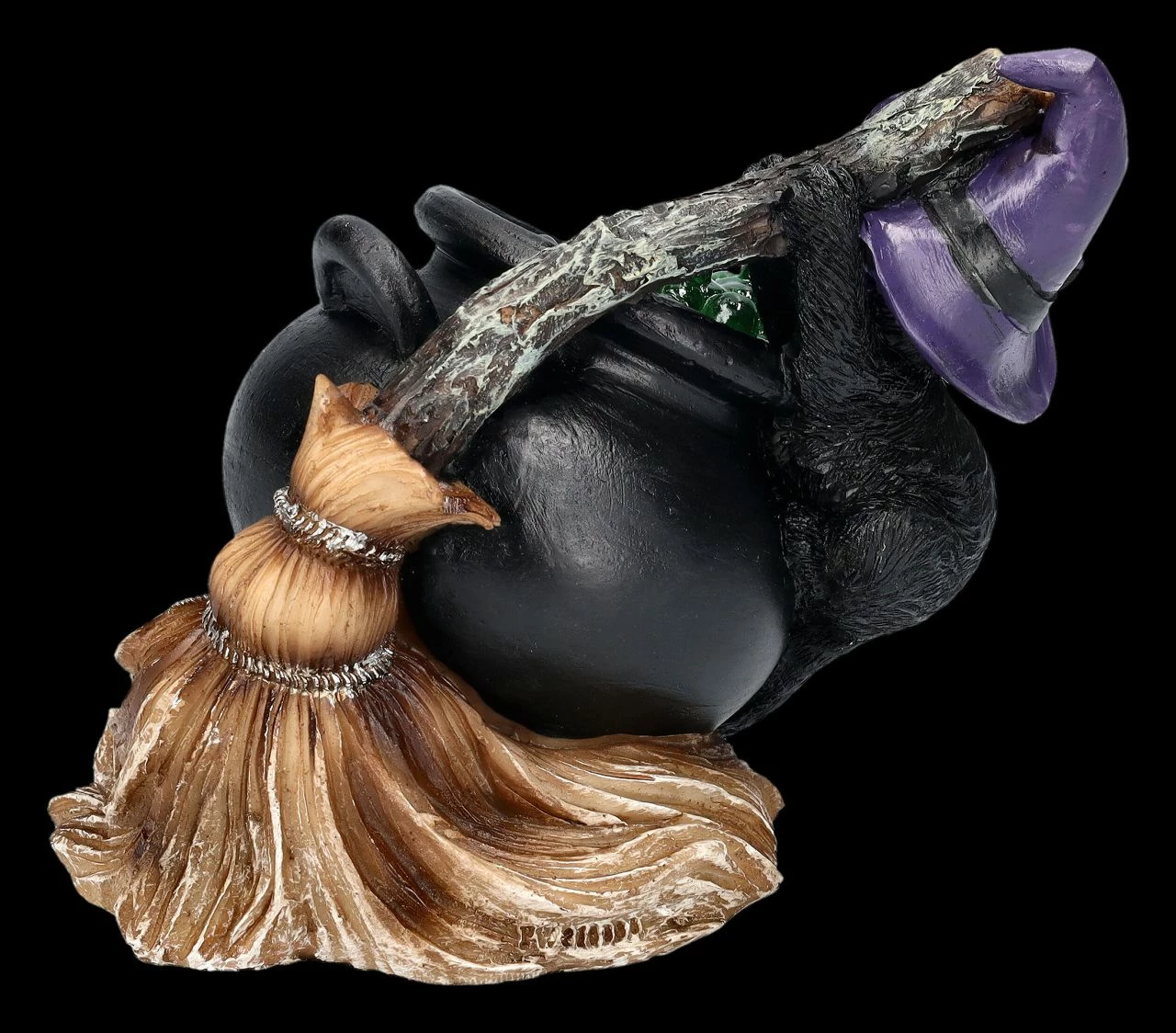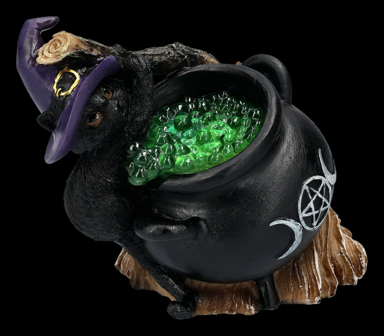 Oh, oh, oh – wer hilft mir jetzt, den brodelnden Kessel festzuhalten? Da hat sich die kleine Hexenkatze wohl bei der Menge vertan, als sie das Gebräu im Kessel zum Kochen brachte. Der Inhalt des Hexenkessels wird in magisches Licht getaucht, sobald die batteriebetriebene LED-Beleuchtung mit sanftem Farbwechsler eingeschaltet ist. Die niedliche, leicht verzweifelte Hexenkatze mit dem Kessel ist 12,5 cm hoch, 15 cm breit und 10,5 cm tief und aus handbemaltem Kunststein (Polyresin) gefertigt. Die 2 x AA-Batterien, die für die LED-Beleuchtung benötigt werden, sind nicht in der Lieferung enthalten. Als Geschenk ist die kleine Hexenkatze ein lustiger Hinweis, bei der Magie des Kochens auf die Mengenangaben zu achten.