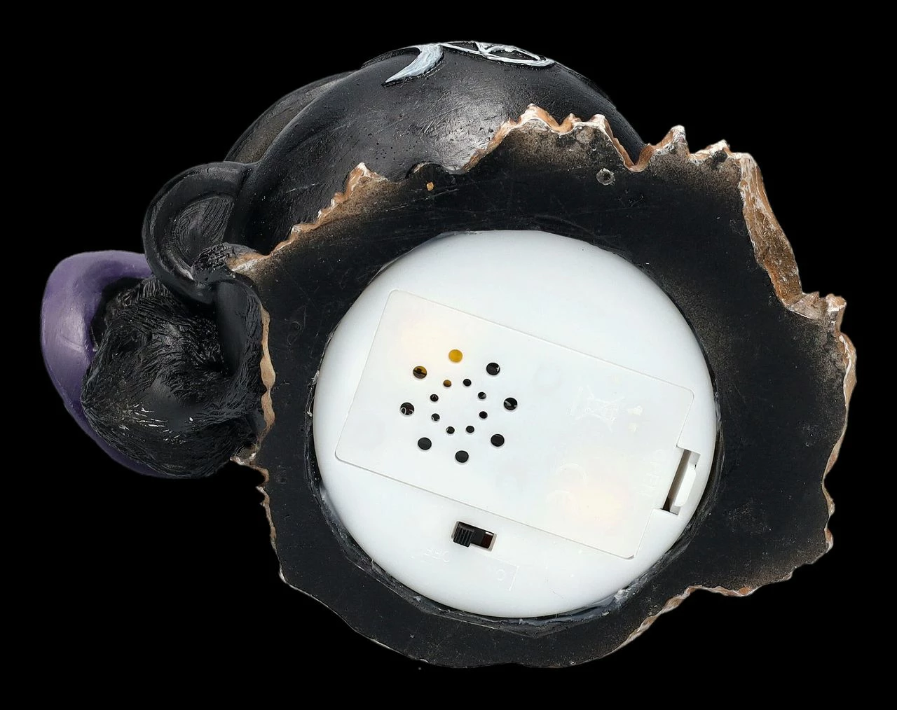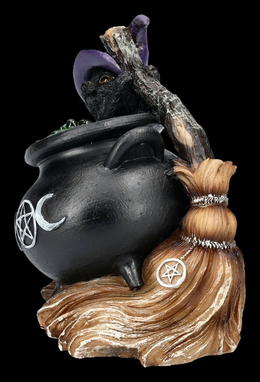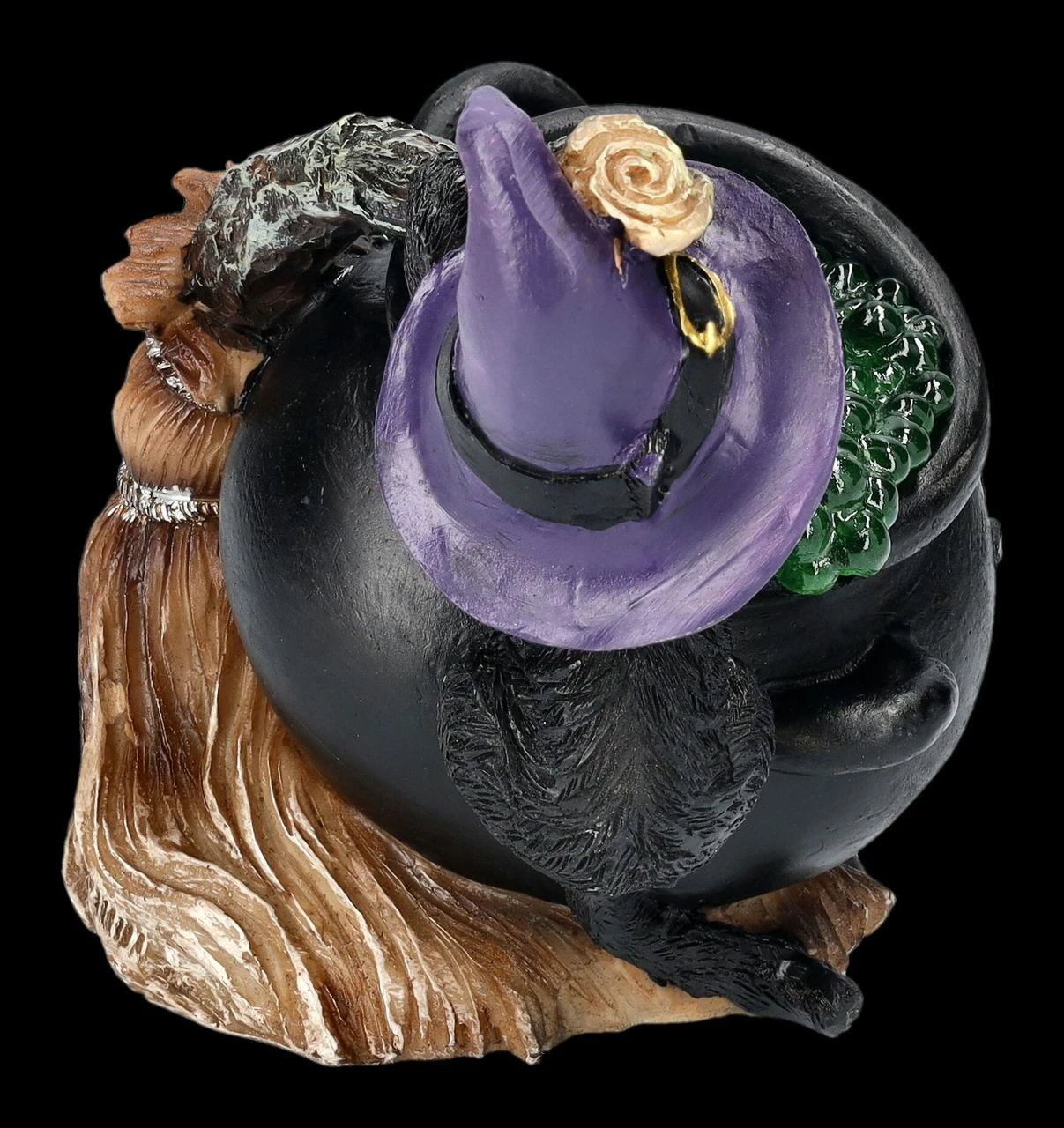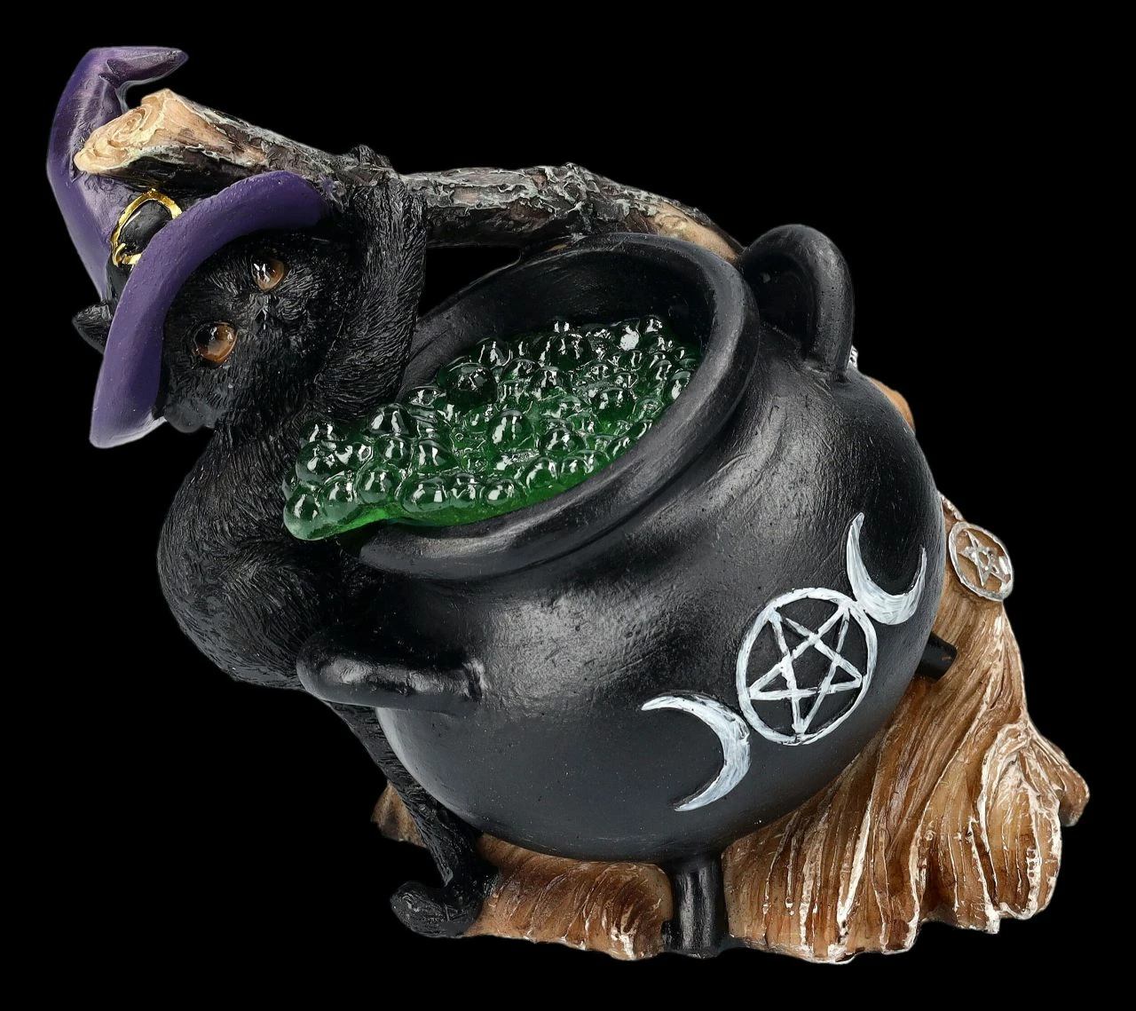 Oh, oh, oh – wer hilft mir jetzt, den brodelnden Kessel festzuhalten? Da hat sich die kleine Hexenkatze wohl bei der Menge vertan, als sie das Gebräu im Kessel zum Kochen brachte. Der Inhalt des Hexenkessels wird in magisches Licht getaucht, sobald die batteriebetriebene LED-Beleuchtung mit sanftem Farbwechsler eingeschaltet ist. Die niedliche, leicht verzweifelte Hexenkatze mit dem Kessel ist 12,5 cm hoch, 15 cm breit und 10,5 cm tief und aus handbemaltem Kunststein (Polyresin) gefertigt. Die 2 x AA-Batterien, die für die LED-Beleuchtung benötigt werden, sind nicht in der Lieferung enthalten. Als Geschenk ist die kleine Hexenkatze ein lustiger Hinweis, bei der Magie des Kochens auf die Mengenangaben zu achten.