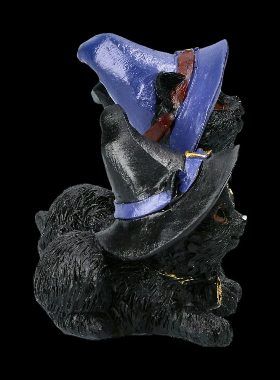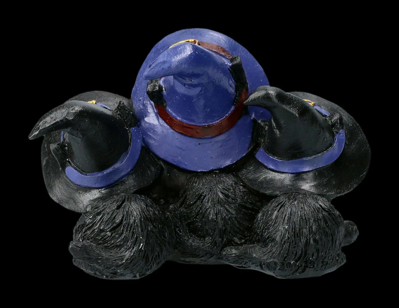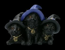 Die drei kleinen schwarzen Hexenkatzen mit den Hexenhüten und dem goldenen Schmuck mit Pentagramm scheinen ein kleines Hexenkonzert anzustimmen. Die niedliche Katzenfigur Familar Felines ist detailreich aus Kunststein (Polyresin) gefertigt und liebevoll handbemalt. Sie ist 6 cm hoch, 9,5 cm breit und 5 cm tief und ein putziges Geschenk für alle Freunde kleiner Hexenkatzen.