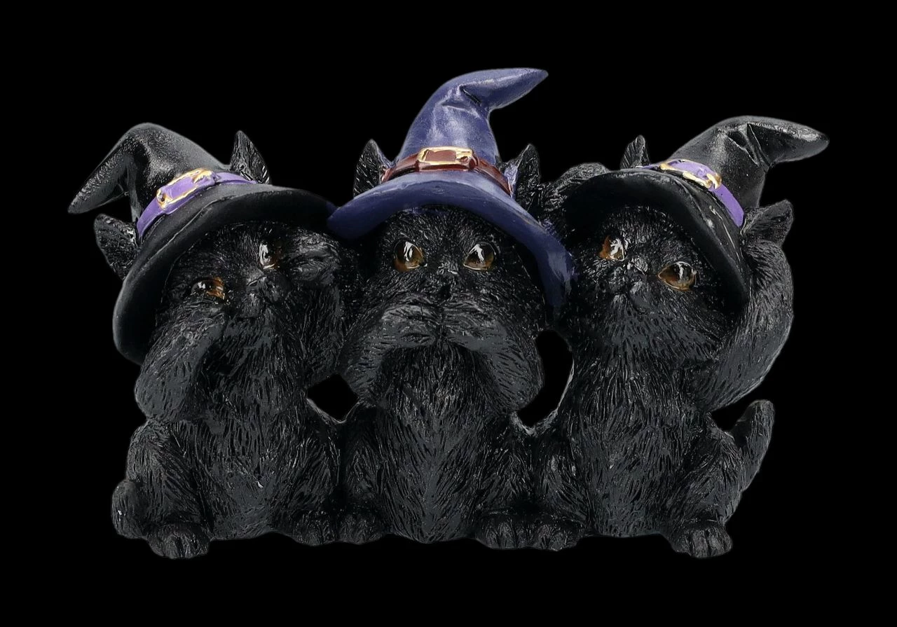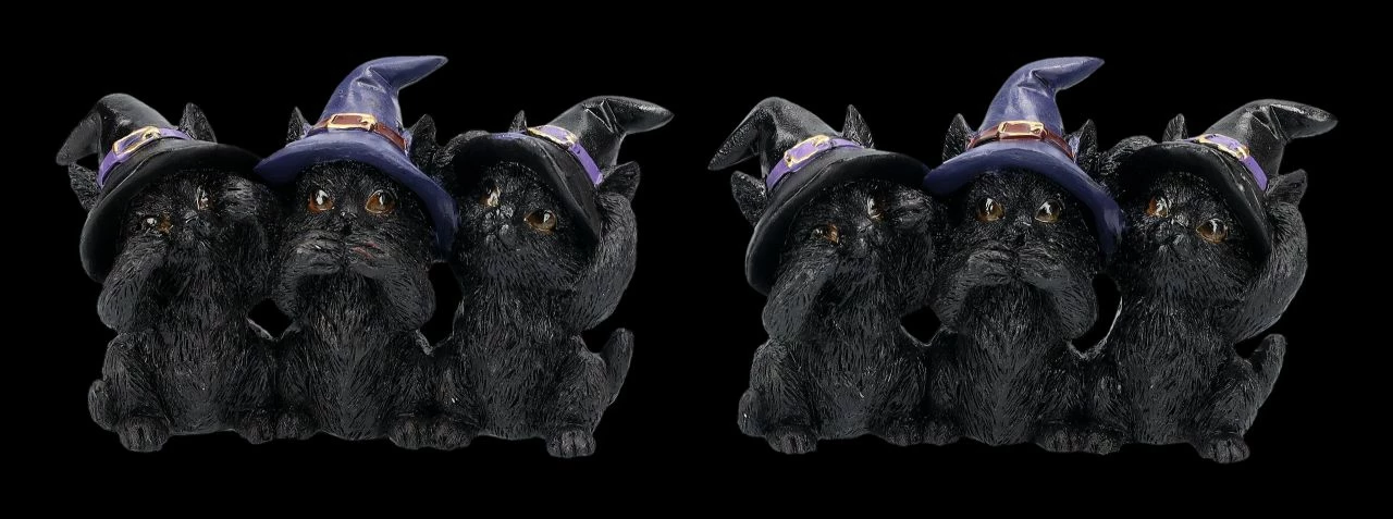 Nichts Böses hören, sehen und schon gar nicht verraten – das zeigen die drei lustigen schwarzen Hexenkatzen mit den Hexenhüten ganz deutlich. Also kann man sie an Halloween oder in allen magischen Nächten als Deko ins Fenster stellen. Da sie im 2er Set auftreten, können sie natürlich perfekt mit Freunden geteilt, oder auch als Geschenk zur Halloween-Party mitgenommen werden. Das je 7 cm hohe, je 11,5 cm breite und je 4,5 cm tiefe 2er-Set mit den lustigen Hexen Katzen ist aus liebevoll handbemaltem Kunststein (Polyresin) gefertigt.