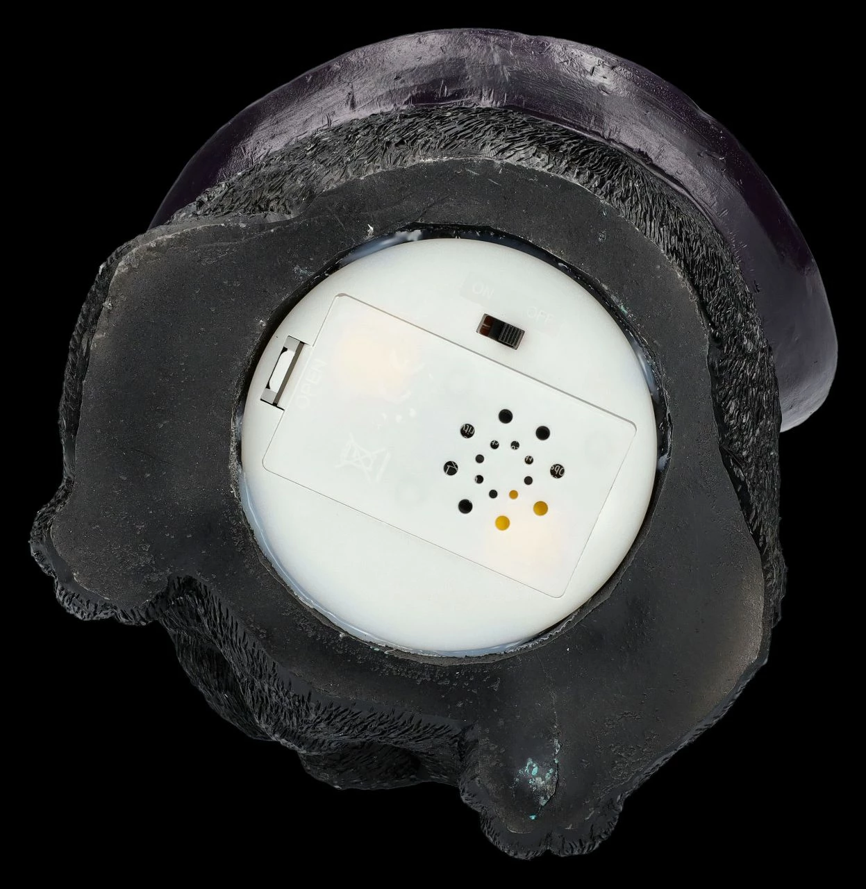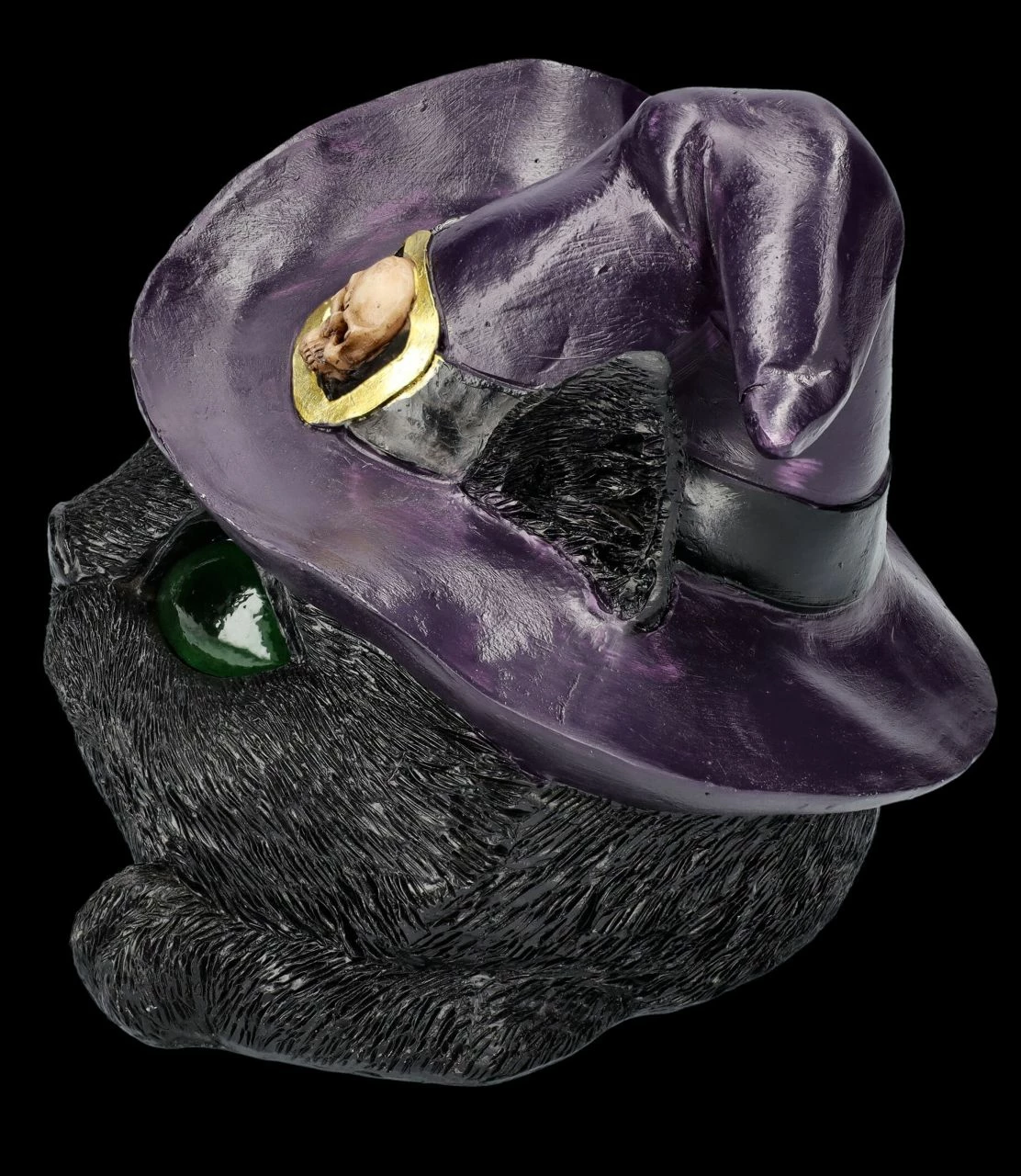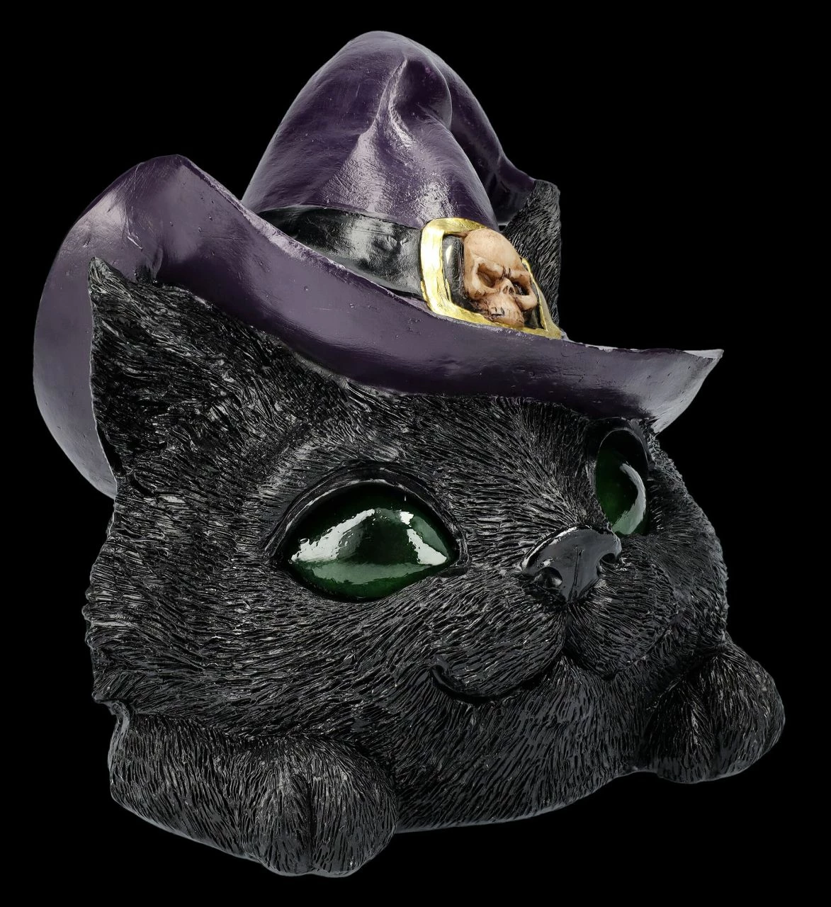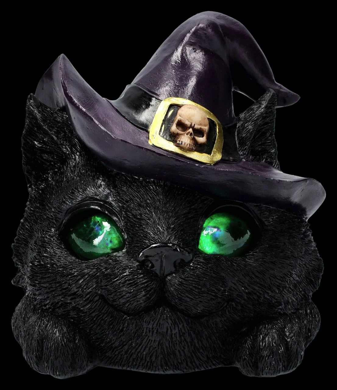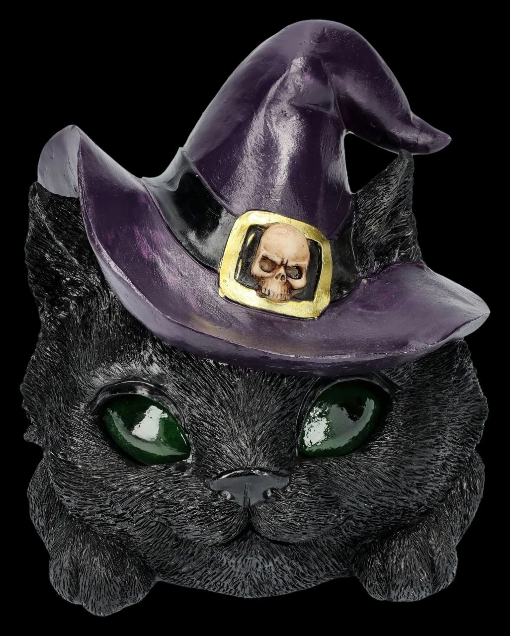 Nicht nur der Hexenhut mit dem Schädel-Emblem zeigt, wem die schwarze Katze gehört. Auch die grün leuchtenden Augen in der Dunkelheit beweisen, dass es der Kopf einer Hexenkatze ist, der hier so harmlos liegt. Die 14 cm hohe, 13 cm breite und 14 cm tiefe Figur mit dem Hexenkatzen-Kopf ist aus handbemaltem Kunststein (Polyresin). Durch die batteriebetriebene LED-Beleuchtung mit Farbwechsler wirken die Augen sehr mystisch. Für die LED-Beleuchtung werden 2 x AA Batterien benötigt, die jedoch nicht in der Lieferung enthalten sind. Familiar Grin, die Figur mit dem Hexenkatzen-Kopf, ist vor allem an Halloween eine perfekte Deko.