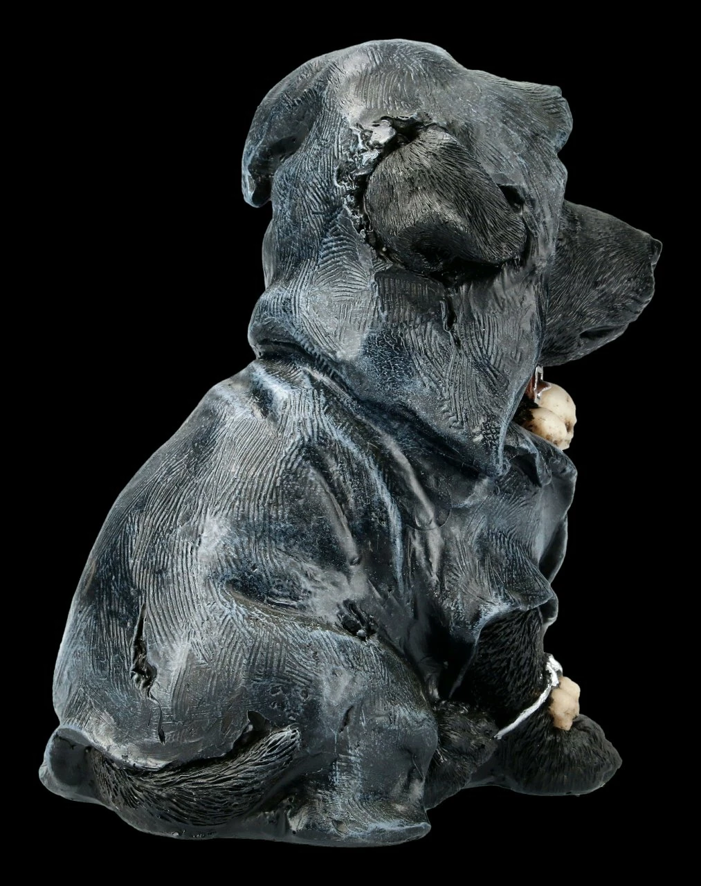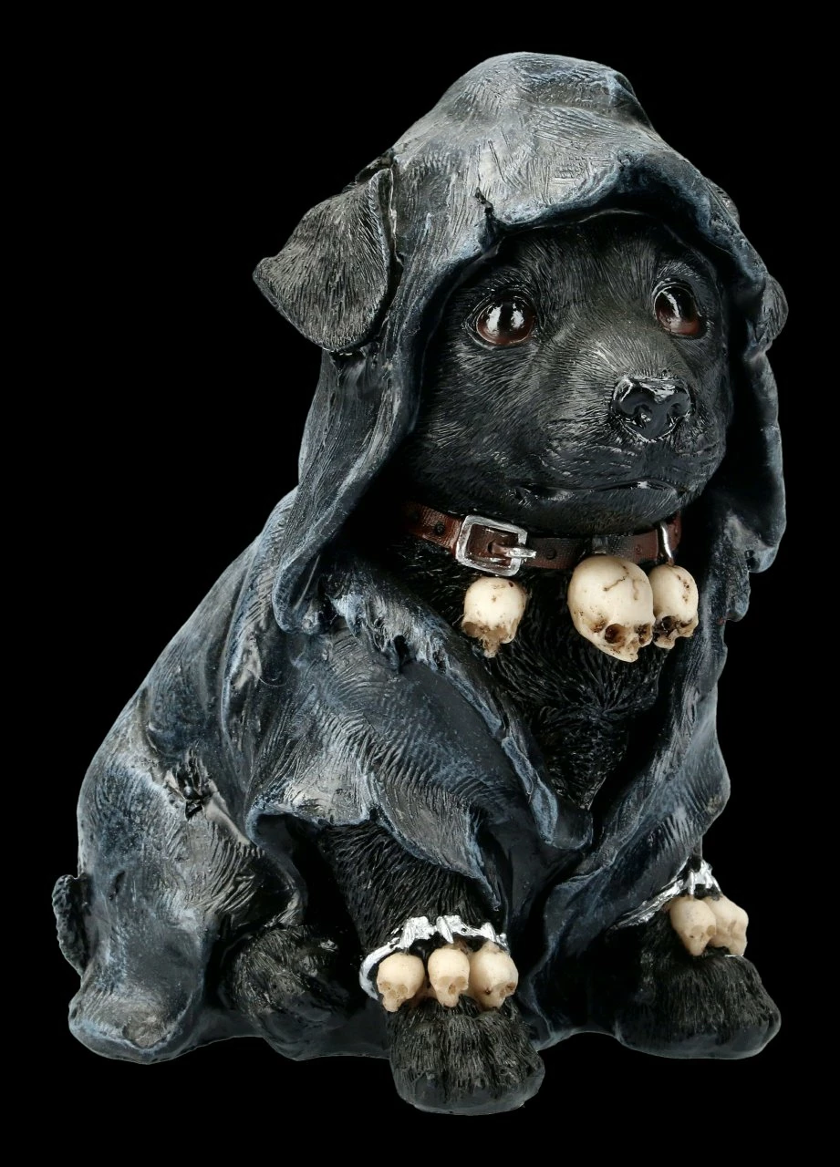 Das ist wohl eine seltene Rasse – der Canine Reaper Hund. Der süße Hund hat am Halsband kleine Totenschädel als Schmuck hängen. Mit großen Augen schaut er jeden an und möchte vermutlich gestreichelt werden. Der niedliche Hund ‚Canine Reaper ist liebevoll aus handbemaltem Kunststein (Polyresin) gefertigt und 17 cm hoch, 11 cm breit und 15 cm tief. Über diesen lustigen Hund in der Reaper Kutte als Geschenk freuen sich sicher nicht nur Hundefreunde.