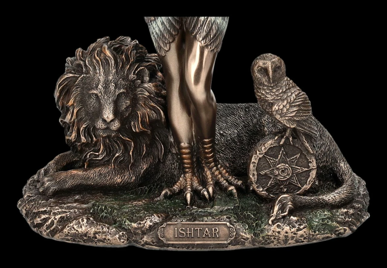 Mit großen Flügeln, mit Vogelkrallen statt Füßen und bekleidet lediglich mit einem Federschurz steht die wunderschöne, verführerische sumerische Liebesgöttin Ishtar da. Um ihren Hals windet sich eine Schlange und zu ihren Füßen liegt ein Löwe. Eine Eule als Zeichen der Weisheit sitzt auf einem Rad mit dem achteckigen Stern, der den hellsten Stern am Himmel, die Venus, darstellt. Ishtar oder auch Inanna, die Sternengöttin der Sumerer wurde als äußerst vielseitige Göttin verehrt. Sie war nicht nur die verführerische Göttin der Liebe und der Fruchtbarkeit, sie war auch die wehrhafte Stadtgöttin und Beschützerin von Babylon. Die wunderschöne und detailreiche Ishtar-Figur von Veronese ist 22 cm hoch, 14,5 cm breit und 9 cm tief. Sie wurde aus edel bronziertem und sehr fein coloriertem Kunststein (Polyresin) gefertigt. Die effektvolle Skulptur der Göttin der Liebe und der Macht ist äußerst dekorativ und ein wunderbares Geschenk.