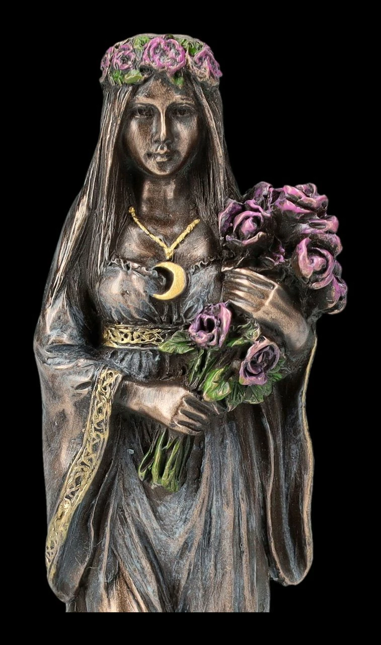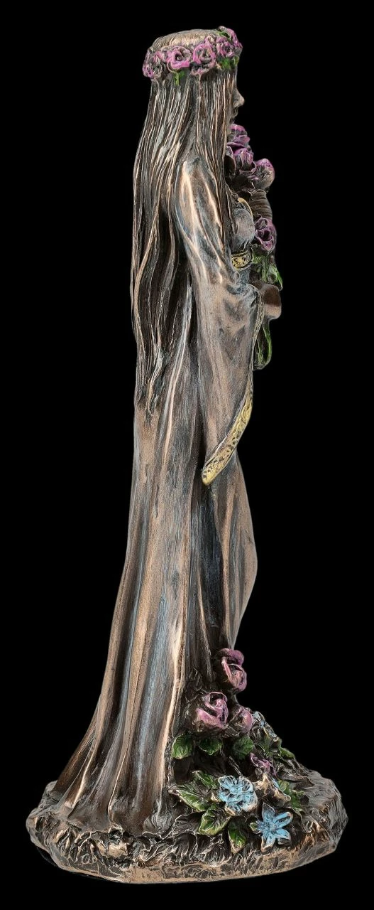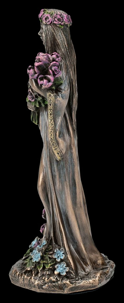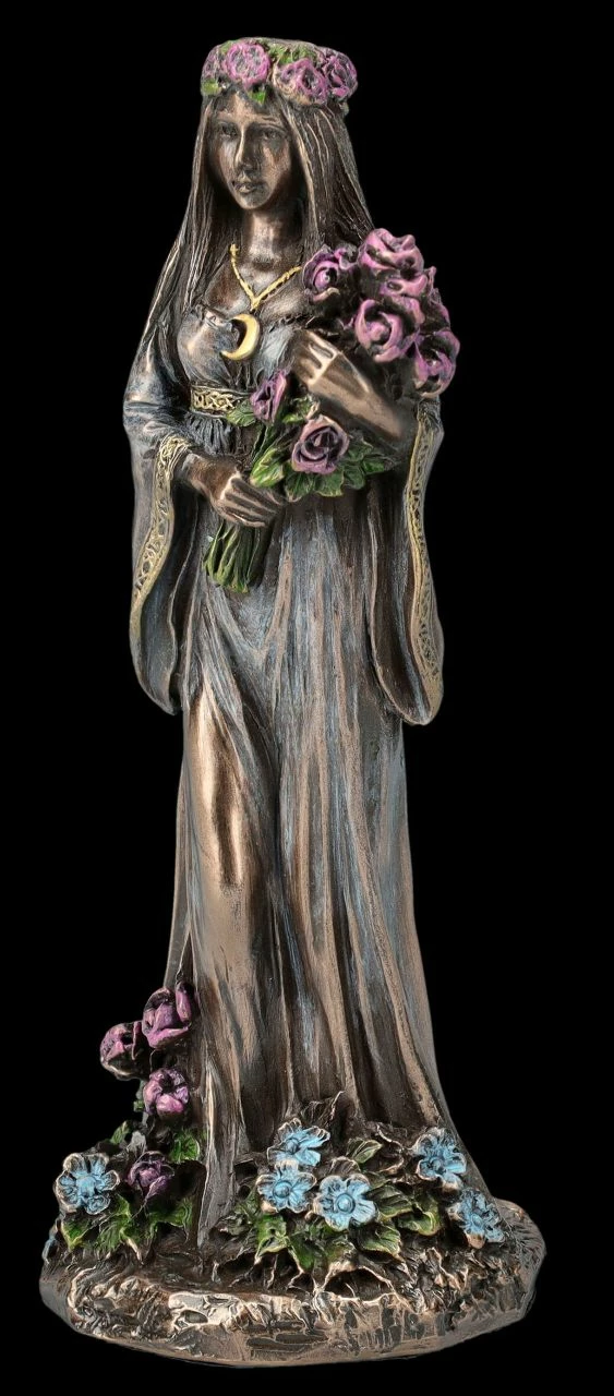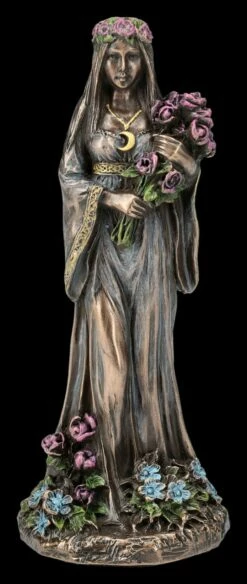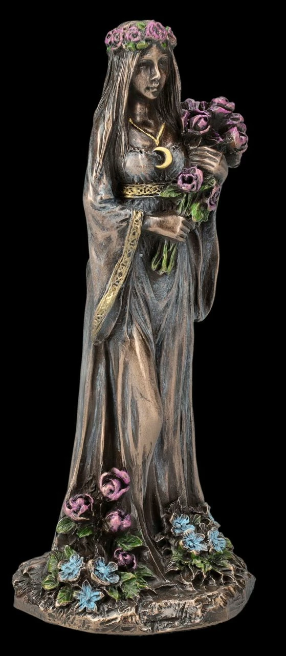 Seit der Antike ist die Verehrung der Dreifachen Göttin, als Göttin der Magie, der Zauberkraft und der Wandlung bekannt. Die Keltische Dreifaltigkeitsgöttin wurde z.B. im alten Griechenland als Hekate verehrt. Die Dreifaltigkeitsgöttin repräsentiert auch die Mondphasen und dieses mächtige Symbol wird sie ständig begleiten. Dabei stellt der zunehmende Mond die Jungfrau dar, wie bei dieser zauberhaften kleinen Figur aus der Studio Collection von Veronese. Die schöne 10 cm hohe, 4 cm breite und 4 cm tiefe Figur der Keltischen Dreifaltigkeitsgöttin aus bronziertem und wunderbar coloriertem Kunststein (Polyresin) zeigt sie im zarten Kleid mit einem Blumenkranz im Haar, einem Blumenstrauß in den Armen und von Blumen umgeben als junge Frau. Als Schmuck trägt sie die Mondsichel des zunehmenden Mondes. Bei allen Ritualen, die mit der Weiblichkeit oder auch mit dem Mond zu tun haben, wird diese bezaubernde kleine Jungfrau-Figur – sicher gemeinsam mit der Figur der Mutter und der alten weisen Frau aus unserem Shop – siehe auch Bestell-Nummer FS26078 und FS26079 – jeden Altar wunderbar schmücken. Auch kann mit den anderen beiden Figuren der Keltischen Dreifaltigkeitsgöttin ein magisches Diorama gestaltet werden.