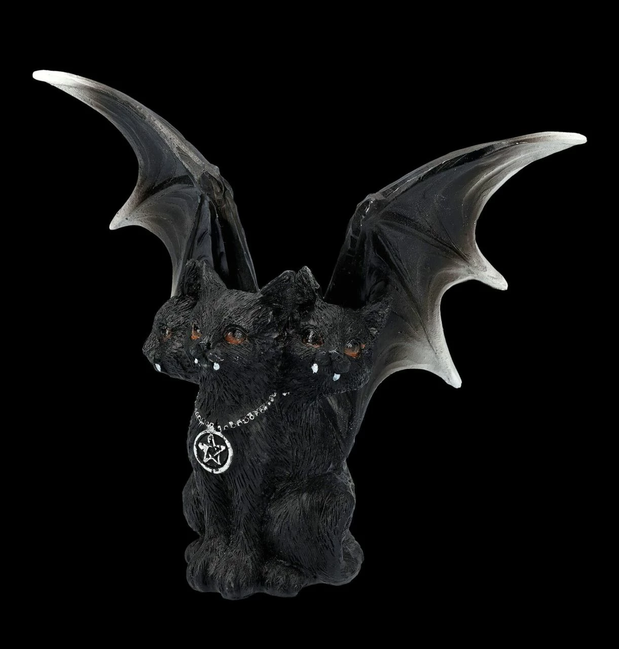Vampir – dreiköpfiger Höllenhund – Hexenkatze? Da konnte sich anscheinend jemand nicht entscheiden. Die schwarze Hexenkatze als dreiköpfiger Vampir ist ja nicht ganz so gruselig, sondern eher sehr fantasievoll, auch wenn sie noch so versucht, böse drein zu schauen. Immerhin trägt sie ein Pentagramm als Schutzsymbol um den Hals gehängt. Die Katzen Figur mit den drei Köpfen, den großen Fledermausflügeln und den Vampirzähnen ist 13 cm hoch, 15,5 cm breit und 6 cm tief. Sie wurde aus handbemaltem Kunststein (Polyresin) gefertigt.