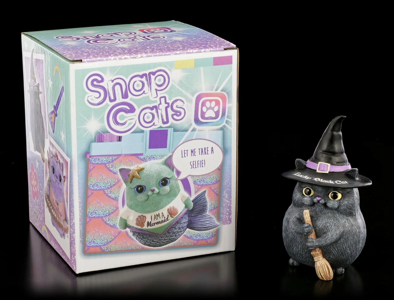 Dieser schwarzen Snapcat Katze kann doch niemand widerstehen, oder? Die niedliche kleine Katze trägt einen Hexenhut und hält passend dazu einen Hexenbesen in ihren Pfoten. Sie liebt es Selfies zu machen und sie über die sozialen Medien mit ihren Freunden zu teilen. Die süße Katze hat noch viele niedliche Brüder und Schwestern, ein guter Grund zum Sammeln anzufangen. Sie wurde aus liebevoll handbemaltem Kunststein (Polyresin) gefertigt und stammt aus der Serie: Snapcats Collection. Sie muss doch jeder Sammler einfach alle haben!