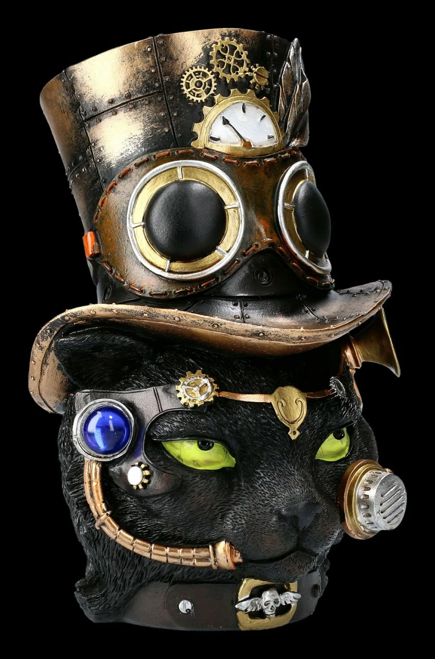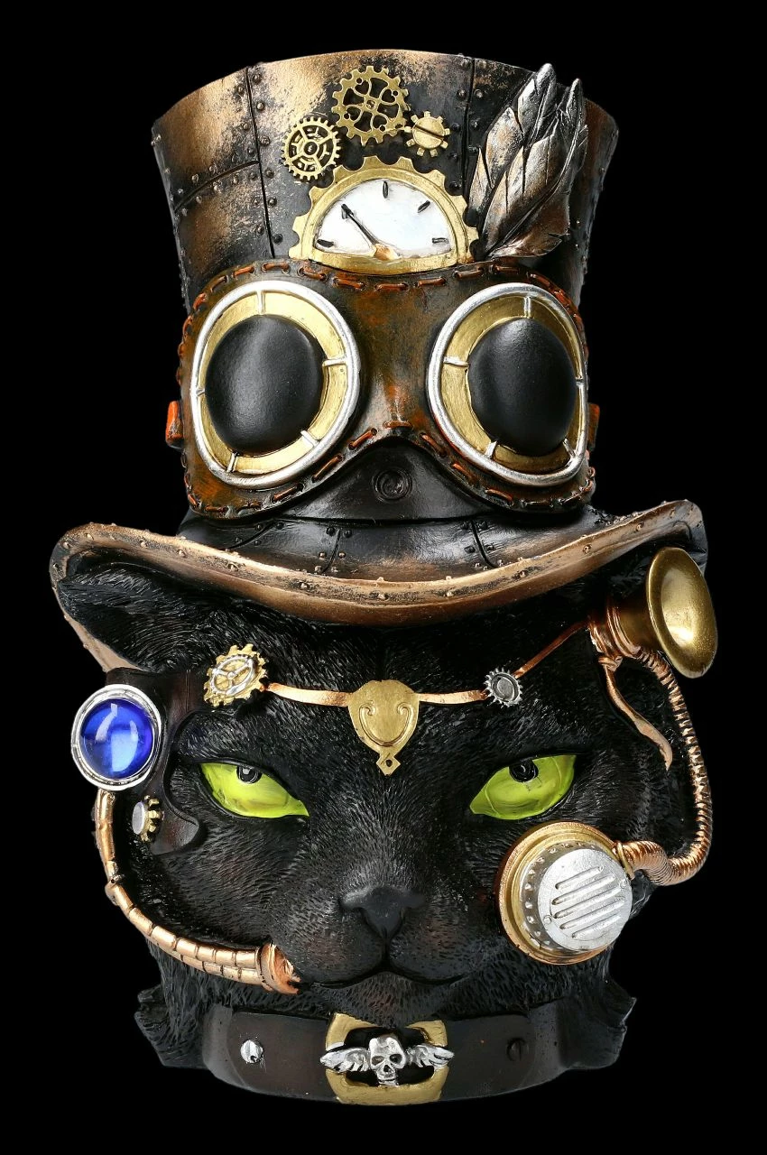 Diese Figur wird jeden begeistern. Vorsicht! Ein magischer Blick aus hypnotisch grünen Augen trifft Sie, wenn Sie diese außergewöhniche Steampunk Büste des Felius Mogg betrachten. Die schwarze Steampunk Katze mit Hut ist faszinierend detailreich aus von Hand bemaltem Kunststein (Polyresin) gefertigt. Die vielen technischen Details der 21 cm hohen, 16 cm breiten und 15 cm tiefen Steampunk Büste wirken wie aus Metall gefertigt. Felius Mogg ist nicht nur für Steampunk Fans, sondern auch für Katzenfreunde ein ganz besonders ausgefallenes Geschenk.