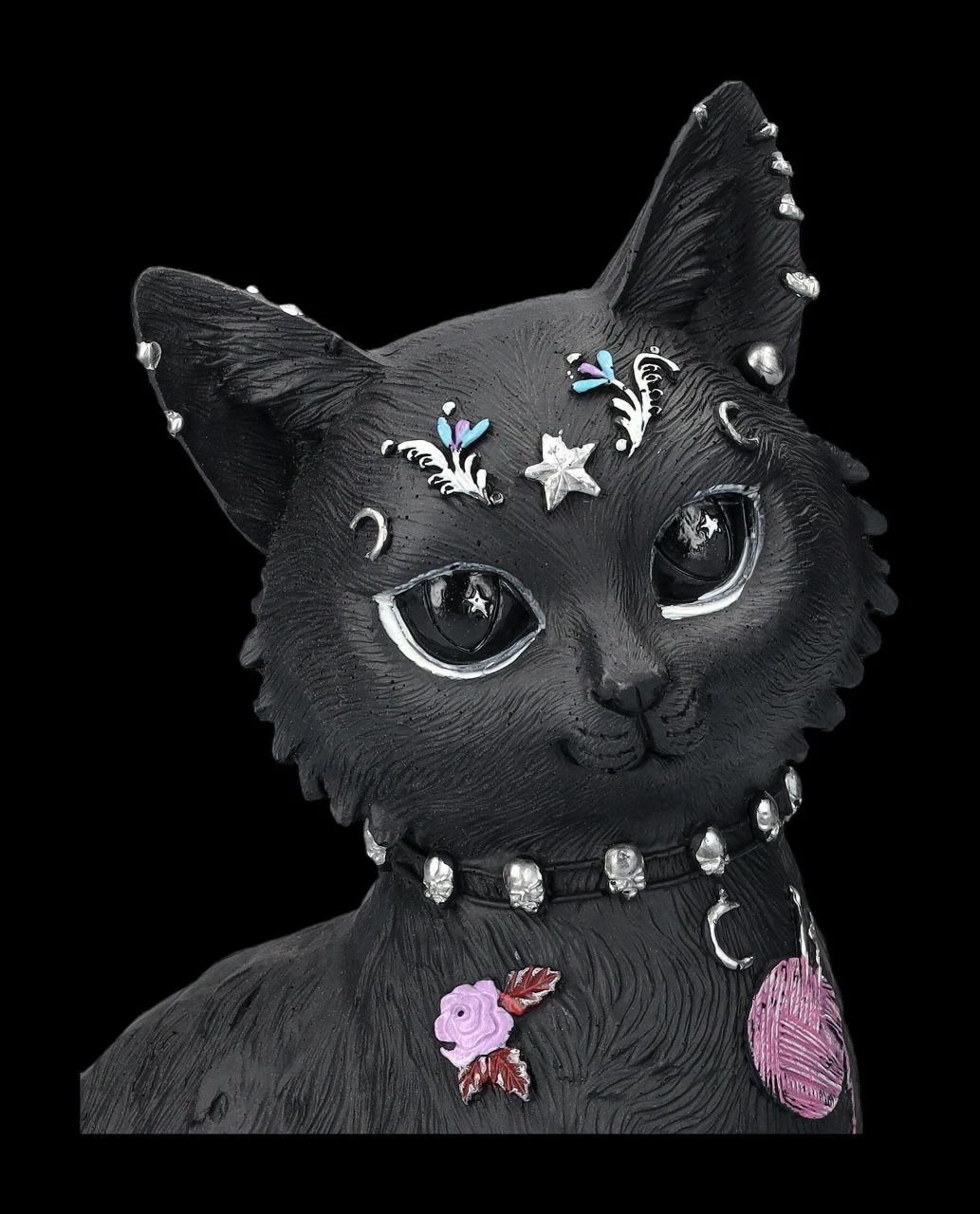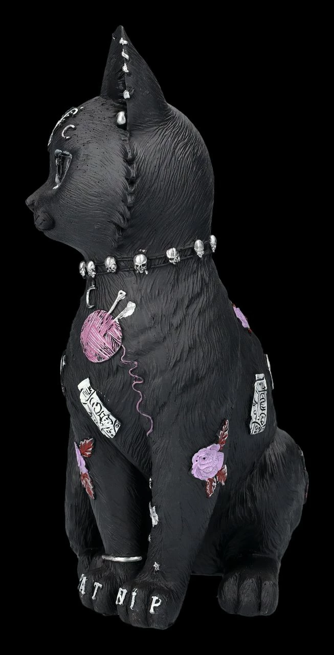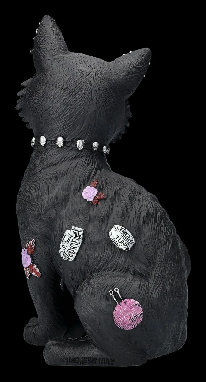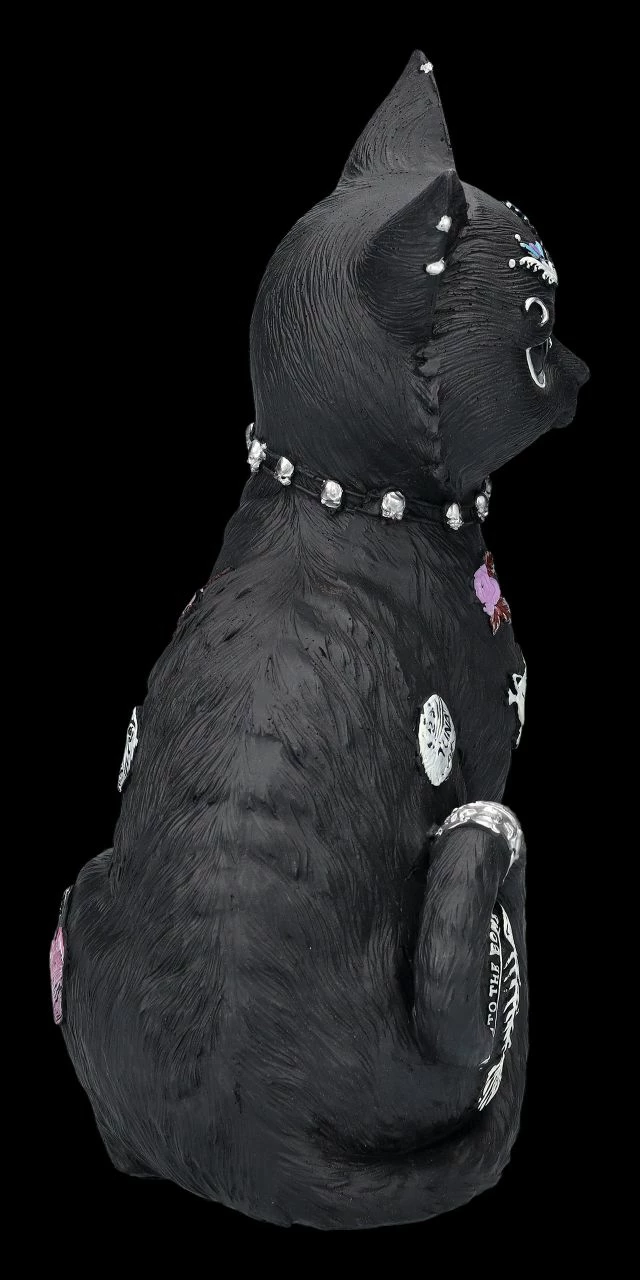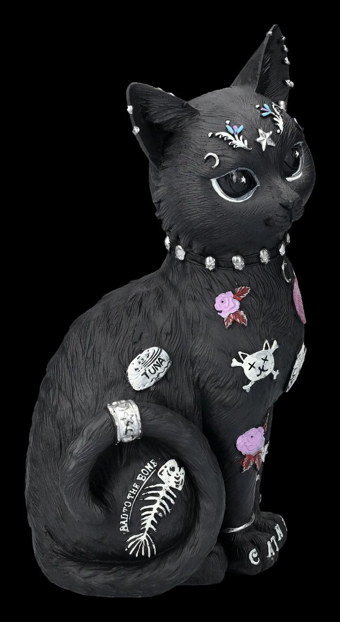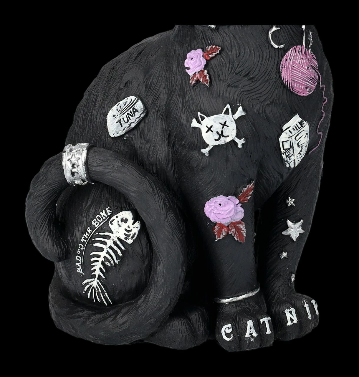 Auf den Krallen zeigt die schwarze Katze das Tattoo ‚Cat Nip‘, vielleicht um zu zeigen, dass sie alles damit zwicken oder fangen kann. Da soll man sich auch von dem unschuldigen Augenaufschlag nicht täuschen lassen. Oder hat der Schriftzug ‚Bad to the Bone‘ auf dem Tattoo über dem skelettierten Fisch eine größere Bedeutung? Wie es scheint, hat die magische schwarze Katze mit den Tattoos eine Vorliebe für Fisch. Die Katzenfigur mit den Tattoos ist 22,5 cm hoch, 11,5 cm breit und 9 cm tief. Sie wurde aus detailreich handbemaltem Kunststein (Polyresin) gefertigt und ist nicht nur für alle Hexen und Magier ein witziges Geschenk.