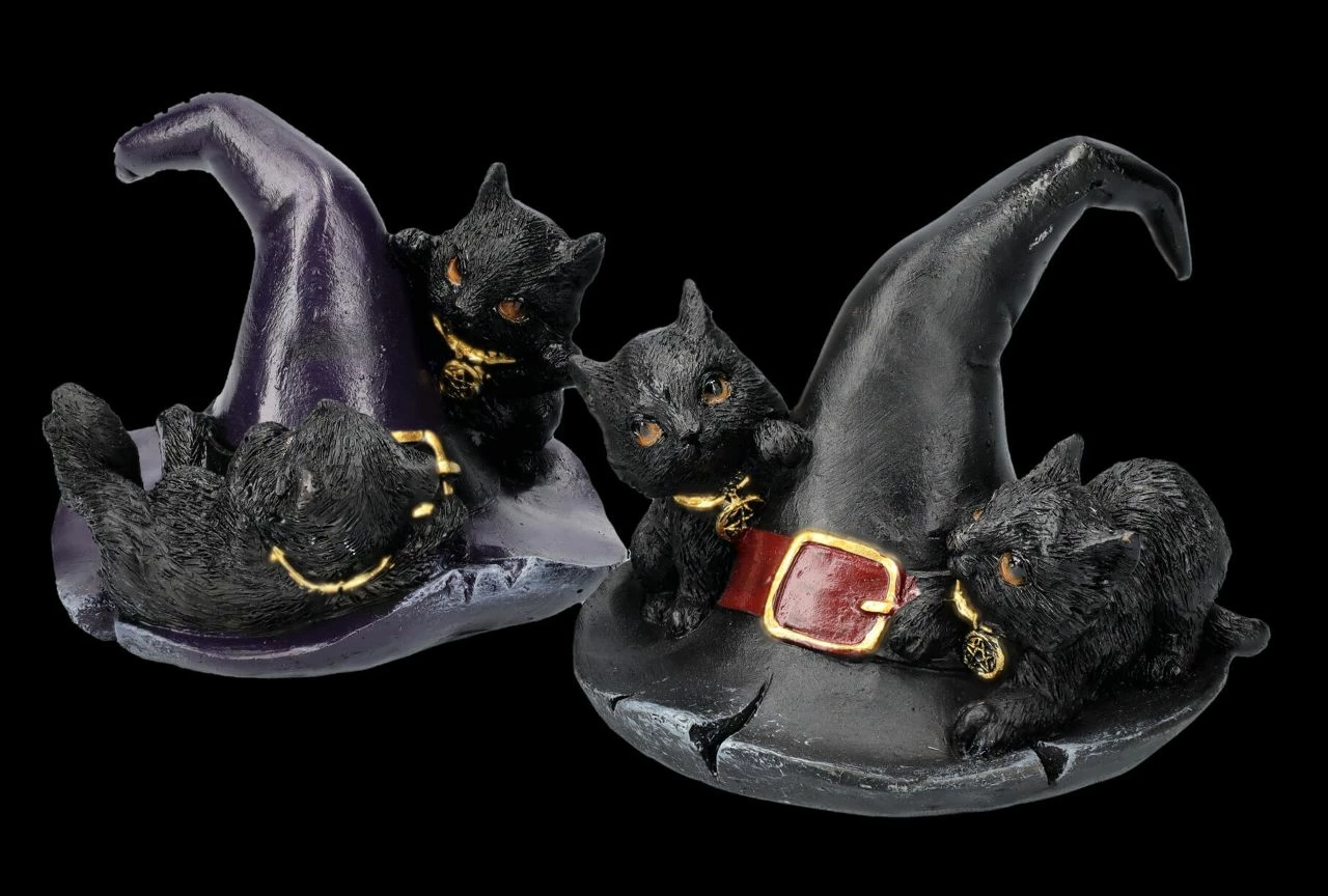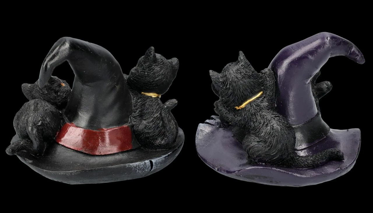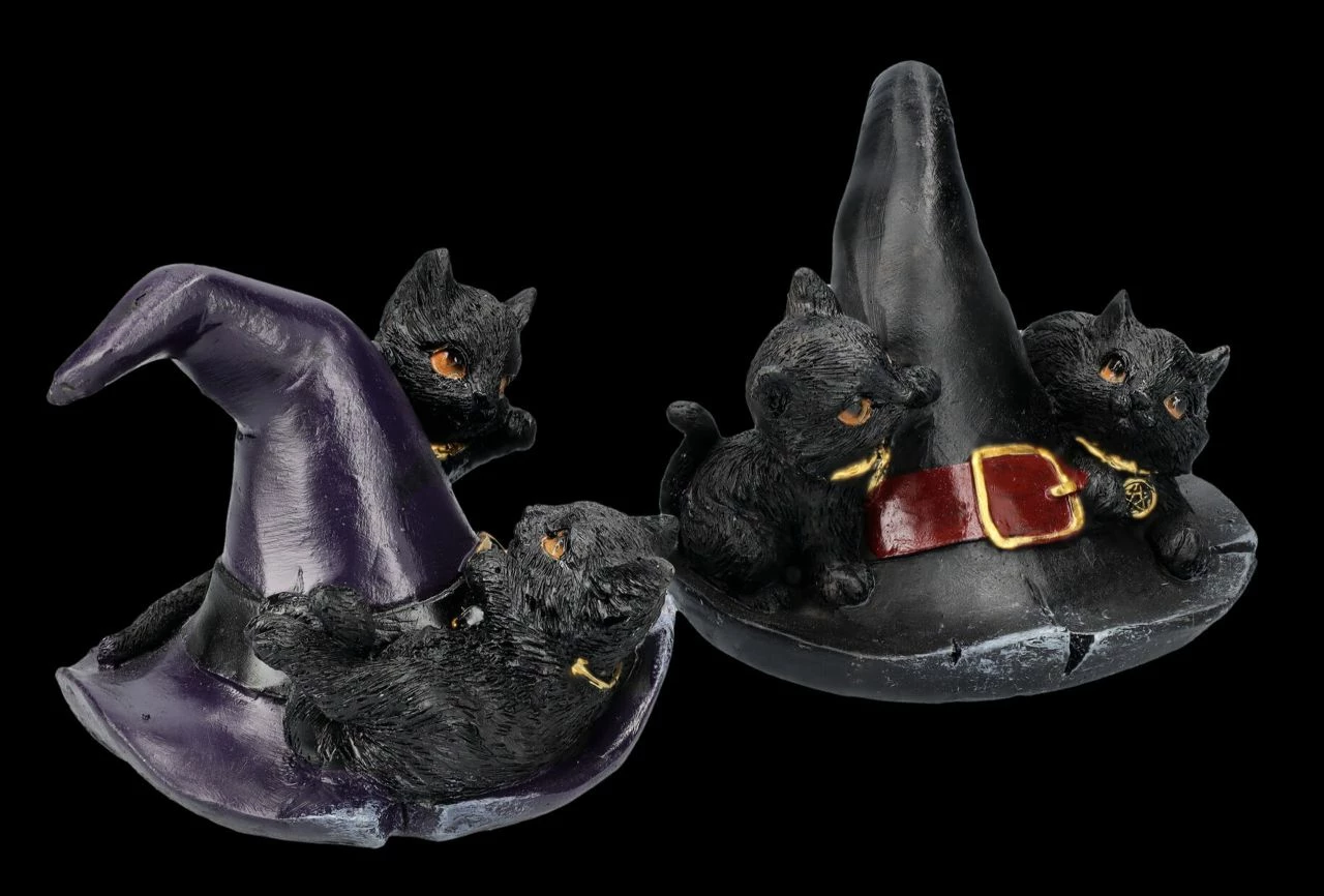 Ob das die Hexen wohl gerne sehen, wenn der Katzennachwuchs ihre Hüte zum Spielen nehmen? Aber die gute Gelegenheit können sich die Katzenkinder natürlich nicht entgehen lassen. Die lustigen schwarzen Katzenfiguren auf den Hexenhüten sind aus liebevoll handbemaltem Kunststein (Polyresin) und kommen im 2-er Set. Sie sind je 8 cm hoch, je 9,5 cm breit und je 9 cm tief und eine perfekte Deko an Halloween. Sie sind aber auch ein niedliches Geschenk, das man sogar mit seinen Freundinnen und Freunden teilen kann.