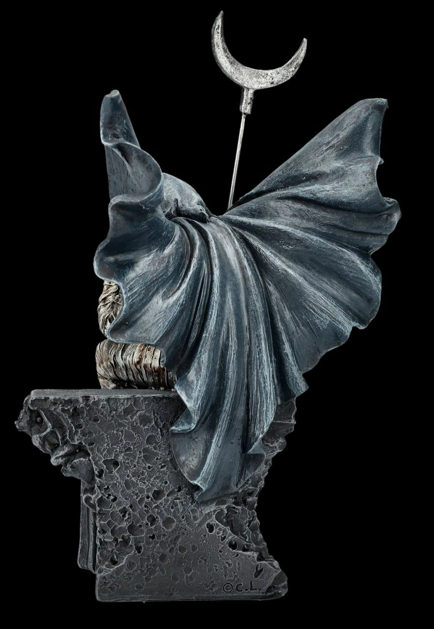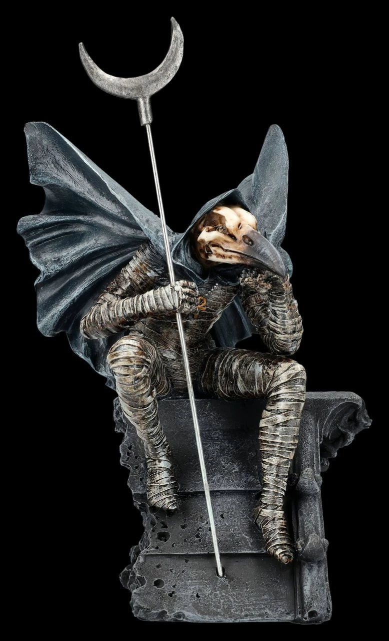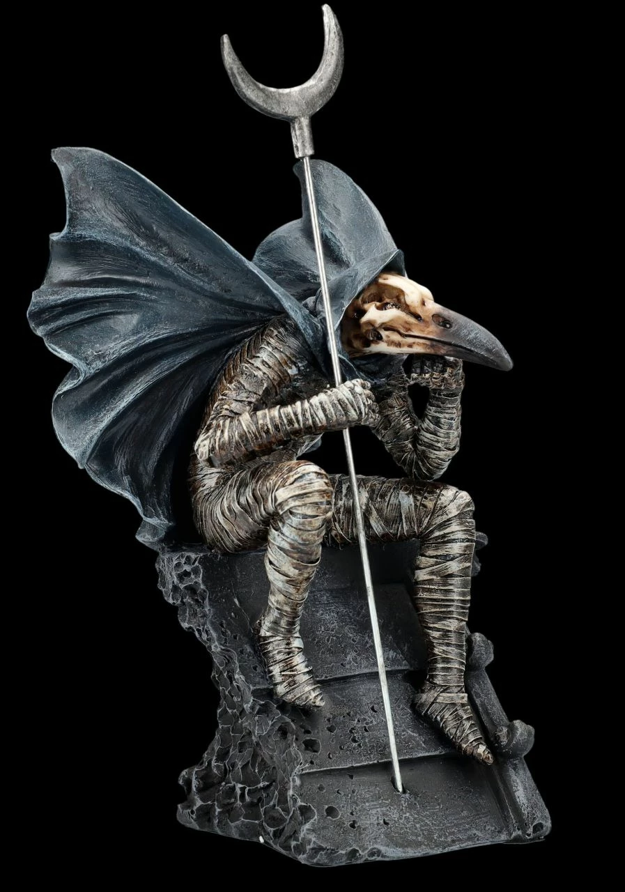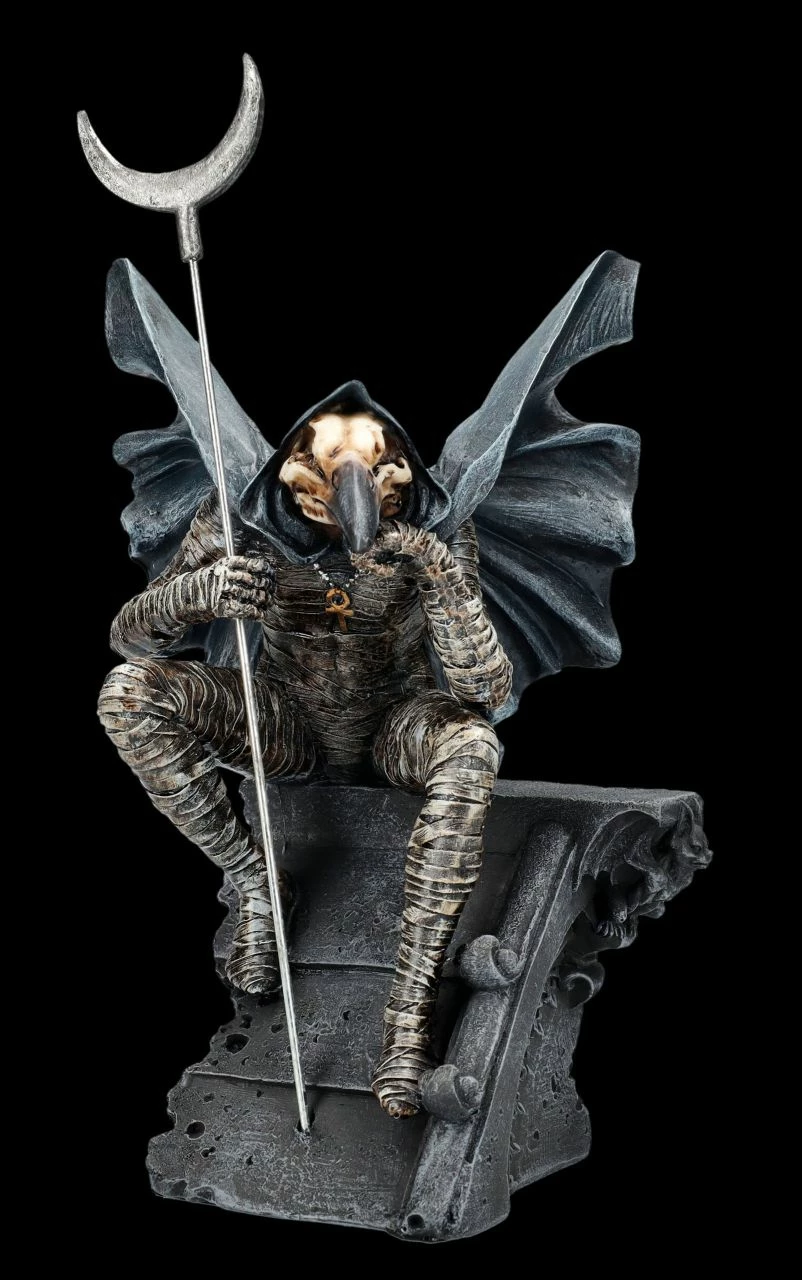 In Bandagen eingewickelt wie eine Mumie und mit einem Vogelschädel sitzt der Mondgott Khonshu aus der altägyptischen Mythologie mit wehendem Kapuzenumhang lässig auf einem Felsen. In der Hand hält er einen Stab, an dessen Spitze eine nach oben gerichtete Mondsichel steht. Der Stab ist zum Stecken. Khonshu war in der Mythologie Ägyptens der Sohn des Sonnengottes Amun und der Himmelsgöttin Mut. Er galt als Herr der Zeit, aber auch als Heilgott, dem auch das Wiederbeleben von Toten zugeschrieben wurde. Die eindrucksvolle Skulptur des Mondgottes Khonshu ist aus handbemaltem Kunststein (Polyresin) und 24,5 cm hoch, 15 cm breit und 11,5 cm tief. Das ist eine wahrlich effektvolle Skulptur, die überall zum sofortigen Blickfang wird und nicht nur für Sammler und an der Geschichte Ägyptens interessierte auch ein faszinierendes Geschenk ist.
