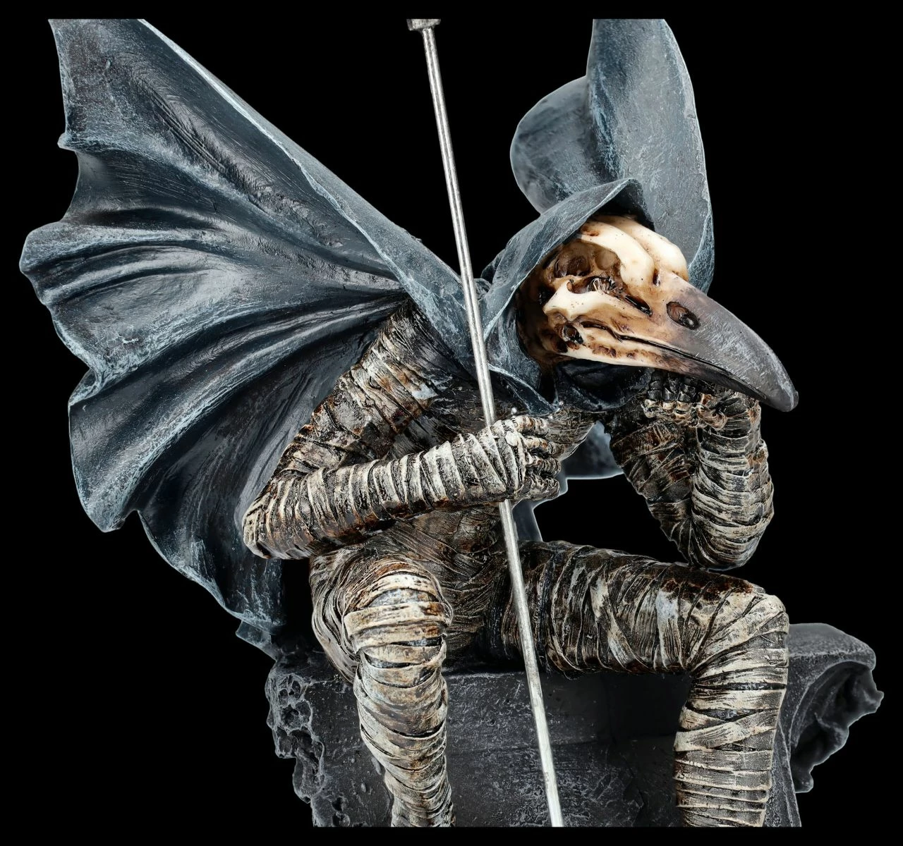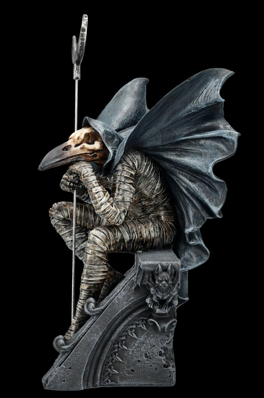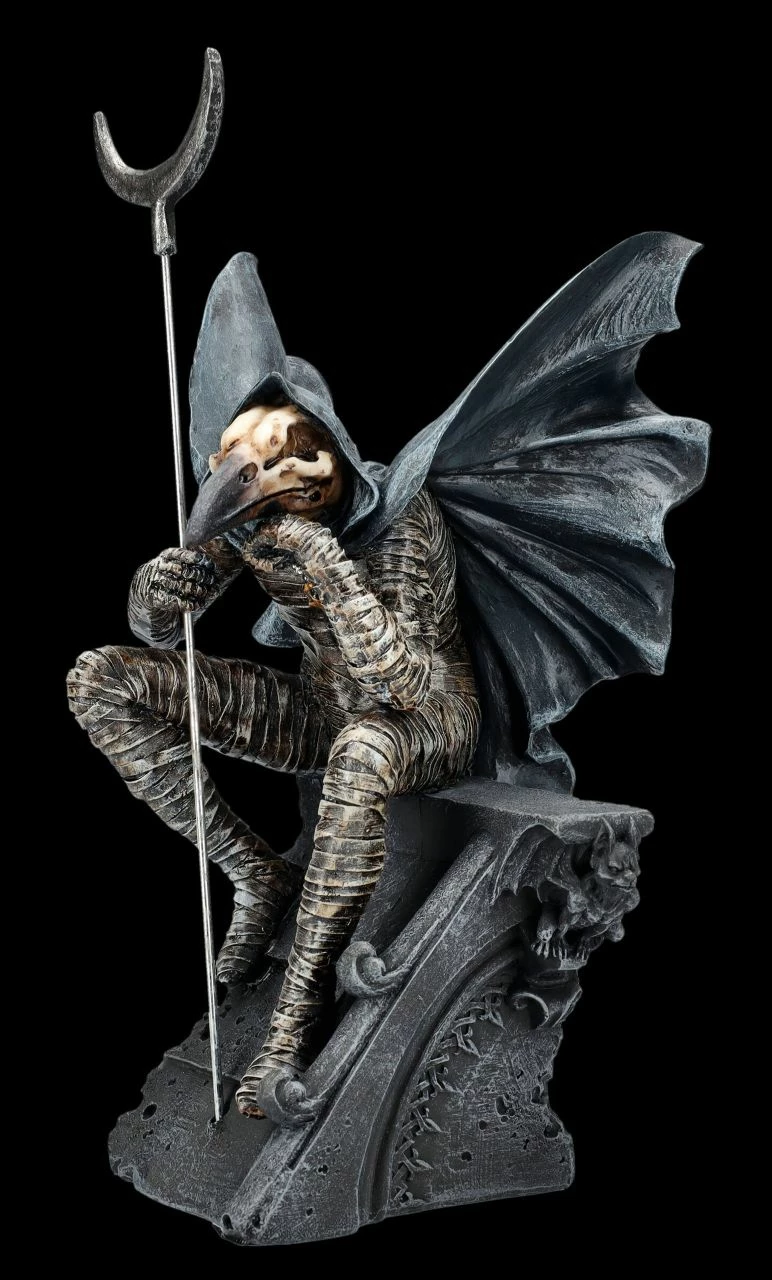 In Bandagen eingewickelt wie eine Mumie und mit einem Vogelschädel sitzt der Mondgott Khonshu aus der altägyptischen Mythologie mit wehendem Kapuzenumhang lässig auf einem Felsen. In der Hand hält er einen Stab, an dessen Spitze eine nach oben gerichtete Mondsichel steht. Der Stab ist zum Stecken. Khonshu war in der Mythologie Ägyptens der Sohn des Sonnengottes Amun und der Himmelsgöttin Mut. Er galt als Herr der Zeit, aber auch als Heilgott, dem auch das Wiederbeleben von Toten zugeschrieben wurde. Die eindrucksvolle Skulptur des Mondgottes Khonshu ist aus handbemaltem Kunststein (Polyresin) und 24,5 cm hoch, 15 cm breit und 11,5 cm tief. Das ist eine wahrlich effektvolle Skulptur, die überall zum sofortigen Blickfang wird und nicht nur für Sammler und an der Geschichte Ägyptens interessierte auch ein faszinierendes Geschenk ist.