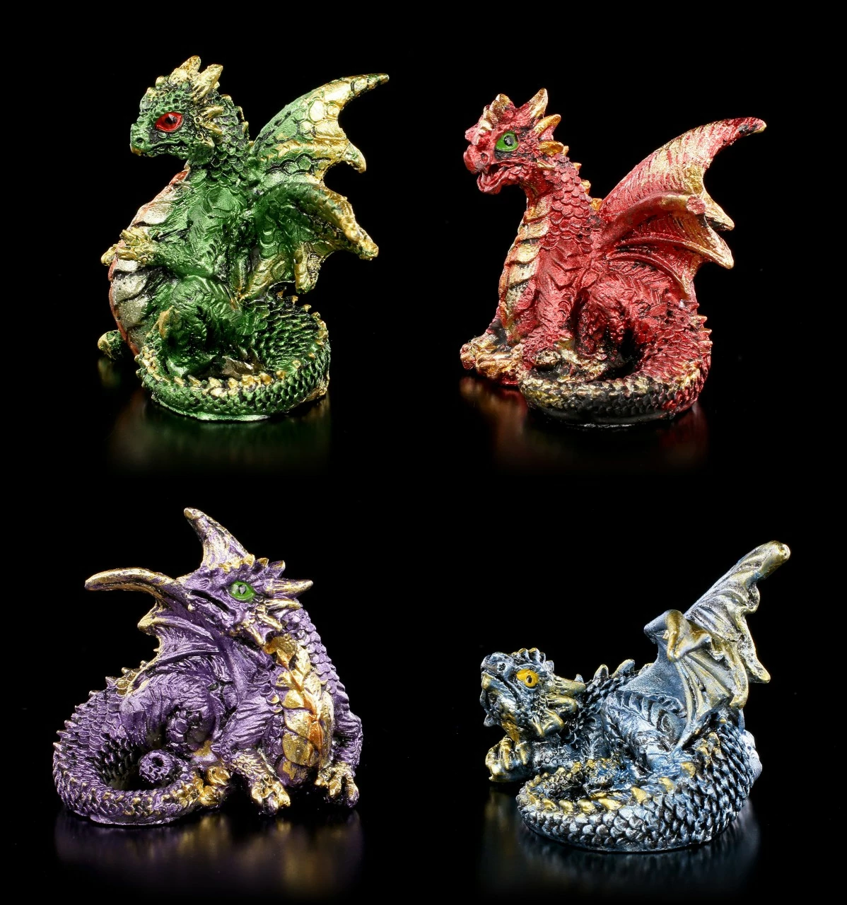 Diese 4 kleinen hübschen Drachen sehen so niedlich aus – das täuscht aber! Sie sind ständig auf Schabernack aus und überlegen sich ständig neue Streiche. Die vier Drachen wurden hervorragend ausgearbeitet und handbemalt. Ein schönes Geschenk an einen lieben Menschen.