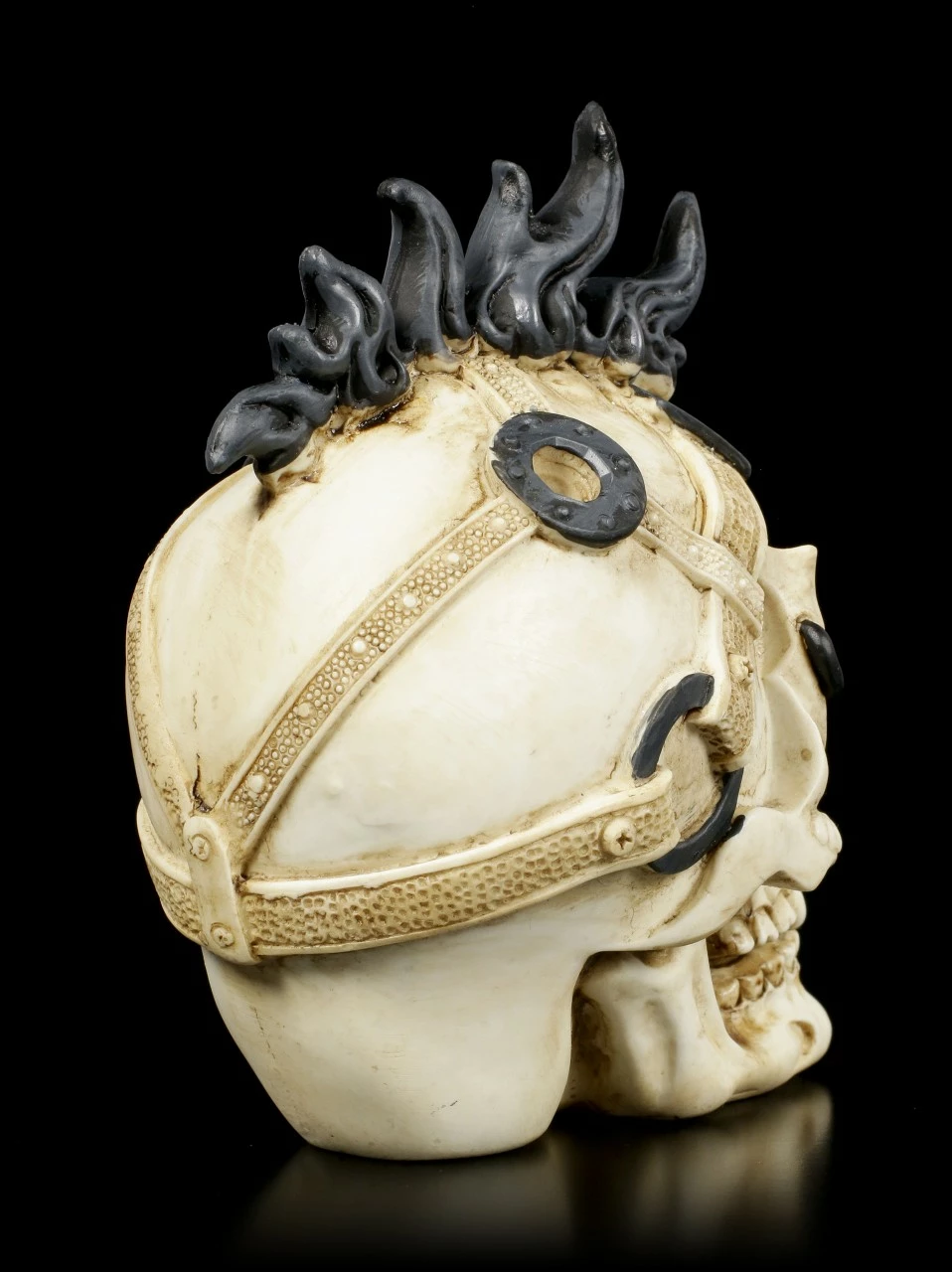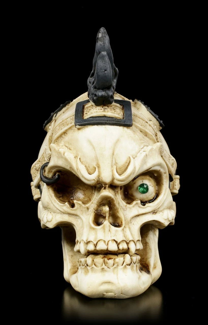 Der ausgefallene Dämonen Schädel mit schwarzem Flammen-Iro wird Sie begeistern. Der Totenkopf aus handbemaltem Kunststein (Polyresin) besticht durch seine vielen Details wie Schnallen, Piercings oder dem Schmuckstein im Auge. Vervollständigen Sie Ihre Sammlung mit diesem ausgefallenen Totenkopf.