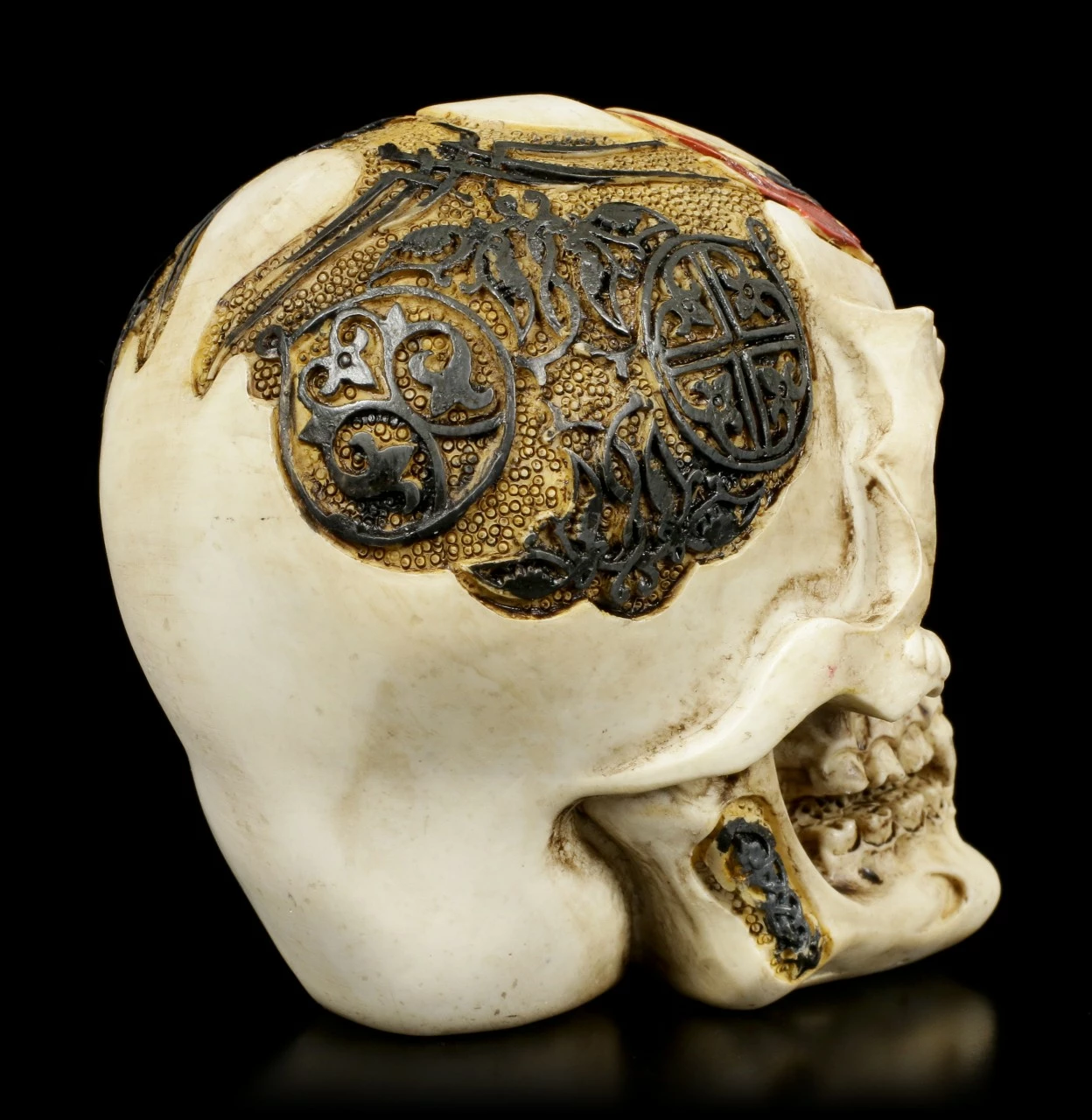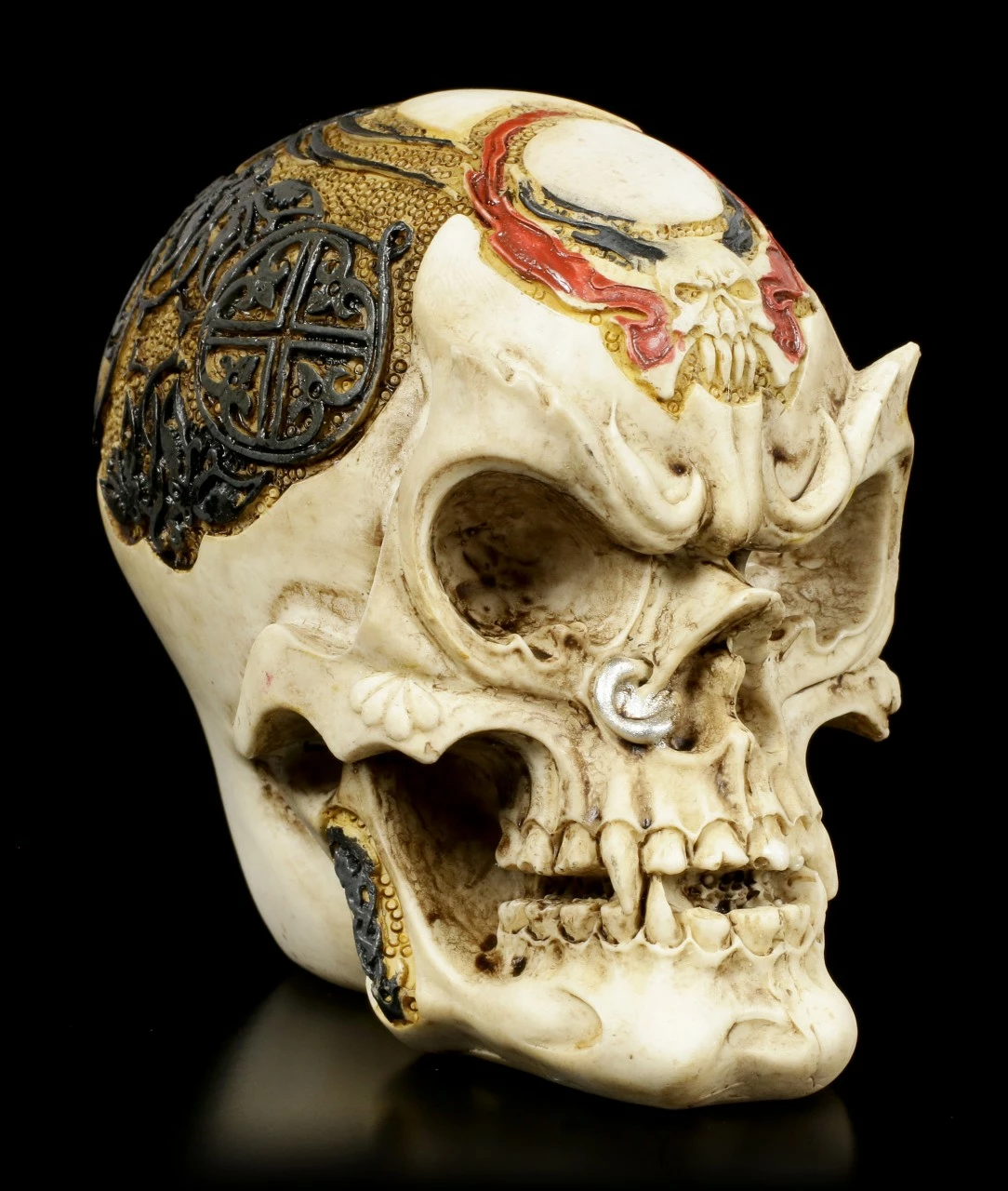 Der mit diversen Ornamenten und Symbolen verzierte Dämonenschädel ist zudem mit einem Nasenring verziert. Der außergewöhnliche und detailreiche Totenkopf aus Kunststein (Polyresin) ist liebevoll handbemalt und sollte bei keiner Halloween Deko fehlen.