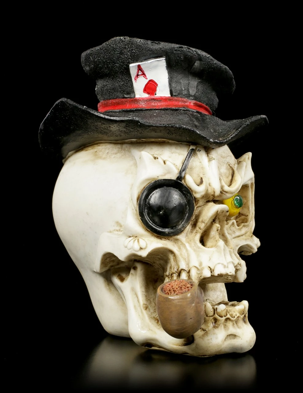 Der witzige Totenkopf im Stil eines Straßengauners ist einfach umwerfend! Sind Sie auch schon einmal auf einen Kartentrick reingefallen?! Der handbemalte Totenkopf aus Kunststein (Polyresin) mit dem leuchtend grünen Schmuckstein als Auge ist eine Hommage an alle Gauner auf den Straßen, die mit Witz und Verstand den Gutgläubigen das Geld aus den Taschen ziehen.