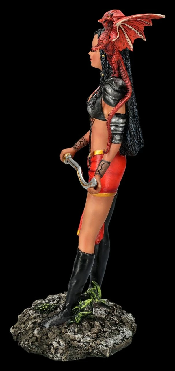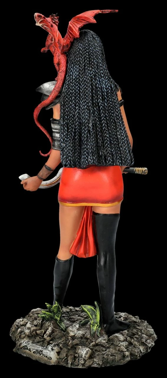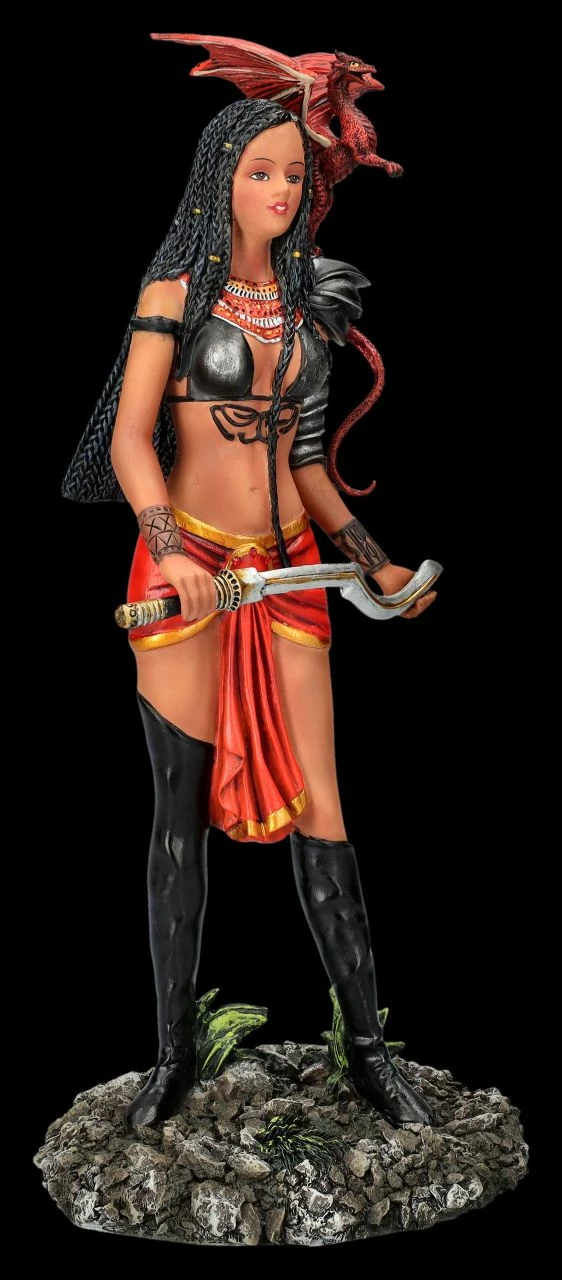 Der beliebten amerikanischen Fantasy-Künstlerin Nene Thomas aus Oklahoma City gelingt es immer wieder, ihren Elfen und Feen eine sinnliche Lebendigkeit einzuhauchen. Daher sind ihre magischen Wesen nicht nur bei Sammlern sehr begehrt. Mit ihren Darstellungen schafft sie es immer wieder, die Fantasie eines jeden anzuregen. Was bei dieser leicht bekleideten wunderschönen bewaffneten Kriegerin in Stil einer altägyptischen Rachegöttin auch kein Wunder ist. Stolz, feurig und wild steht sie bereit, ihren Platz in der Welt zu verteidigen. Der rote Feuerdrache auf ihrer Schulter richtet sich auf, und scheint sie freudig anzuspornen. Obwohl die starke Adaeze das gar nicht nötig hat. Das beeindruckende Kunstwerk von Nene Thomas ist bis zu den schwarzen Rastalocken und den gebräunten Hauttönen wunderbar detailreich aus liebevoll handbemaltem Kunststein (Polyresin) entstanden. Die 30,5 cm hohe, 14 cm breite und 13 cm tiefe Kriegerin Adaeze mit ihrem Drachen wird nicht nur Sammler begeistern. Sie ist auch ein prachtvolles Geschenk für Fantasy Fans, das einen perfekten Platz verdient.