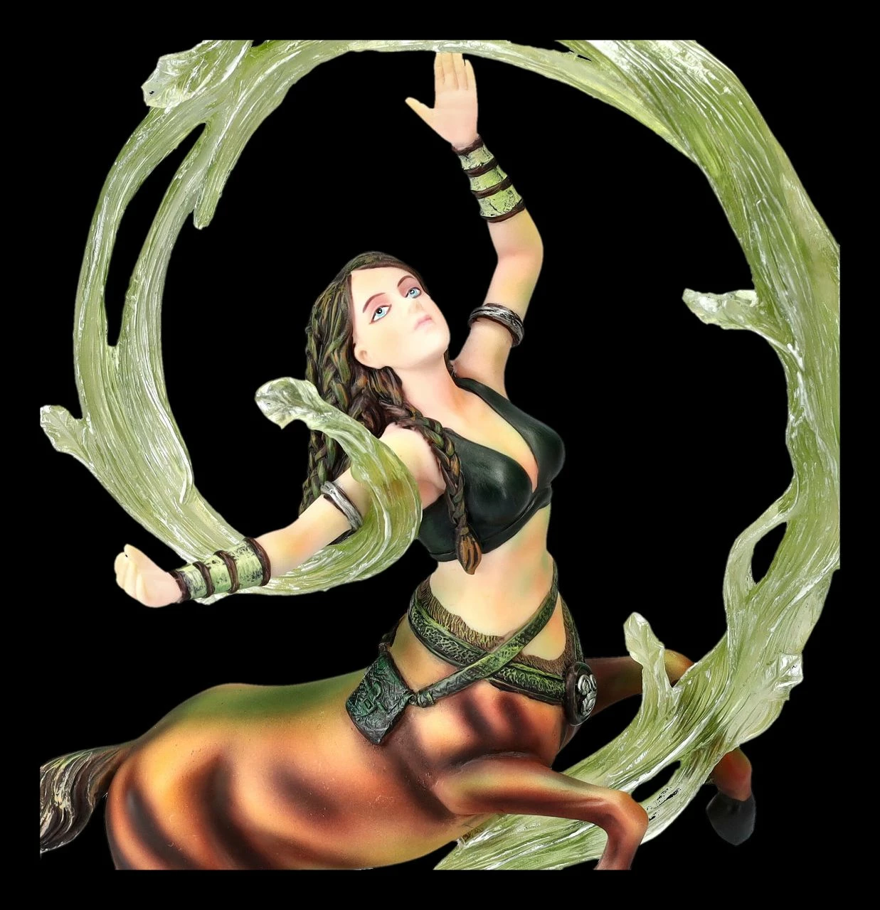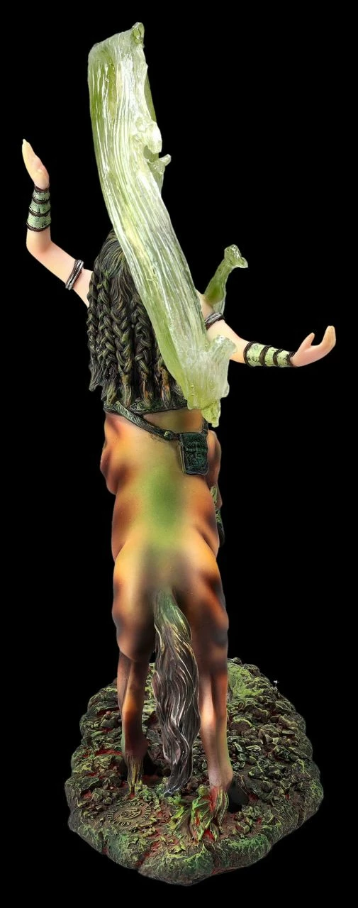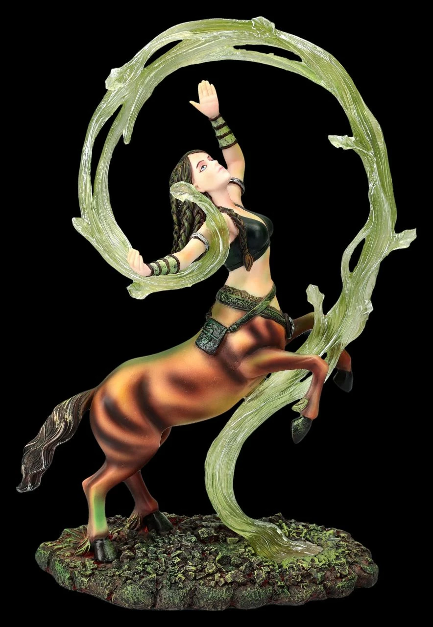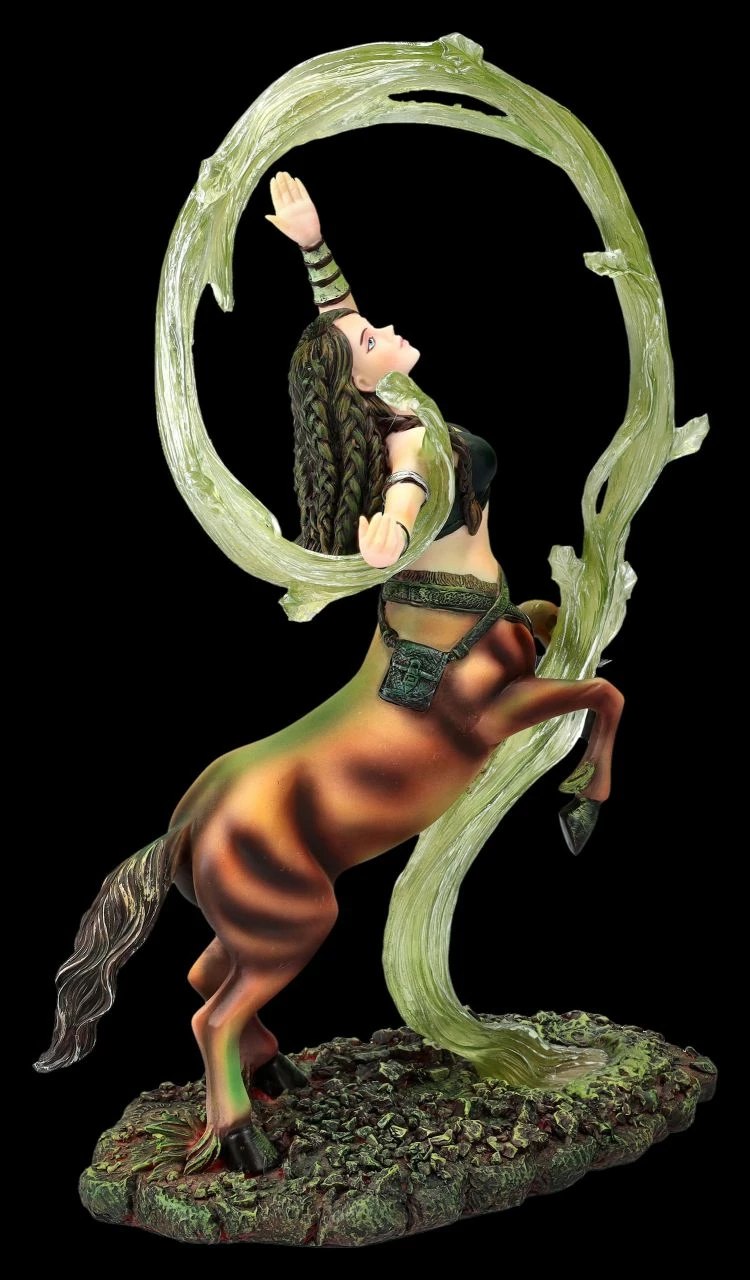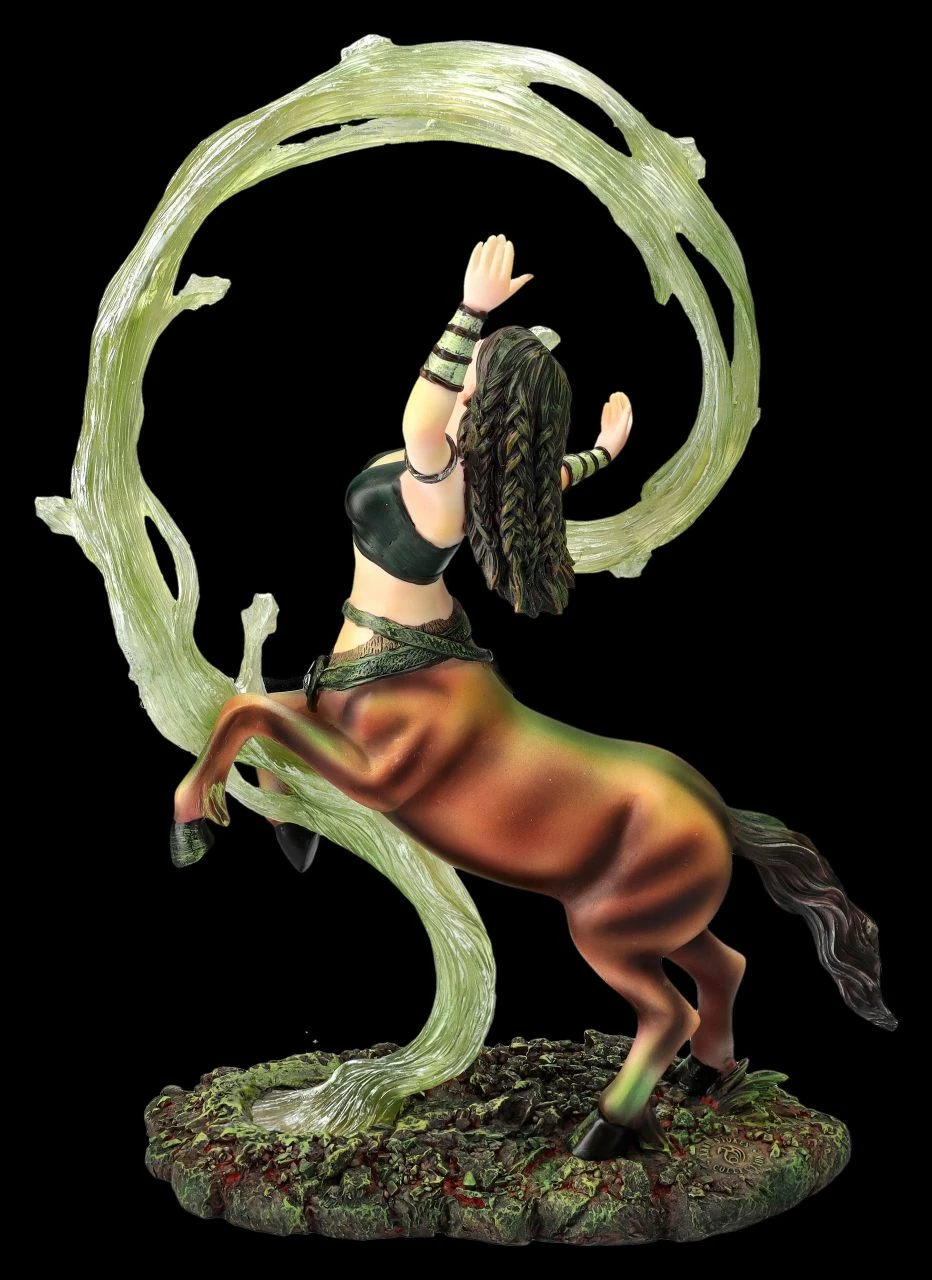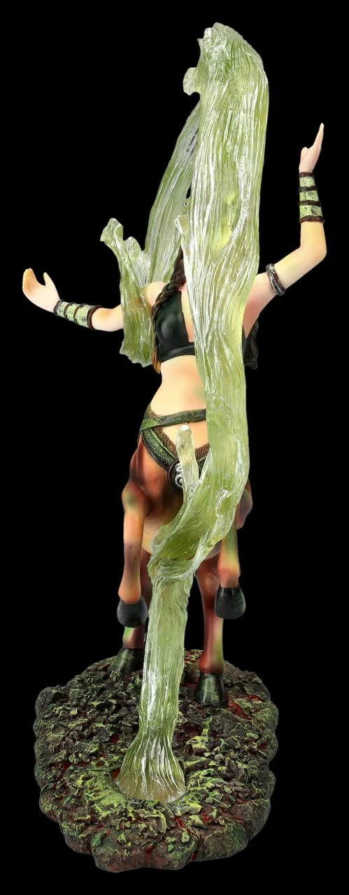 Meist werden Zentauren, die Mischwesen aus der griechischen Mythologie, halb als Pferd und halb als Mann dargestellt. Diese fantasievolle Magierin zeigt jedoch, dass alles auch anders sein kann. Wie in der Zirkusmanege wirbelt die Magierin mit dem knappen Oberteil gekonnt einen grünen Schleier. Um die Hüfte trägt sie einen Gürtel, in dessen Tasche sie vermutlich ihre magischen Kräuter bewahrt. Die fantastische, 26 cm hohe,18 cm breite und 9 cm tiefe Figur der Magierin ist wieder eine wunderbare Arbeit der berühmten Fantasykünstlerin Anne Stokes. Die Magierin, die für das Element Erde steht, wurde aus hochwertigem Kunststein (Polyresin) geschaffen und sorgfältig und detailreich von Hand bemalt. Dem Element Erde werden Menschen zugeordnet, die in den Sternzeichen Steinbock, Stier und Jungfrau geboren sind. Sie gelten eigentlich als beständig, tatkräftig, zuverlässig und bodenständig, auch wenn diese temperamentvolle Magierin anscheinend eine verborgene Seite zeigt. Diese ungewöhnliche Magierin von Anne Stokes ist auf jeden Fall ein Blickfang und ein fantastisches Geschenk. Sie kommt inklusive eines toll bedruckten Geschenkkartons.