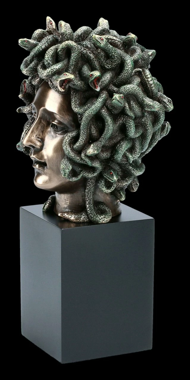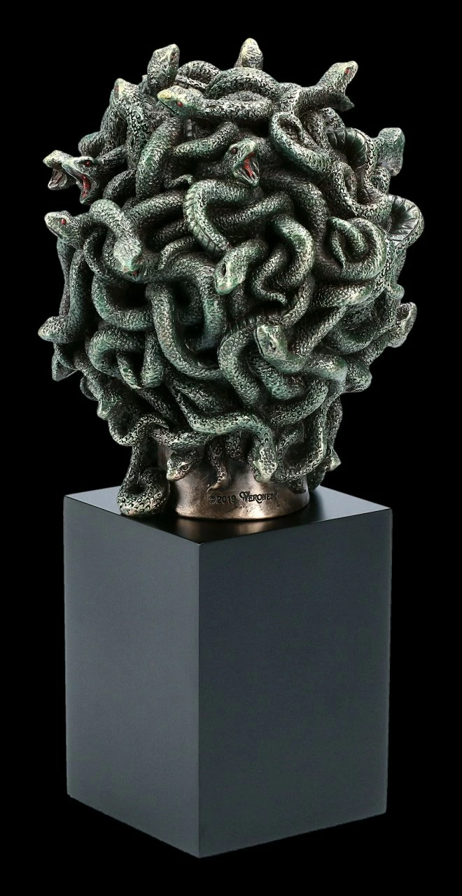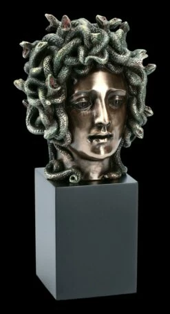 Wie ein aus einem Steinblock gemeißelter Monolith ragt der detailreiche Kopf der Medusa mit Schlangen-Haaren. Die Figur der Medusa ist bereits seit vorchristlicher Zeit bekann. Der Sage nach war Medusa ursprünglich eine betörende Schönheit, die von Pallas Athene aus Eifersucht in ein Ungeheuer mit Schlangenhaaren und heraushängender Zunge verwandelt wurde. Der Anblick ließ jeden der sie ansah zu Stein erstarren. Zahlreiche Künstler aller Epochen haben das Motiv aufgegriffen und selbst auf altgriechischen Münzen war der Kopf der Medusa abgebildet. Die bronzierte und sorgfältig colorierte Medusa von Veronese zeigt sie aber – eher wie eine Darstellung aus dem Jugendstil – als Schönheit mit detailreich dargestelltem Schlangenhaupt. Der aus Kunststein (Polyresin) gefertigte Monolith aus der Studio Collection von Veronese ist ca. 20 cm hoch, 10,5 cm breit und 9,5 cm tief und hat ein Gewicht von ca. 1,16 kg. Er ist ein sehr dekoratives Accessoire für jedes Büro und natürlich auch für den Wohnbereich.