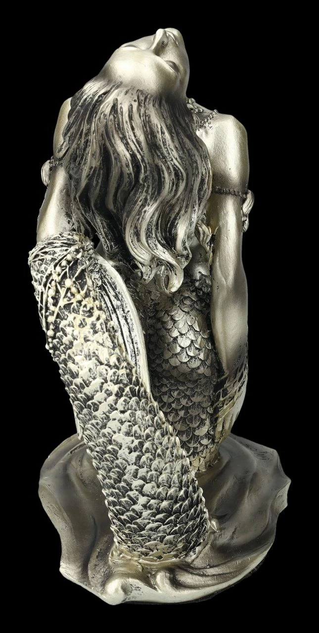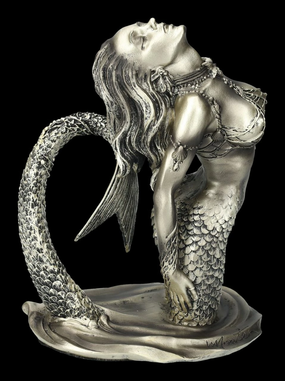 Vom amerikanischen Illustrator, Designer und Drehbuchautor Monte M. Moore stammt diese wunderschöne Meerjungfrau. In der griechischen Mythologie galten Sirenen, die als weibliche Mischwesen aus Mensch und Vogel und später auch als Mensch und Fisch dargestellt wurden, als sehr gefährlich. Durch ihren betörenden Gesang sollten sie die vorbei fahrenden Schiffe anlocken, um sie dann zu sich in die Tiefe zu reißen. So hatte sich einst Odysseus sogar die Ohren verstopft, um sich nicht von dem Gesang betören zu lassen. Hätte er aber diese wunderschöne sinnliche Sirene erblickt, wäre es trotzdem um ihn geschehen gewesen. Die herrliche Figur einer verführerischen Meerjungfrau wurde detailreich aus Kunststein (Polyresin) gefertigt und von Hand bemalt. Mit der Höhe von 19 cm, der Breite von 10 cm und der Tiefe von 14,5 cm wird sie zum absoluten Blickfang auf einem Schreibtisch oder Sideboard. Sie ist aber auch ein fantastisches Geschenk für jeden, der das Schöne liebt.