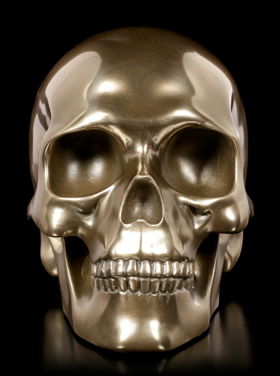 Der bronzierte menschliche Totenkopf sollte in keiner stylischen Wohnung fehlen. Die glatte Oberfläche und das klare Design des bronzierten Schädels aus Kunststein (Polyresin) ist einfach umwerfend. Der Totenkopf ist z.B. auch ein perfektes Geschenk für einen Tätowierer.