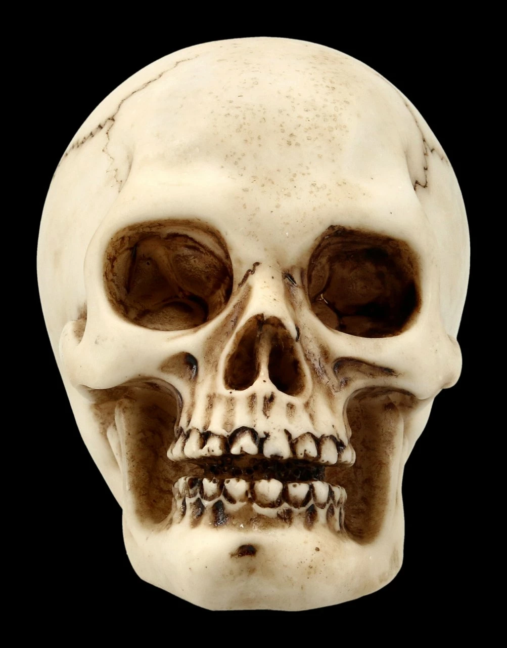 Aus Kunststein (Polyresin) hergestellt und sehr realistisch in Knochenfarben handbemalt ist dieser kleine Totenkopf mit Unterkiefer- Er hat eine Höhe von 7 cm, eine Breite von 5,5 cm und eine Tiefe von 8 cm. Der kleine Deko-Totenkopf mit Kiefer lässt sich gut dekorieren und ist ein witziger Blickfang im Regal, auf dem Schreibisch oder auch auf einem Sideboard.