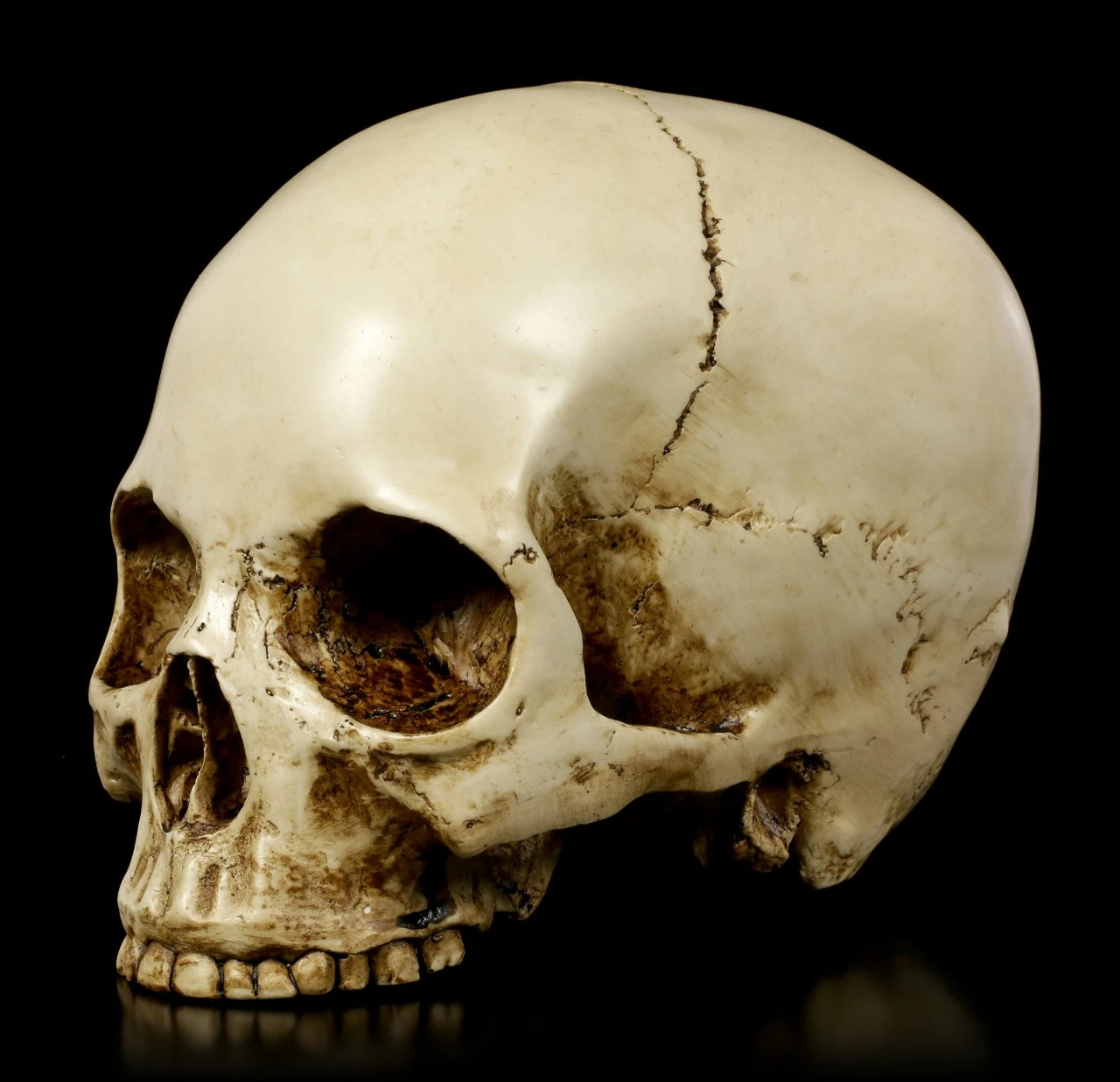 Der handbemalte Totenkopf ohne Unterkiefer aus Kunststein (Polyresin) ist einfach umwerfend! Nicht nur Fans des Makabren wird der Schädel begeistern, auch für eine Mottoparty oder für ein Larp Event ist er wunderbar geeignet. Die Schädelnähte, die Zähne und viele weitere Details sind wunderbar ausgearbeitet.