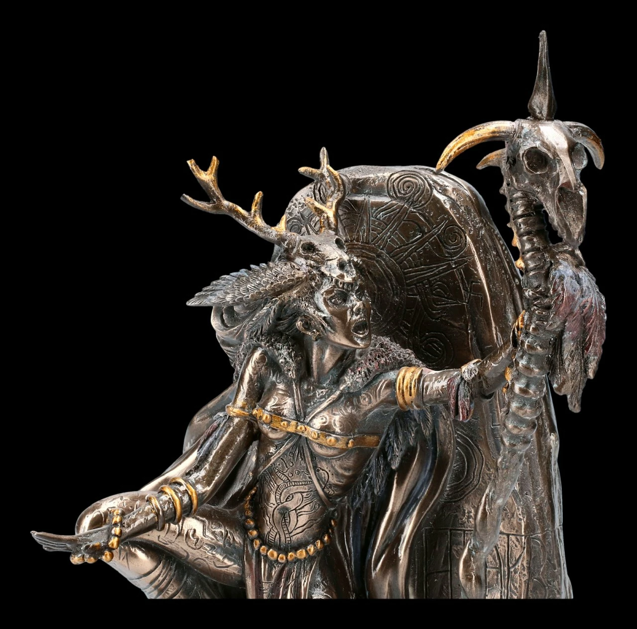 Die Figur Moran le Fay von Derek W Frost besticht durch die vielen kleinen und hervorragend ausgearbeiteten Details. Die Figur wurde aus hochwertigem Kunststein gegossen und anschließend bonziert und koloriert. So wirde die Figur garantiert zu dem Blickpunkt einer Sammlung. Morgan le Fay war die Halbschwester von König Artus. Sie gilt als Heilerin und auch als ernstzunehmende Gegnerin von Artus.
