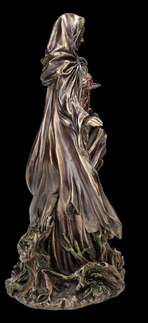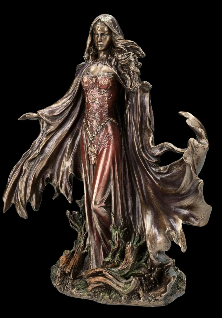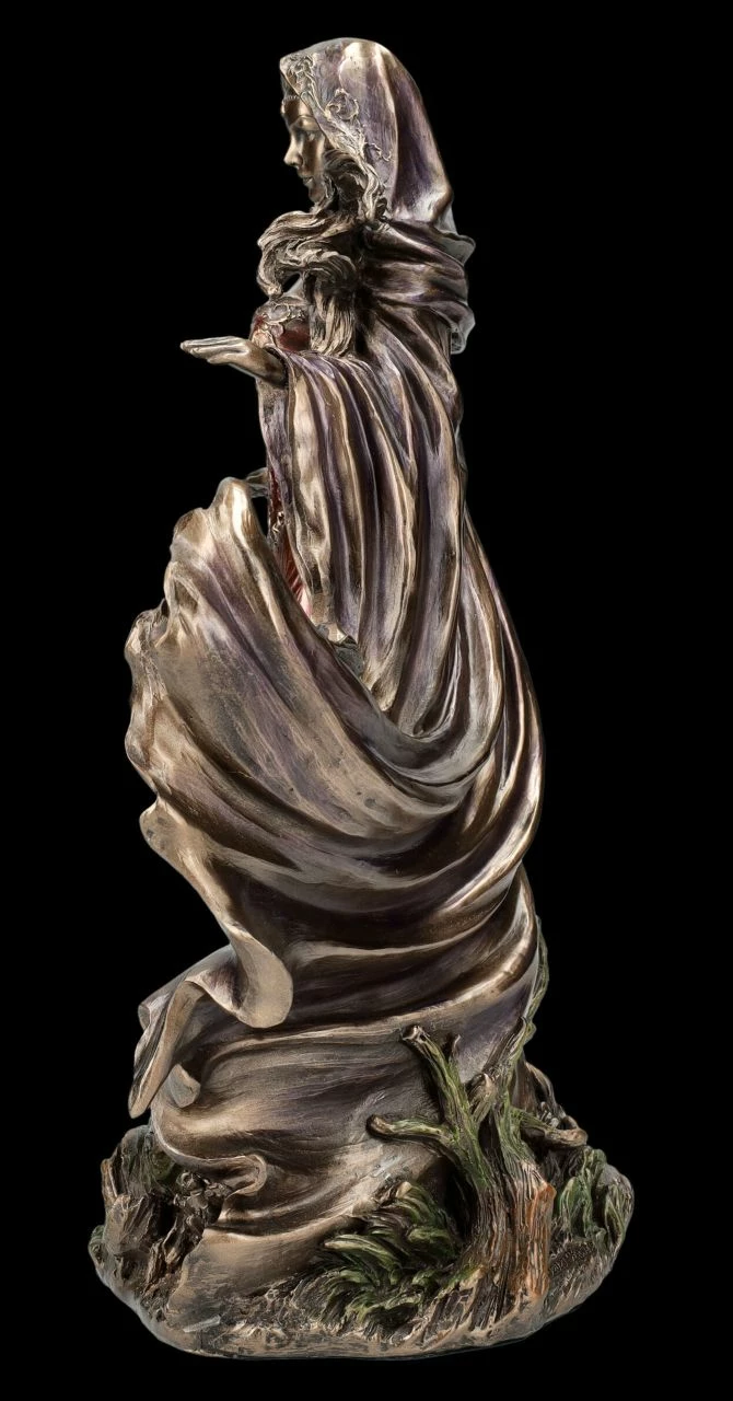 Dem bekannten amerikanischen Designer und Illustrator Monte Michael Moore ist mit der für Veronese entworfenen wunderschönen Skulptur der mächtigsten Zauberin Morgana ein wahres Kunstwerk gelungen. Morgana, die große und mächtige Zauberin aus der Mythologie um König Artus scheint auf einer vom Sturm umwehten Insel zu stehen. Ihre langen Haare und der große Umhang werden vom Wind hochgewirbelt. Das lange, rötlich colorierte Kleid wirkt beinahe wie aus zarter durchsichtiger Seide. Bis zu dem feinen Gesichtsausdruck ist die wunderschöne Skulptur sehr detailreich aus edel bronziertem und sehr zurückhaltend und zart coloriertem Kunststein (Polyresin) gefertigt. Die wunderschöne Morgana Figur aus der Serie ‚The Triumphs of Humanity‘ von Veronese ist ein wahrlich effektvoller Blickfang. Die raffiniert inszenierte Skulptur ist 28,5 cm hoch, 23 cm breit und 12,5 cm tief. Für Sammler und alle, die von der Artussage fasziniert sind, ist diese schöne Skulptur – vielleicht auch gleich mit der Figur des Zauberers Merlin von Monte M. Moore aus unserem Shop – ein perfektes Geschenk.