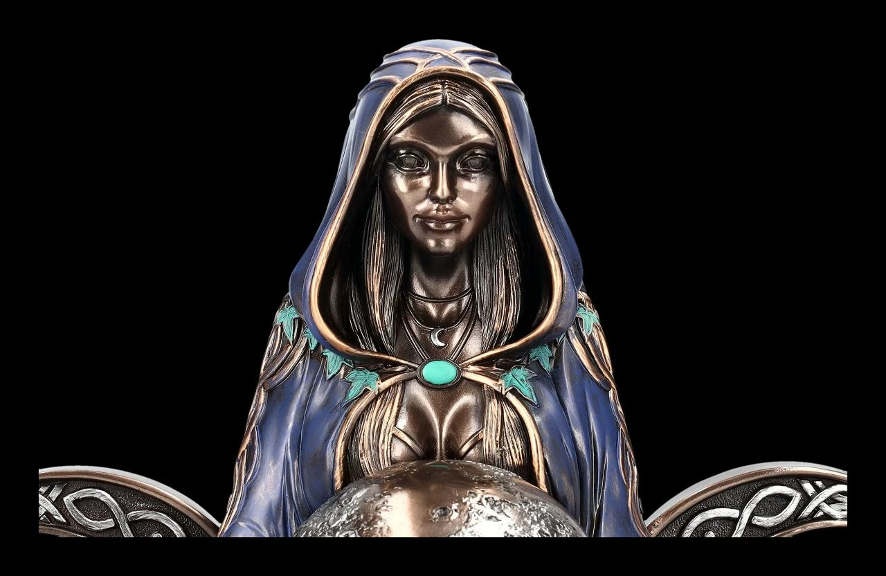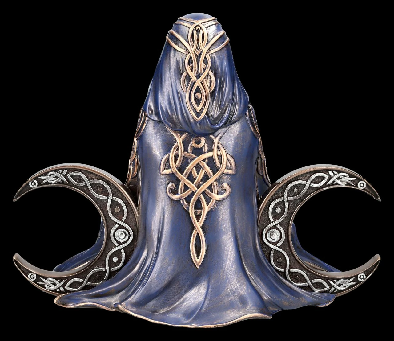 Als große Magierin wird die Dreifach-Mond Göttin besonders in der Wicca Spiritualität verehrt. Von den beiden Mondsicheln des zu- und abnehmenden Mondes begleitet, scheint die Göttin selbst mit ihren Händen den Vollmond in ihrem Schoß zu halten. Und sie scheint als Jungfrau – Mutter und Weise alle drei Gestalten des natürlichen Kreislaufes des Werden, Seins und Vergehens in sich zu vereinen. Diese edel bronzierte und sehr fein und zurückhaltend colorierte Figur der Dreifach-Mond Göttin zeigt eine wunderbare und starke Symbolik. Die 25 cm hohe, 31 cm breite und 18,5 cm tiefe Göttin-Figur wurde aus hochwertigem Kunststein (Polyresin) geschaffen. Für alle, die an eine von der Dreifach-Mond Göttin symbolisierte, naturverbundene Spiritualität und die Einheit von Körper, Geist und Seele glauben, ist diese magische Figur ein wunderbares Geschenk.