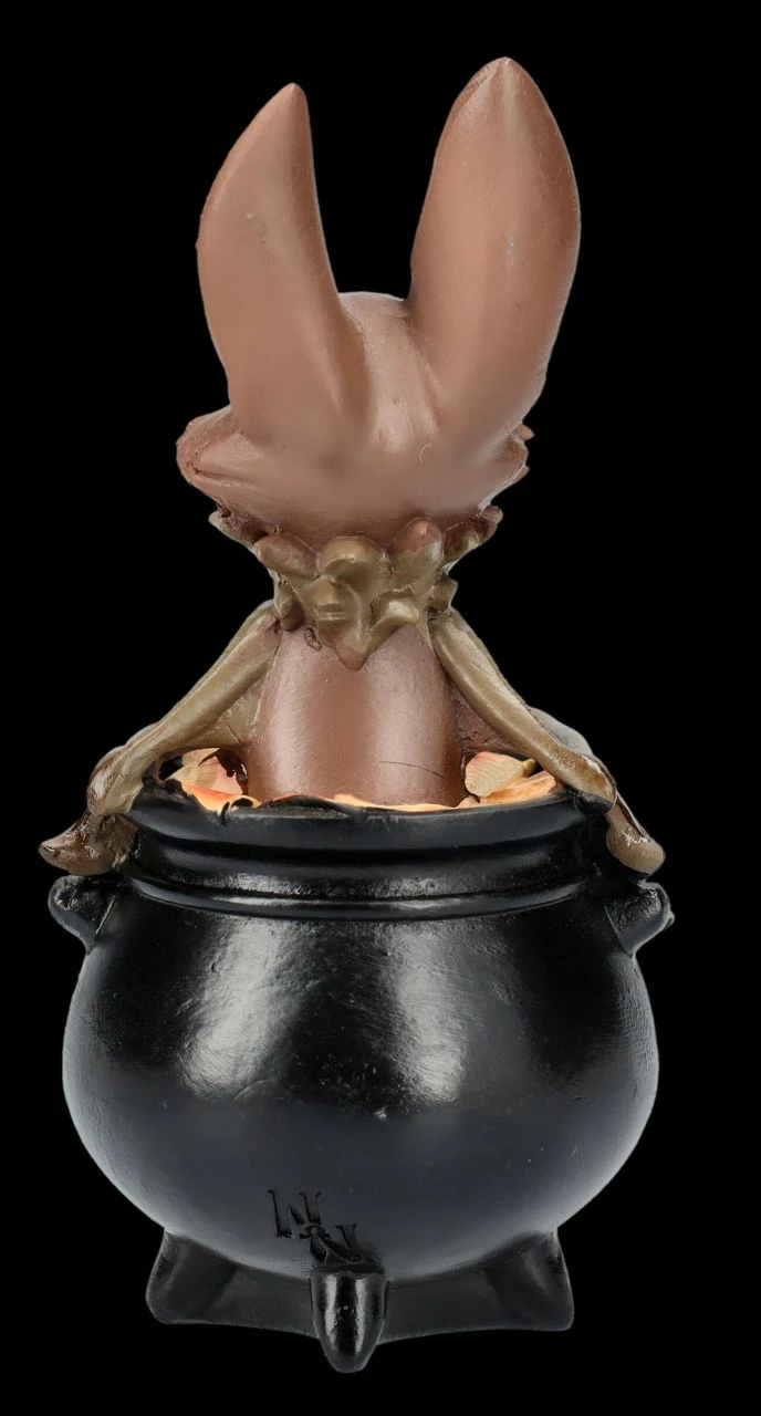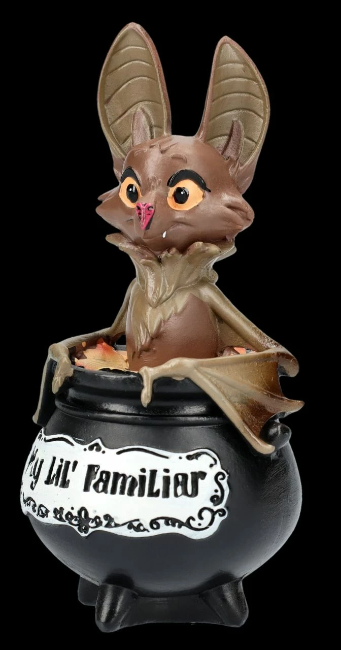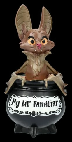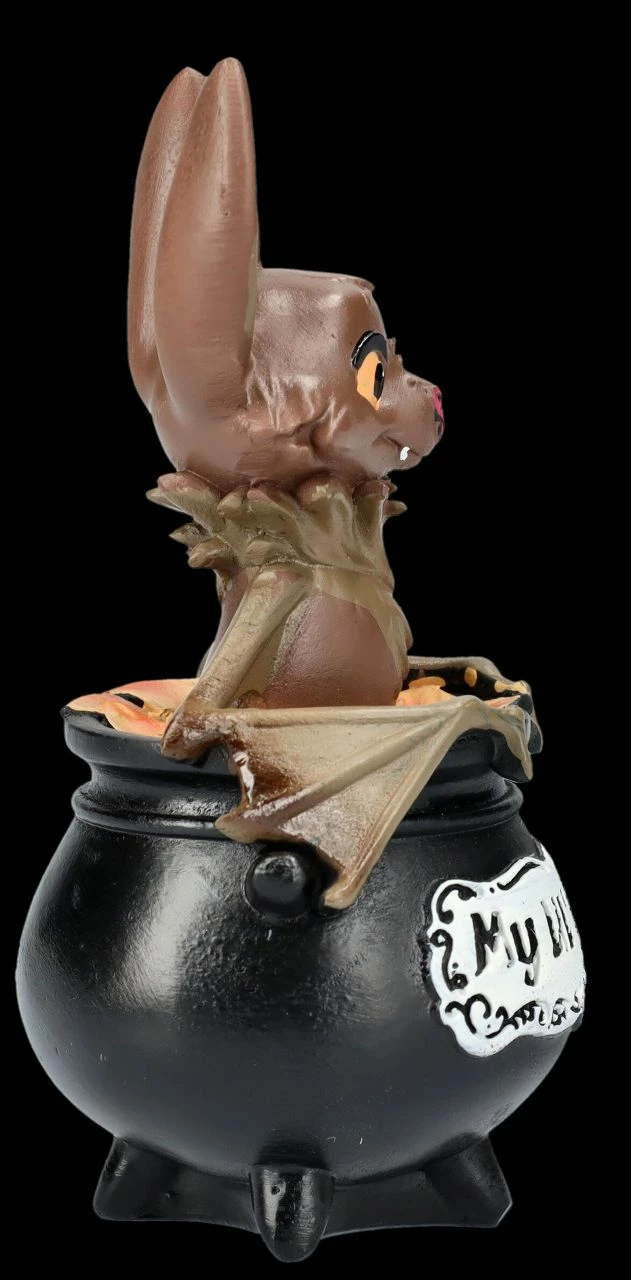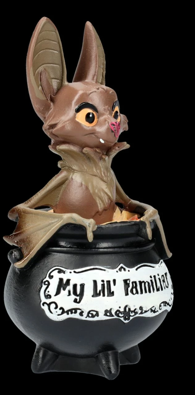 Vesper, die lustige Fledermaus, versucht gerade mühsam ihre Flügel zu ordnen, damit sie aus dem mit ‚My Lil‘ Familiar‘ beschrifteten schwarzen Hexenkessel klettern kann. Die lustige Fledermaus-Figur von Nemesis Now ist aus handbemaltem Kunststein (Polyresin) und 11 cm hoch, 5 cm breit und 5 cm tief. Die Fledermaus Vesper ist – am besten gleich gemeinsam mit den anderen Familienmitgliedern, der Katze Shadow und der Eule Alden aus unserem Shop – eine witzige Deko für Sammler, aber auch ein perfektes Geschenk für große und kleine Hexen und Magier und kommt mit einem toll bedruckten Geschenkkarton.
