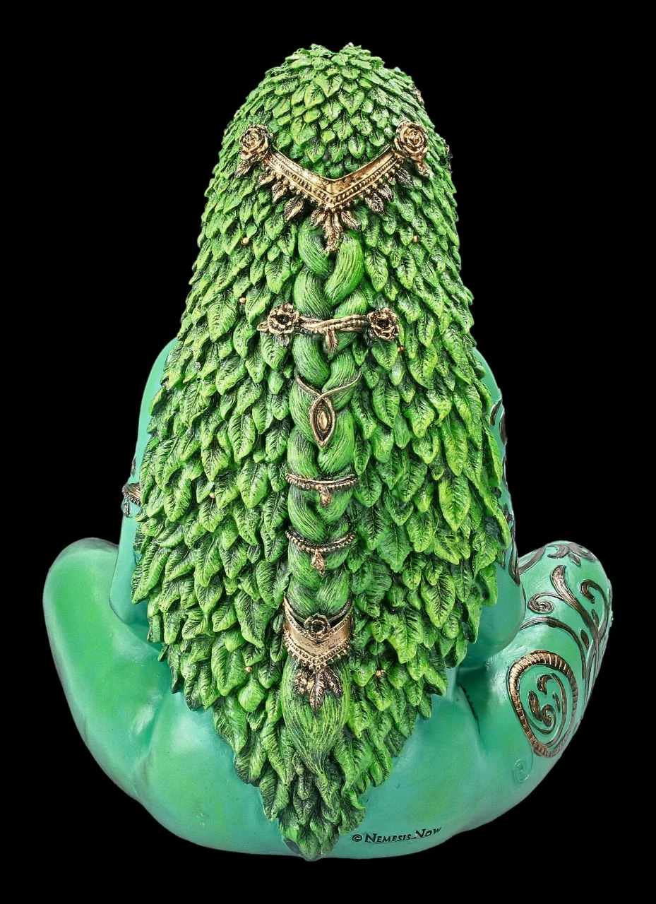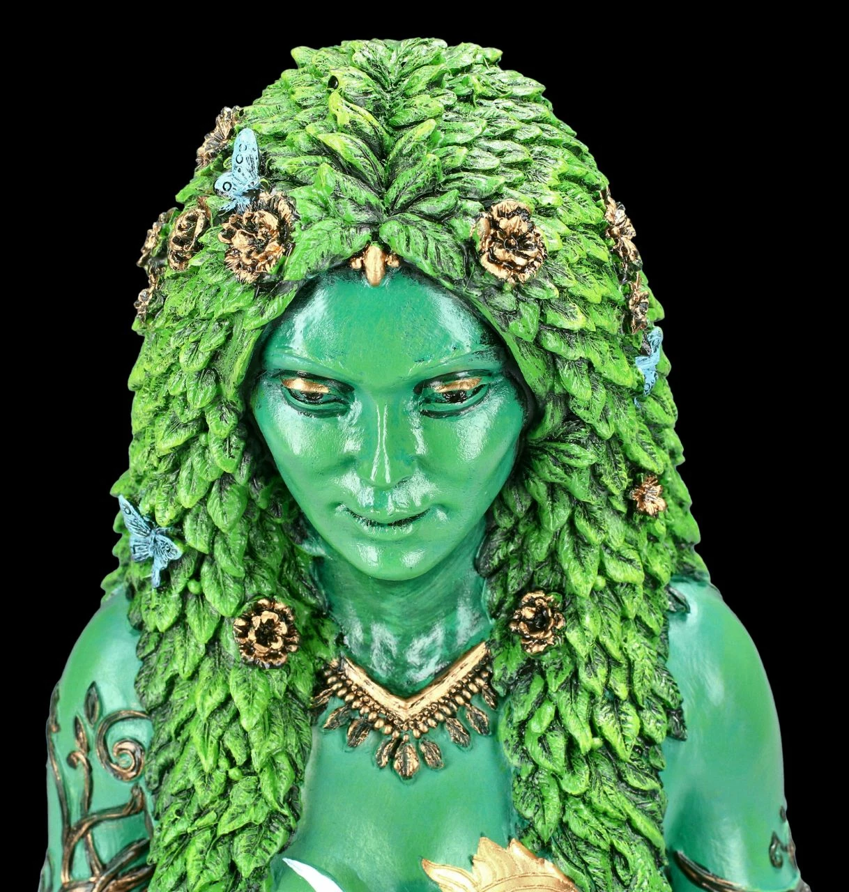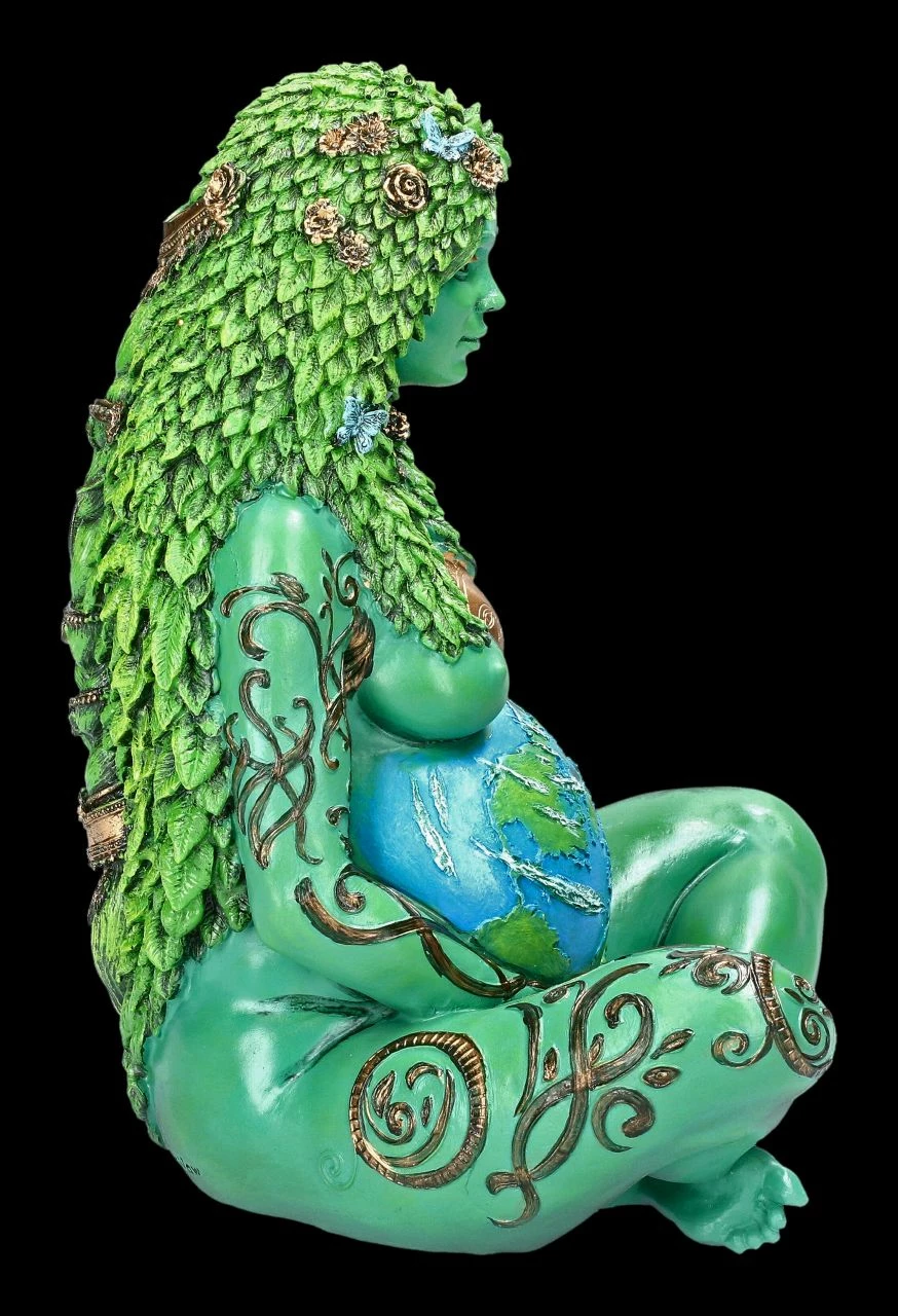 Mutter Erde – schützend umfasst die in sanften Grün- und Blautönen handbemalte himmlische Gaia ihren Bauch kurz vor der Geburt der Erde. Ihr Blick ist sanft und nachdenklich. Mit ihren glänzenden Tatoos und dem edel ausgearbeiteten Schmuck in den langen Haaren und mit den detailliert herausgearbeiteten grünen Blättern und langem Zopf, ist die Gaia Figur ein sehr schönes Geschenk für die Schwester oder Freundin und wird in einer Geschenk-Box versandt. Diese Gaia-Figur ist 29,0 cm hoch, 23,0 cm breit und 21,0 cm tief und aus detailreich handbemaltem Kunststein (Polyresin).