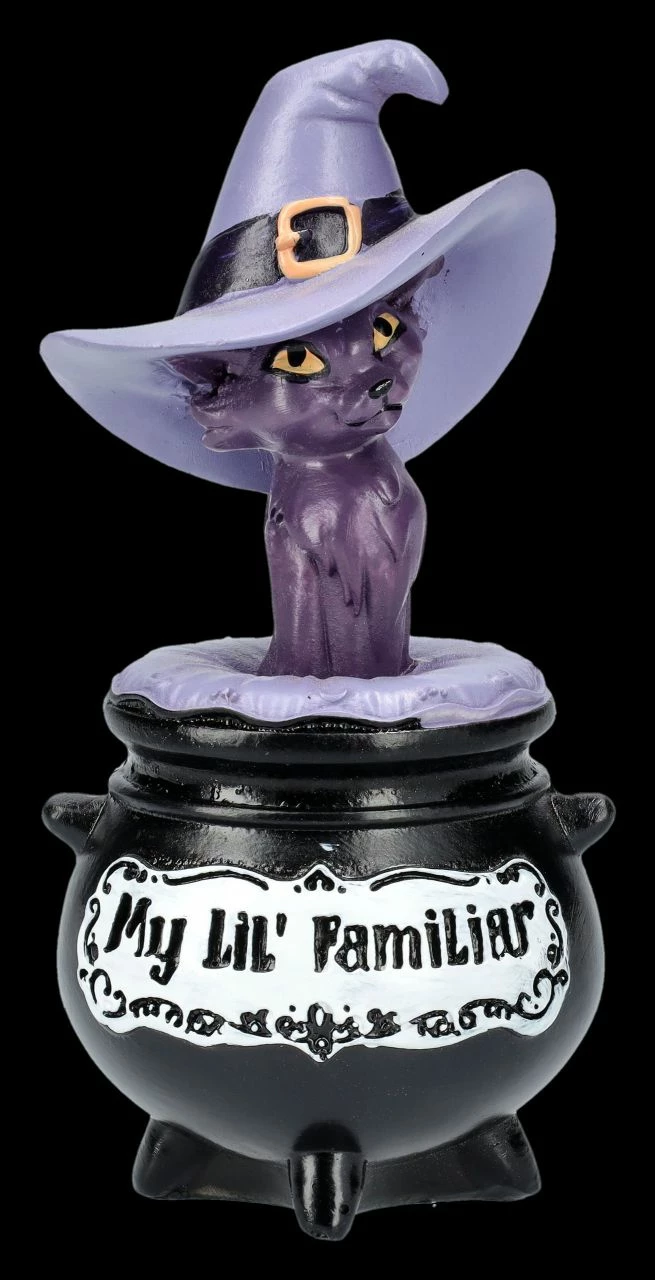 ‚My Lil‘ Familiar‘ steht auf dem schwarzen Hexenkessel, auf dem die violette Katze Shadow beinahe unter dem violetten Hexenhut verschwindet. Die lustige Katzen-Figur von Nemesis Now ist aus handbemaltem Kunststein (Polyresin) und 10,5 cm hoch, 5 cm breit und 5 cm tief. Die Katze Shadow ist – am besten gleich gemeinsam mit den anderen Familienmitgliedern, der Fledermaus Vesper und der Eule Alden aus unserem Shop – eine witzige Deko und ein perfektes Geschenk für große und kleine Hexen, Magier und Sammler und kommt mit einem toll bedruckten Geschenkkarton.