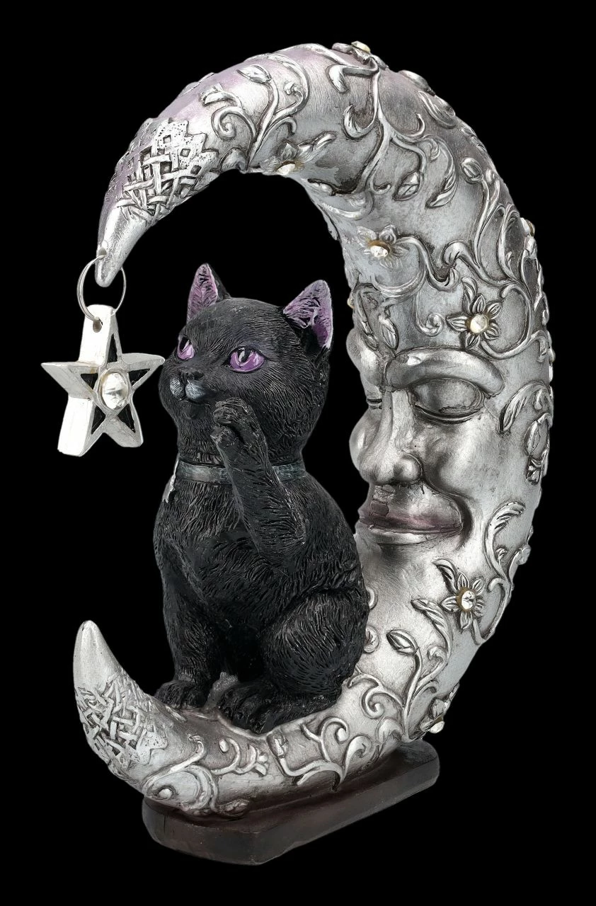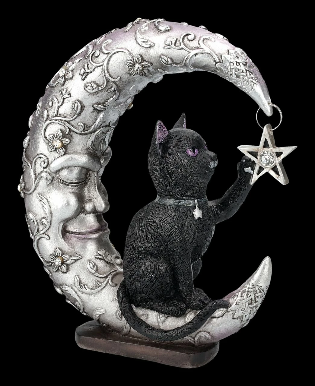 Da beide eher in der Nacht aktiv sind, kennen sie sich natürlich schon sehr gut. Daher kann man nicht sicher sein – lächelt der silberne Mond, weil die kleine schwarze Katze so süß mit dem Pentagramm spielt, oder ist er dabei in Trance geraten? Nicht nur die silbern glänzende, mit Blumenranken umschlungene Mondsichel ist mit Schmucksteinen verziert, auch das Pentagramm hat einen glitzernden Schmuckstein in der Mitte. Die 19,5 cm hohe, 16 cm breite und 5 cm tiefe Mondsichel mit dem Pentagramm und der schwarzen Katze wurde aus liebevoll handbemaltem Kunststein (Polyresin) gefertigt. Eine absolut niedliche Deko und das perfekte Geschenk für alle, die sich von Luna Companion in süße Träume begleiten lassen möchten.