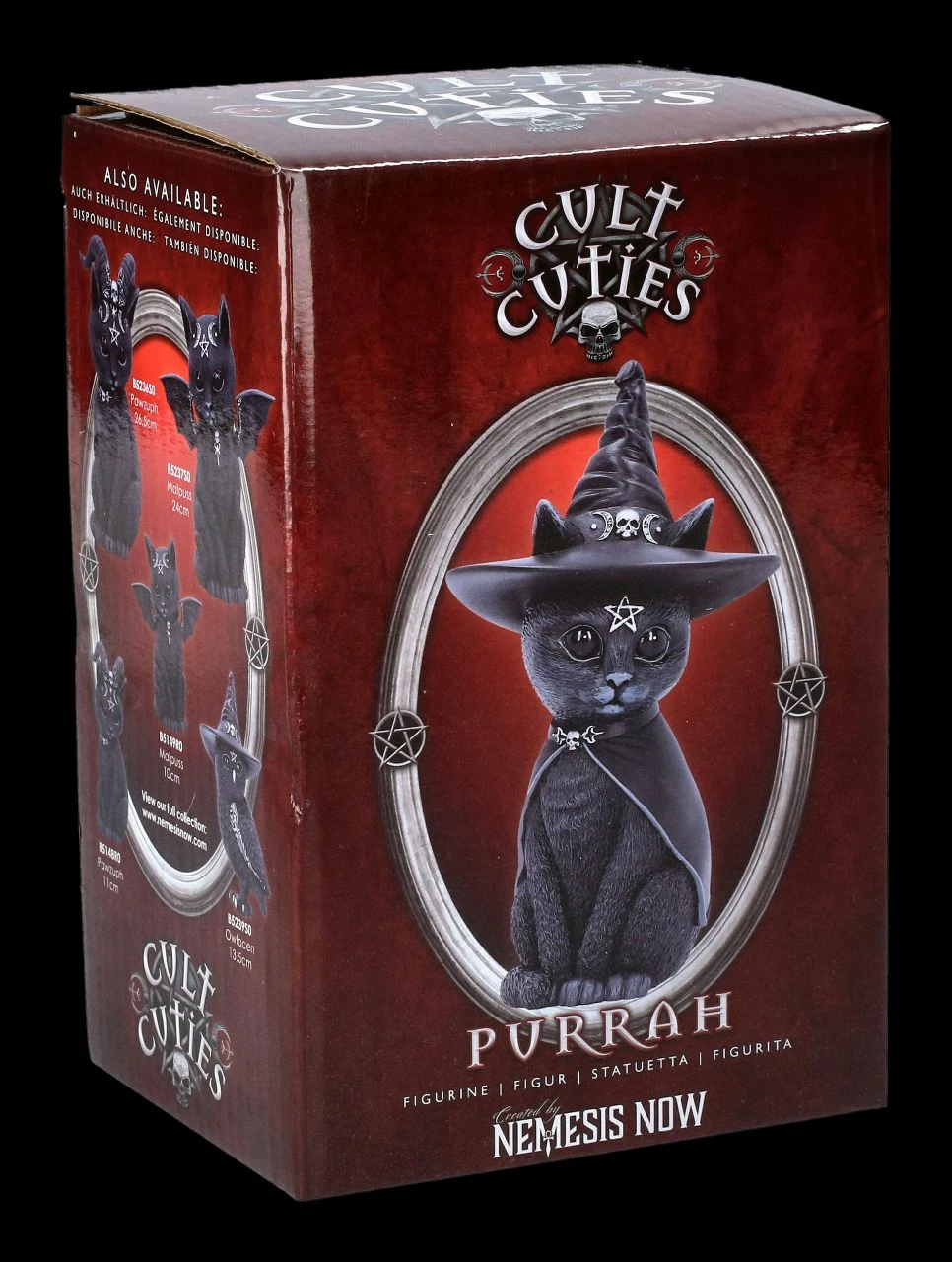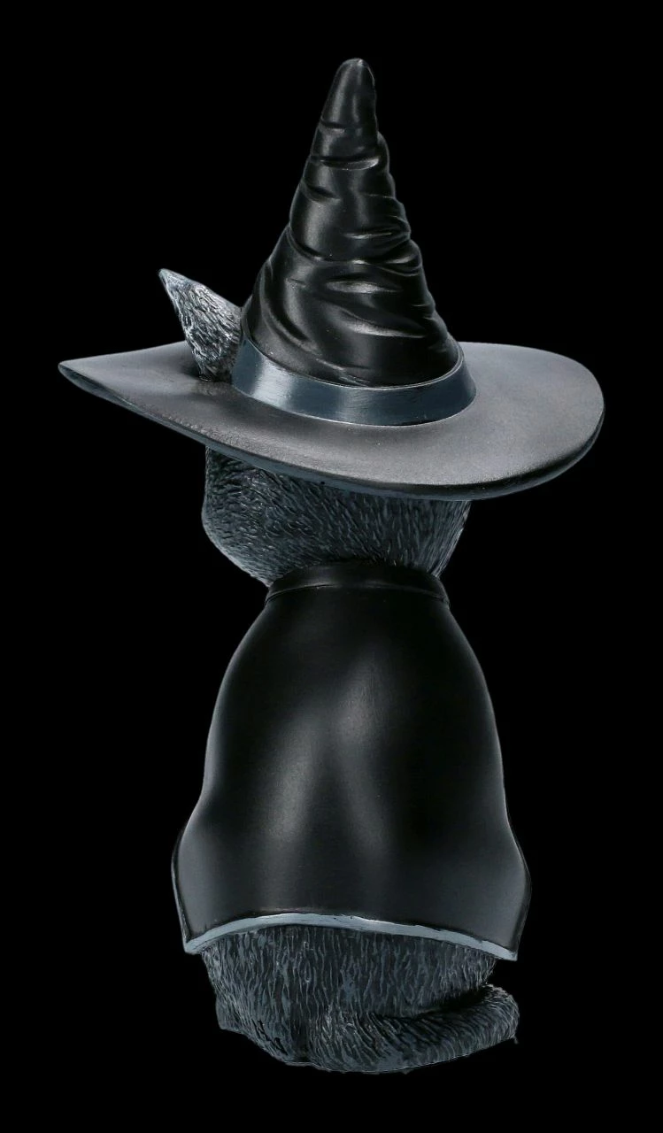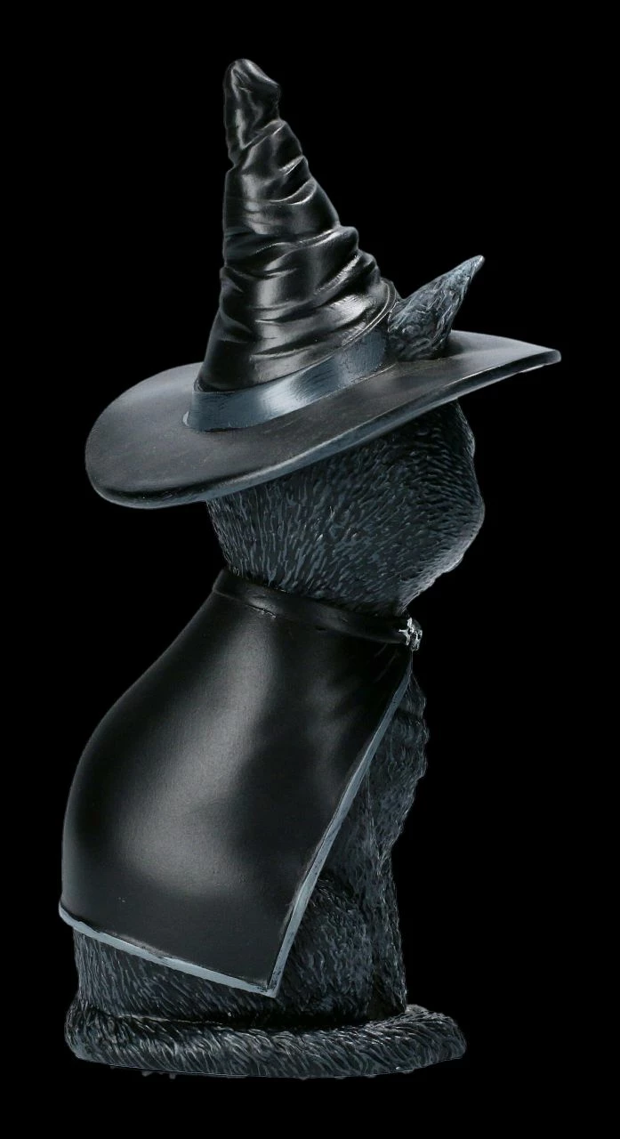 Eigentlich sieht Purrah, die schwarze Hexenkatze, mit ihren großen Augen ja richtig niedlich aus. Aber man soll sich nicht täuschen, wie man an dem schwarzen Umhang mit der Totenkopfschließe, dem schwarzen Hexenhut mit dem Dreifachmond mit dem Schädel in der Mitte und dem Pentagram auf der Stirn sieht. Purrah, die okkulte Katze von Nemesis Now ist aus handbemaltem Kunststein (Polyresin) gefertigt und 14 cm hoch, 8 cm breit und 6 cm breit. Sie ist auch ein willkommenes Geschenk für alle Hexen, aber auch für Katzenfreunde und wird inklusive einer Geschenkverpackung verschickt.