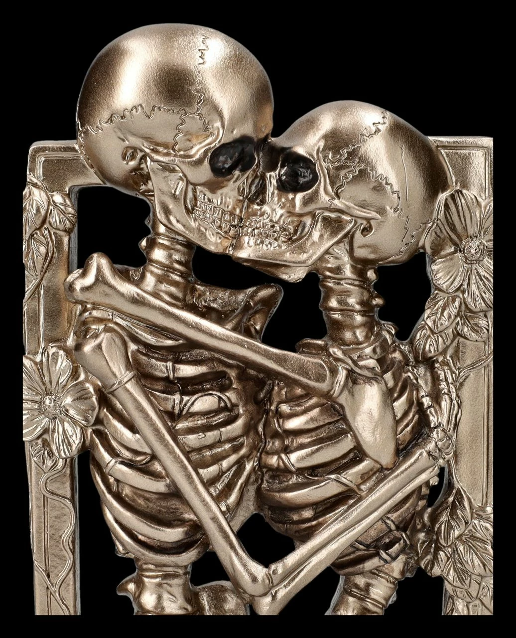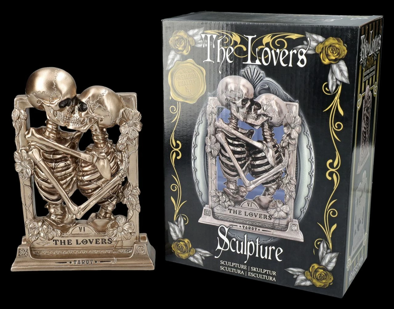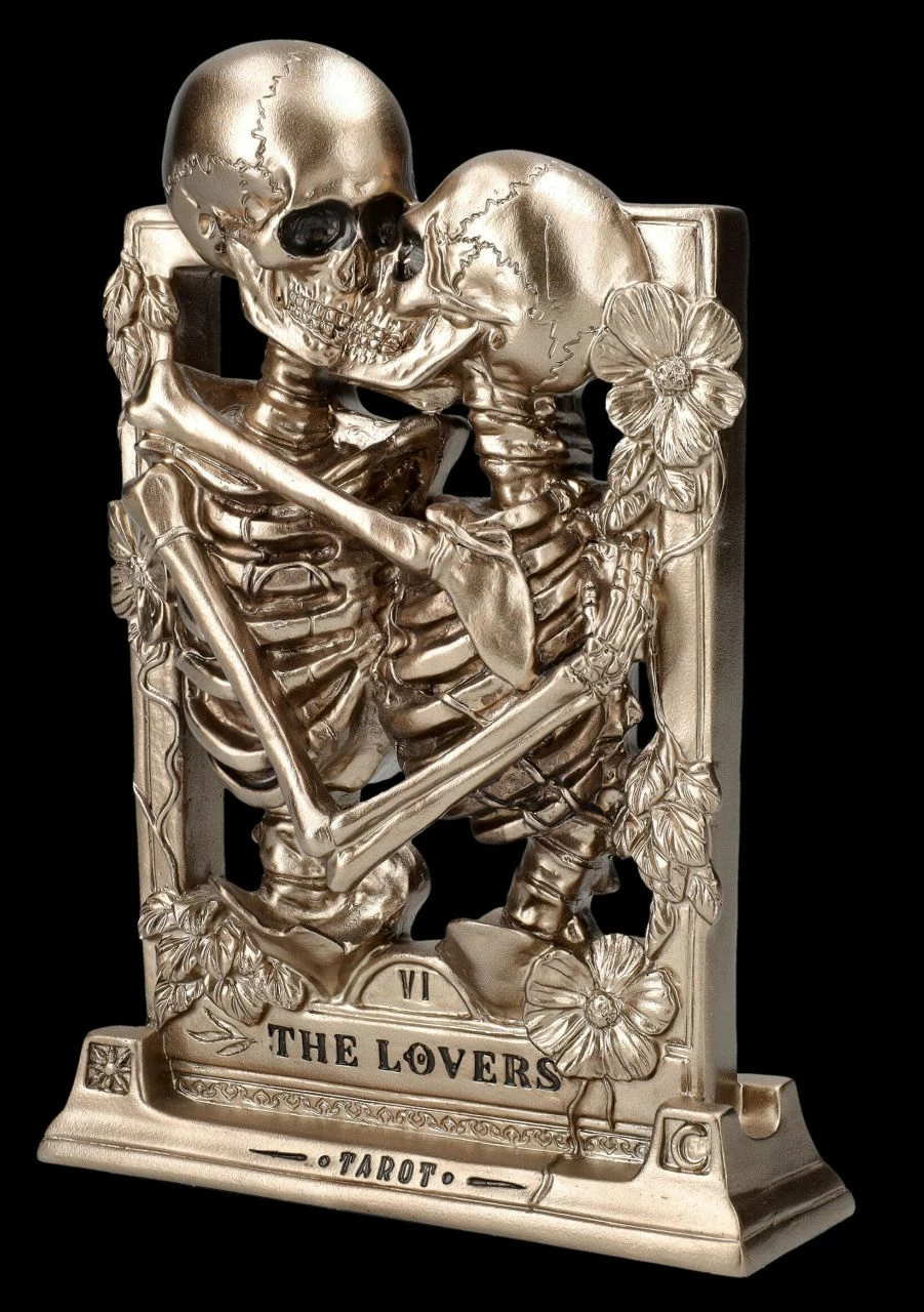 ‚The Lovers‘ steht auf dem wie eine Tarotkarte gestalteten Rahmen mit dem sich zärtlich küssenden Skelett-Liebespaar. Im Tarot geht es bei den Liebenden um die Bedeutung von Liebe, Sehnsucht, Partnerschaft und Entscheidungen. Dieses Skelett-Liebespaar zeigt auch, dass ihre Liebe bis über den Tod hinaus bestehen wird. Die 20,5 cm hohe, 14,5 cm breite und 6 cm tiefe Skelett-Dekofigur von Nemesis Now ist detailreich aus handbemaltem Kunststein (Polyresin) gefertigt. Sie ist auch ein vielsagendes Geschenk und kommt in einem toll bedruckten Geschenkkarton.