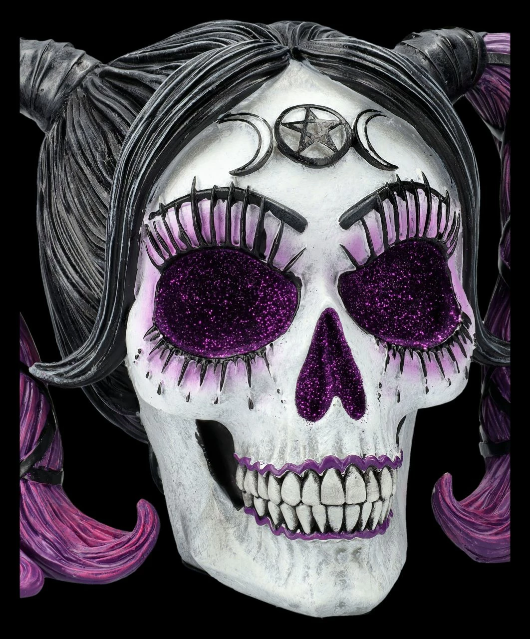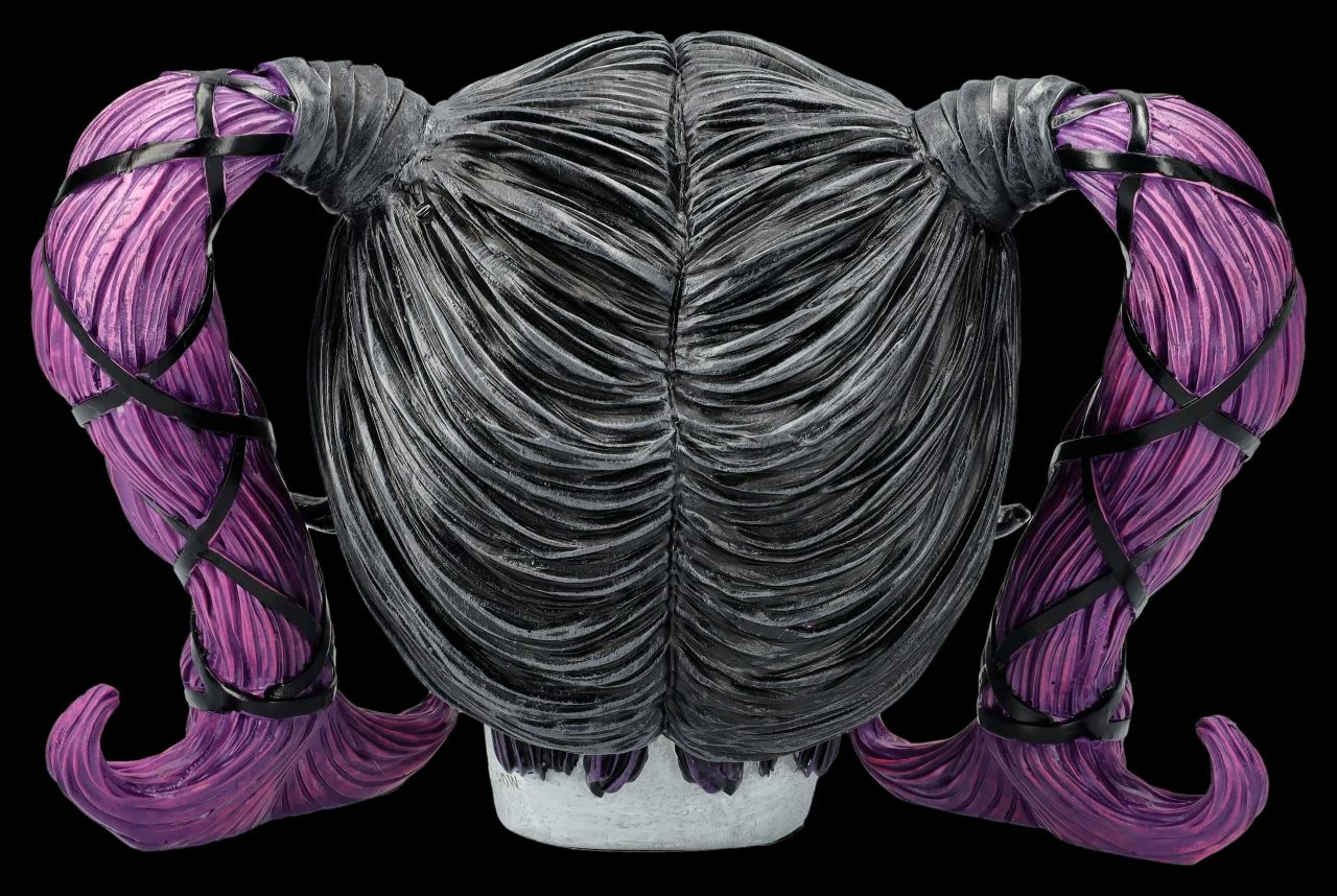 ‚Drop Dead Gorgeous‘, also ‚Gnadenlos schön‘ nennt Nemesis Now den beeindruckenden weiblichen Totenkopf aus der Serie Myths & Magic. Charmant lächelt die Schöne mit den violetten Zöpfen und den strahlenden violetten Glitzeraugen jeden an. Die Bewunderung ist ihr gewiss. Auf der Stirn trägt der einzigartige Schädel das Symbol der Dreifachen Mondgöttin. Der außergewöhnliche Totenkopf mit den glitzernden Details ist aus hochwertigem, feinem Kunststein (Polyresin) und wurde liebevoll von Hand bemalt. Der 13,5 cm hohe, 20,5 cm breite und 14,5 cm tiefe Schädel der bezaubernden Schönen bringt eine ganz besondere Atmosphäre in jeden Raum. Er ist aber auch ein außergewöhnliches Geschenk und kommt inklusive eines toll bedruckten Geschenkkartons.