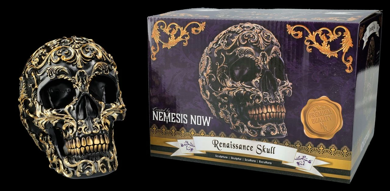 Es gab Zeiten, in denen reich verzierte Totenköpfe bei den Reichen & Schönen als Dekoration für morbide Feste dienten. Wie wäre es mit diesem herrlich verzierten Schädel ‚Renaissance von Nemesis Now für das nächstes Fest? Die goldenen Verzierungen und Zähne geben dem schwarzen Totenkopf ein prachtvolles barockes Aussehen. Der Totenkopf aus hochwertigem Kunststein (Polyresin) wurde sorgsam von Hand bemalt. Er ist 15 cm hoch, 11,5 cm breit und 19 cm tief und kommt mit einem toll bedruckten Geschenkkarton. Er ist also auch als außergewöhnliches Geschenk geeignet.