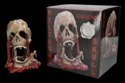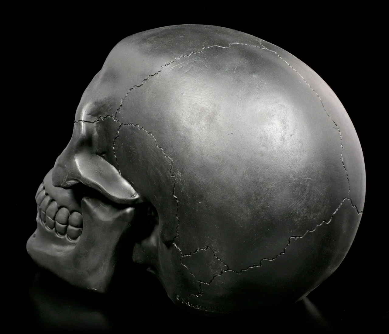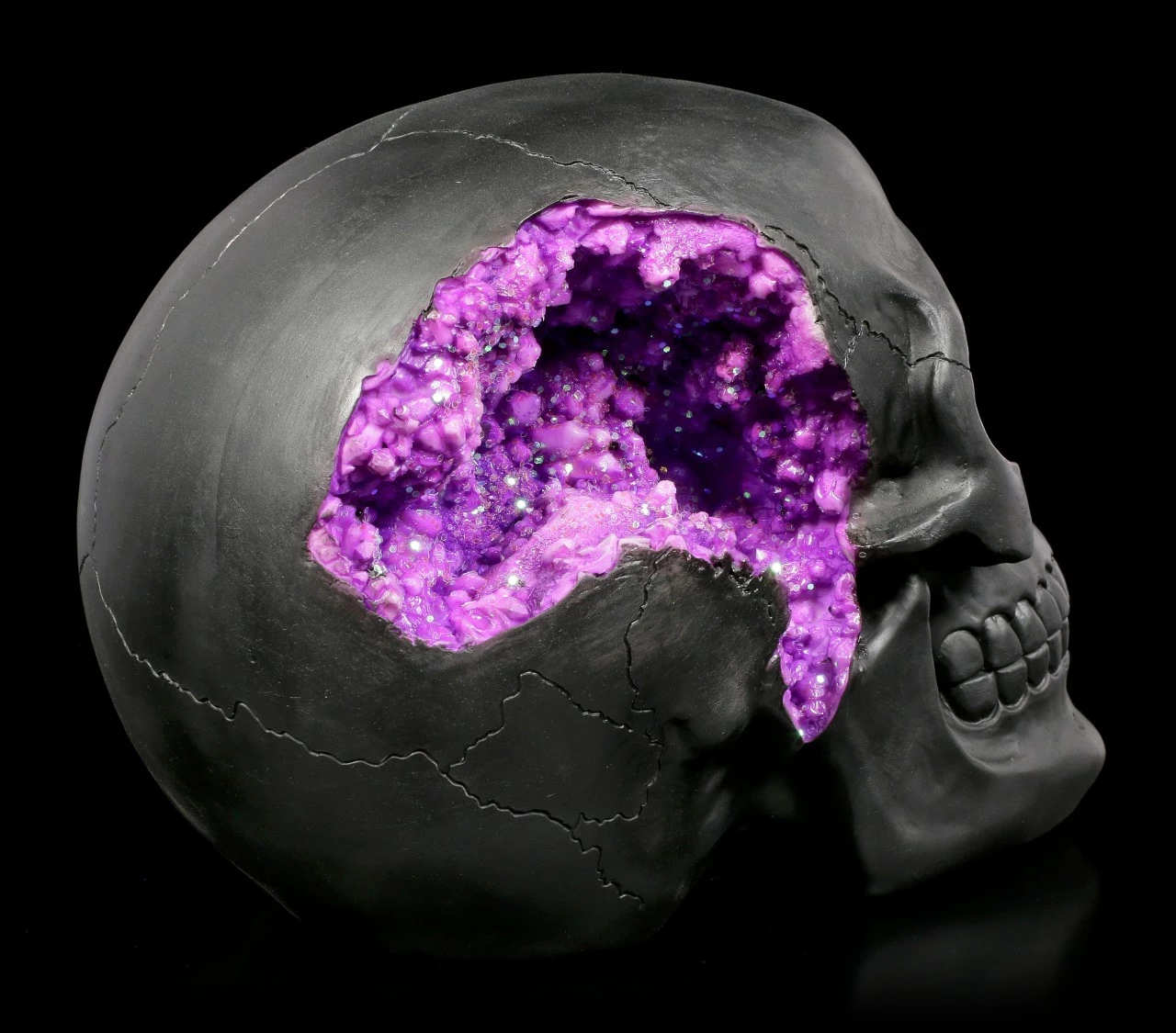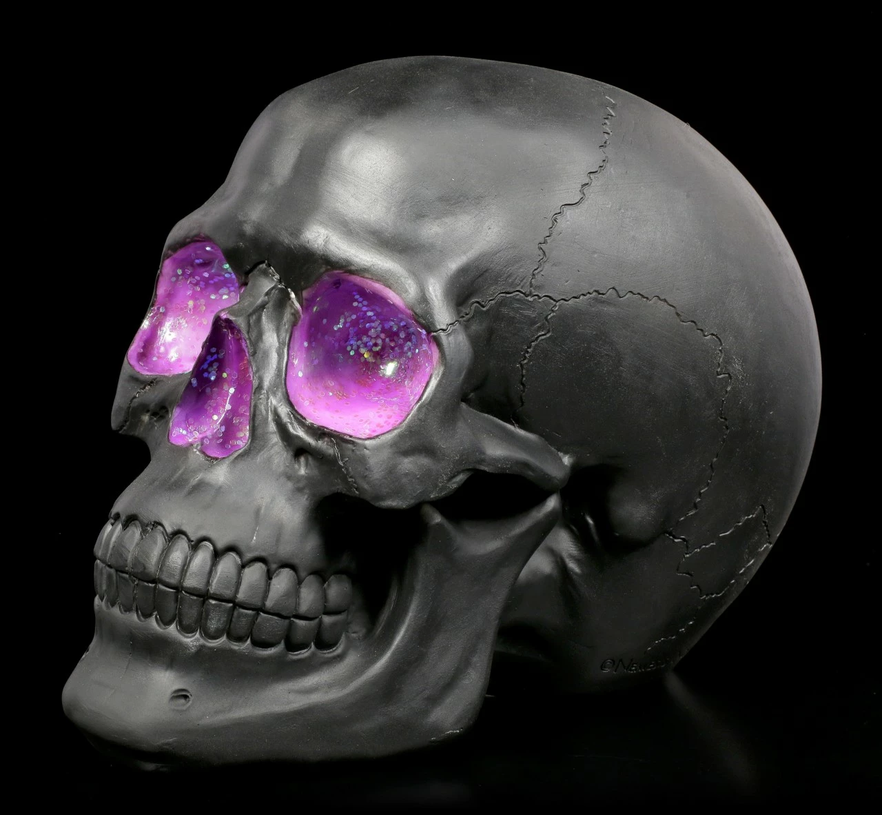 Hell und glänzend hebt sich der lilafarbene Kristall von dem schwarzen Totenkopf hervor und wirkt dabei furchtbar aufregend. Fast wirkt es so, als ob der Totenschädel sein kostbares Gut nur widerwillig preisgibt. Mit so einem Totenschädel aus detailreich gefertigtem und handbemaltem Kunstsein (Polyresin) können Sie Ihre Wohnung äußerst aufregend dekorieren.