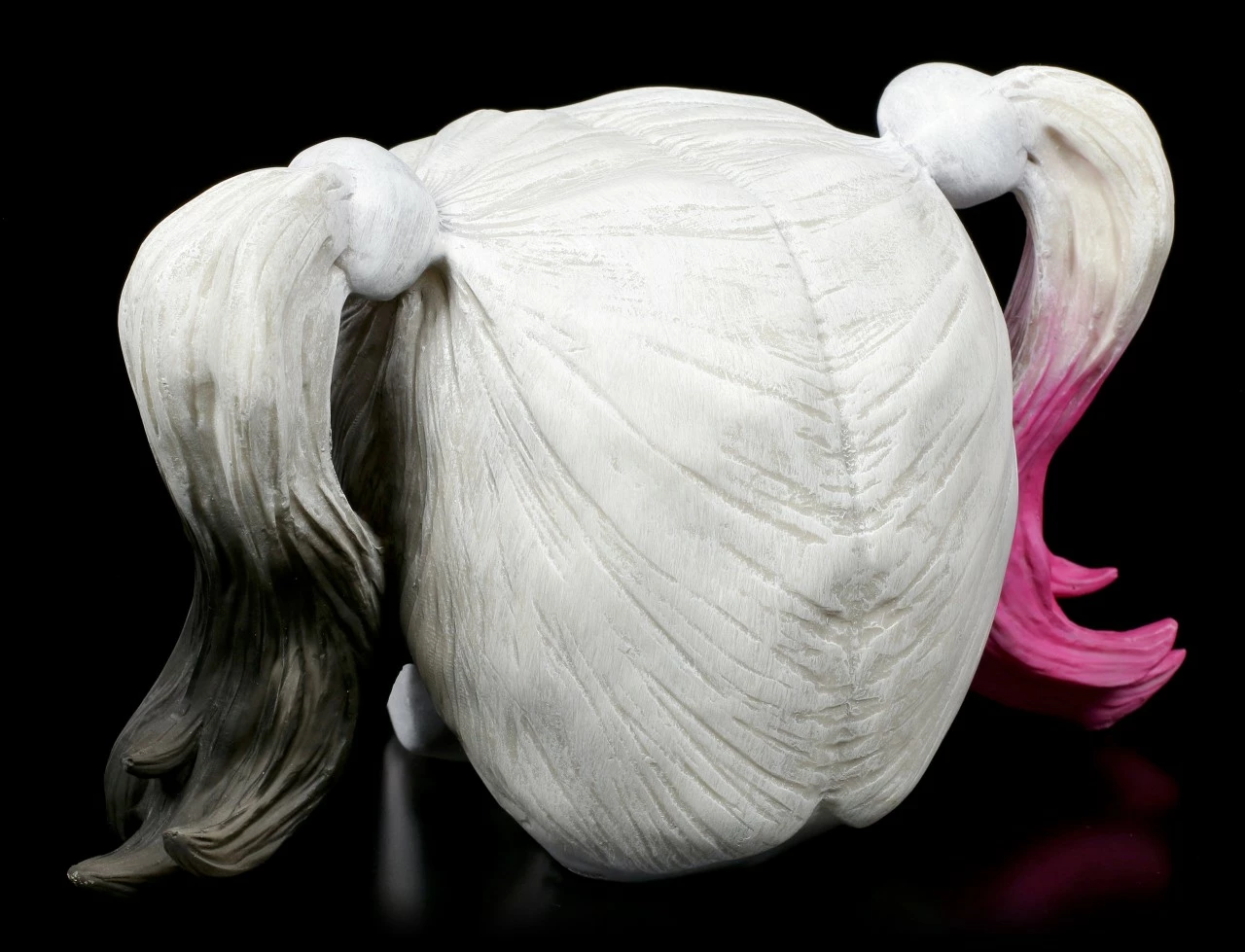 Dieses kleine Monster ist perfekt für Halloween! Besonders auffallend bei diesem schwarz-pink geschminkten weißen Totenschädel ist die weiße Haarpracht, die in zwei seitlichen Pferdeschwänzen gebändigt worden ist. Die pink gefärbten Haarspitzen leuchtet schon von weitem. Dieser Totenkopf aus handbemaltem Kunststein (Polyresin) sieht so unschuldig frech aus – wer kann diesem little Monster schon widerstehen?