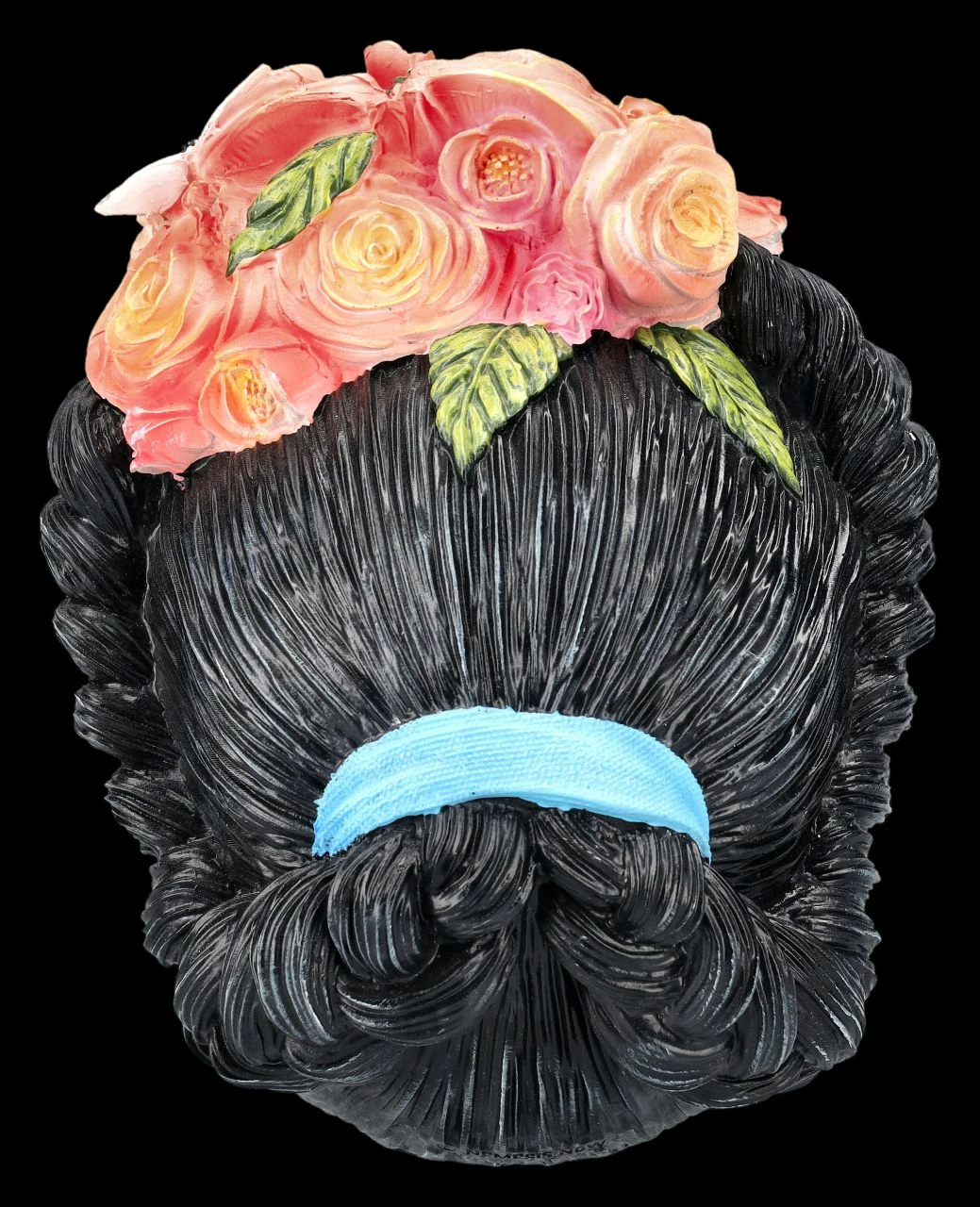 Der ‚Tag der Toten‘ wird in Mexiko mit ausgelassenen Festen gefeiert und bei diesen Festlichkeiten spielen Süßigkeiten, wie die bunten Zuckerschädel ‚Calavera de Azucar‘, eine große Rolle. Dieser blaue, mit mexikanischen Mustern verzierte Totenkopf aus wunderbar handbemaltem Kunststein (Polyresin) mit dem herrlichen Rosen-Stirnband ist von dieser Kultur inspiriert. Mit den extravaganten Augenbrauen erinnert er sogar etwas an die große Künstlerin Frida Kahlo. Für jeden, der den Dia de los Muertos feiert, ist dieser unglaublich fantastische, 18 cm hohe, 14 cm breite und 19 cm tiefe Totenkopf von Nemesis Now ein perfektes Geschenk und kommt inklusive einer tollen Geschenkbox