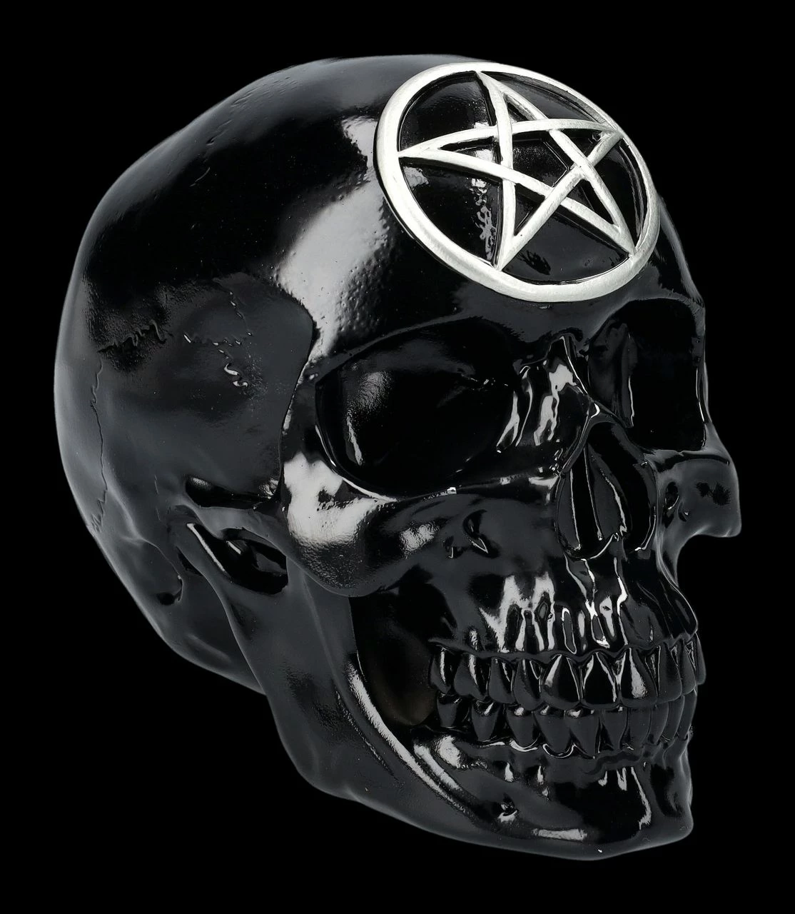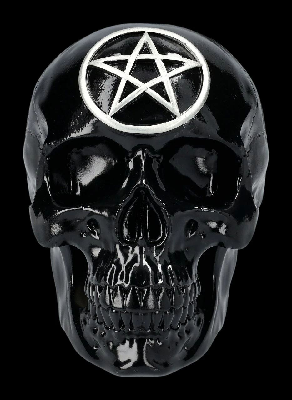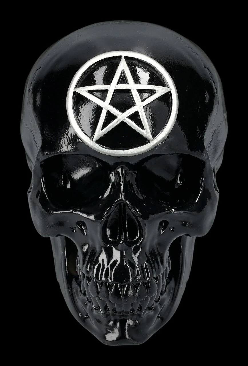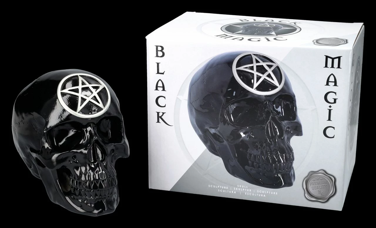 Für magische Rituale ist dieser sorgfältig handbemalte, schwarz glänzende Totenschädel aus Kunststein (Polyresin) fantastisch geeignet. Auf seiner Stirn leuchtet in einem Kreis deutlich das Pentagramm als eines der mächtigsten Schutzsymbole. Da es in einem Zug gezeichnet werden kann, stand das Pentagramm schon im Altertum für den ewigen Kreislauf des Lebens. Ab dem Mittelalter setzte man das Pentagramm zur Abwehr von Dämonen und Kobolden ein. Der 14 cm hohe, 12 cm breite und 19,5 cm tiefe Totenkopf ‚Black Magic‘ sollte seinen Platz auf einem Altar finden. Er ist nicht nur für Magier auch ein faszinierendes Geschenk und kommt inklusive Geschenkkarton.