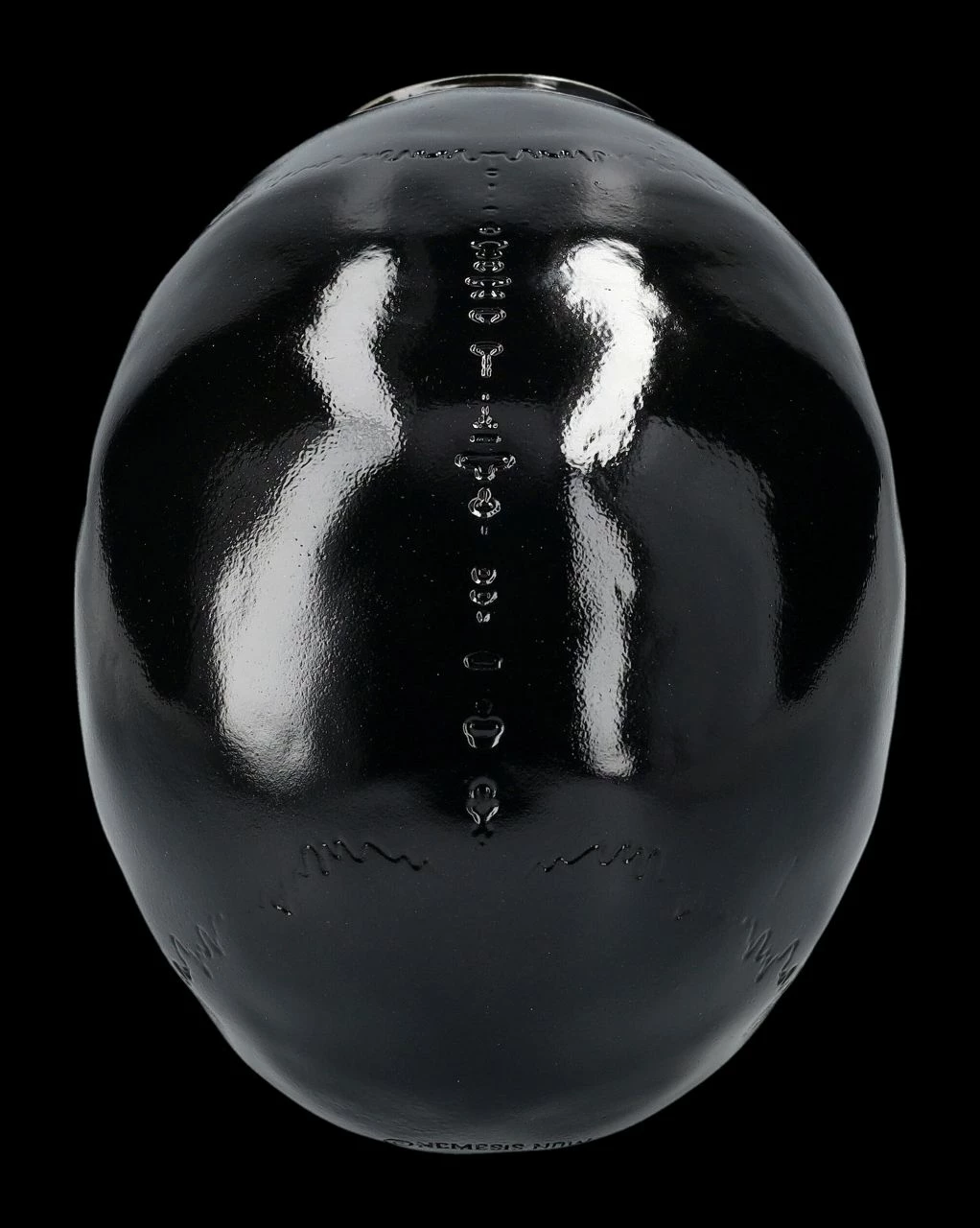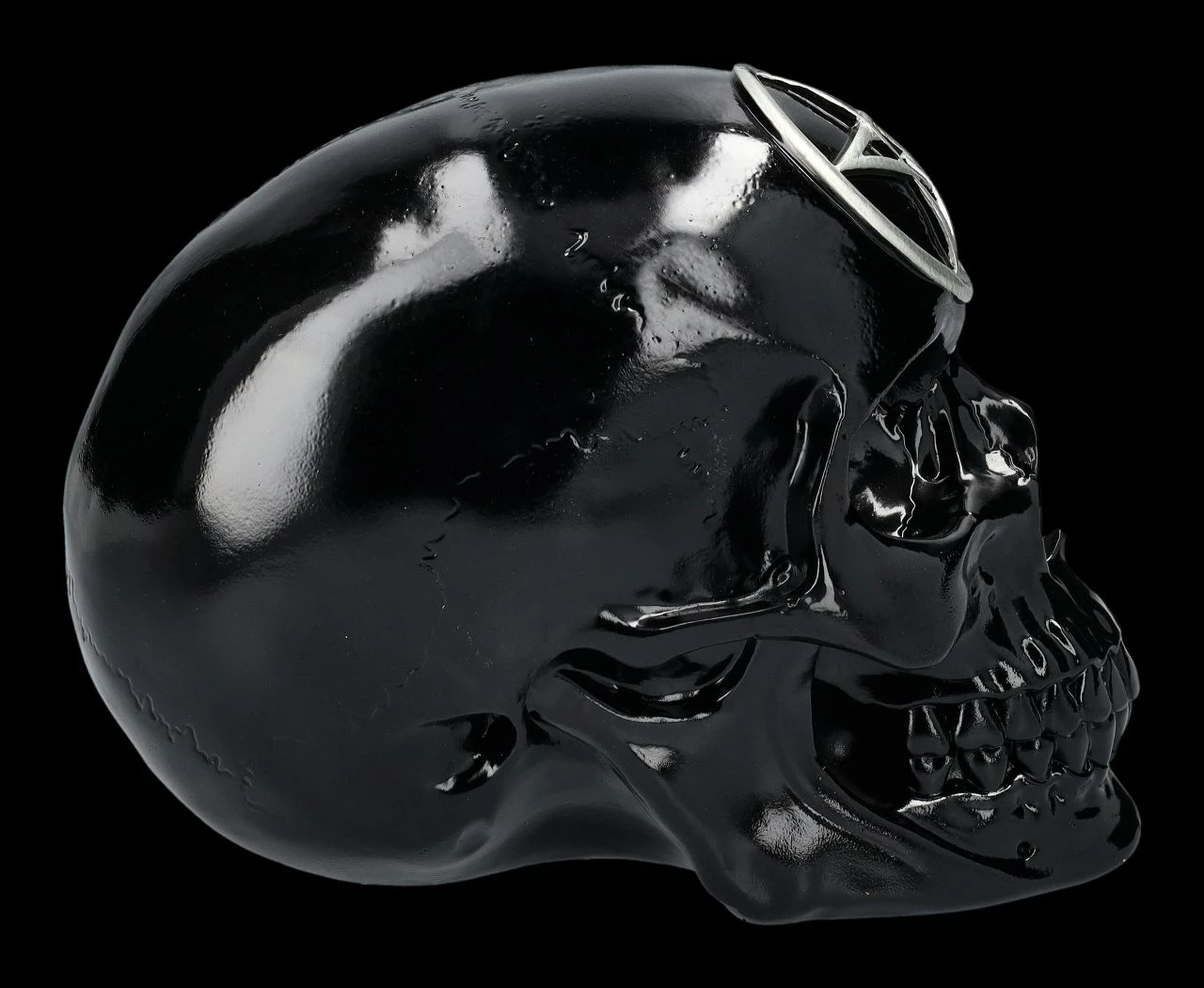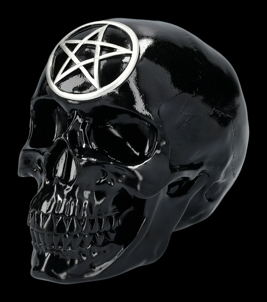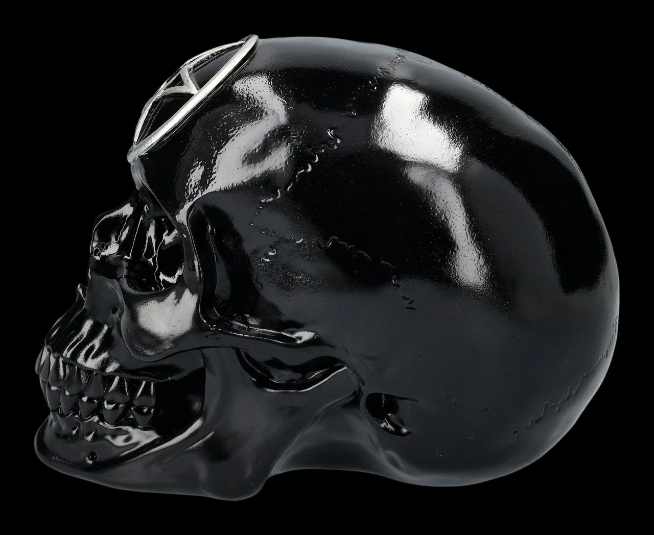 Für magische Rituale ist dieser sorgfältig handbemalte, schwarz glänzende Totenschädel aus Kunststein (Polyresin) fantastisch geeignet. Auf seiner Stirn leuchtet in einem Kreis deutlich das Pentagramm als eines der mächtigsten Schutzsymbole. Da es in einem Zug gezeichnet werden kann, stand das Pentagramm schon im Altertum für den ewigen Kreislauf des Lebens. Ab dem Mittelalter setzte man das Pentagramm zur Abwehr von Dämonen und Kobolden ein. Der 14 cm hohe, 12 cm breite und 19,5 cm tiefe Totenkopf ‚Black Magic‘ sollte seinen Platz auf einem Altar finden. Er ist nicht nur für Magier auch ein faszinierendes Geschenk und kommt inklusive Geschenkkarton.