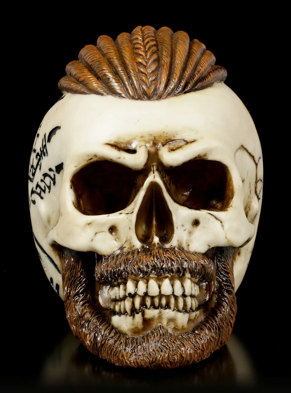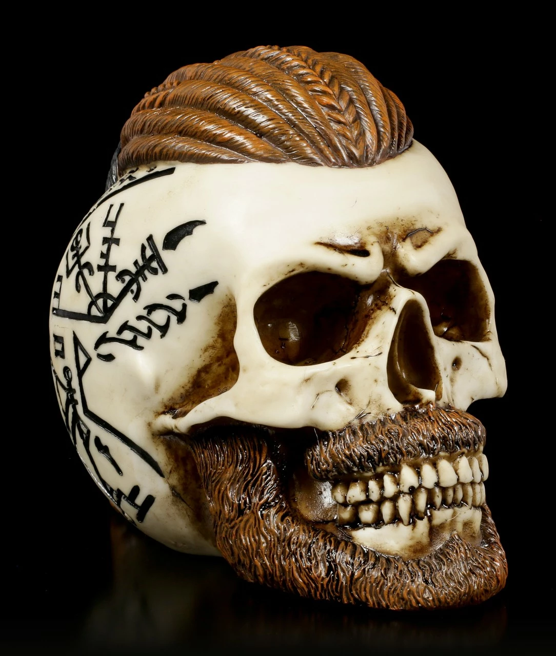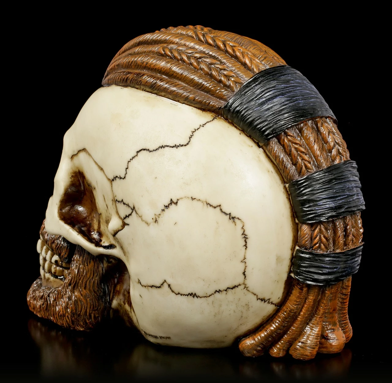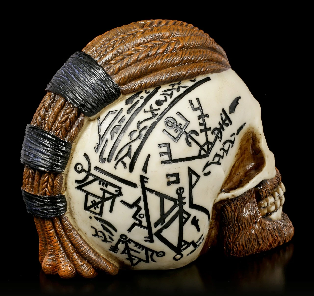 Die Haare zu einem kunstvollen Zopf geflochten, die Schädeldecke mit Wikingerrunen verziert – der handbemalte Totenkopf Ragna aus Kunststein (Polyresin) ist für alle Fans der Wikinger Mythologie das perfekte Geschenk.