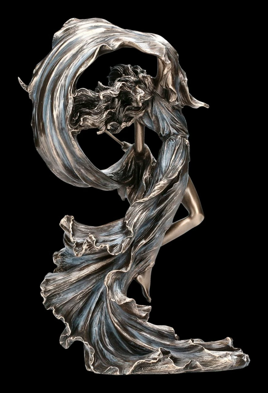 Nyx, die Göttin der Nacht, gehört in der griechischen Mythologie zu den Urgöttern und wurde als Tochter des Chaos geboren. Ihre Geschwister sind Gaia, Erebos, Eros und Tartaros. Sie war von unglaublicher Schönheit, was auch bei dieser wunderschönen Nyx Figur aus der Studio Collection von Veronese zu sehen ist. Die außerordentlich attraktive Figur der Göttin Nyx trägt eine Mondsichel als Schmuck auf ihrem Haar und einen Stab mit Mond und Mondsichel in ihrer Hand. In fließenden Wellen umschmeichelt sie ihr Kleid, das, wie auch der Schleier, der sie umweht, mit Sternen besetzt ist. Die edel bronzierte Figur der Göttin Nyx ist sehr aufwändig aus Kunststein (Polyresin) gefertigt und zart coloriert. Mit der Höhe von 28 cm, der Breite von 18 cm und der Tiefe von 12 cm wird die wunderschöne Göttin der Nacht mit Sicherheit überall sofort entdeckt und bewundert werden.