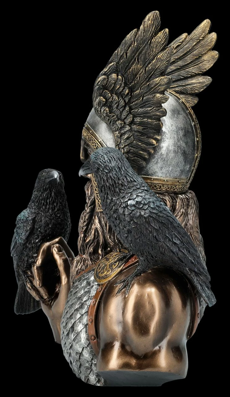 Die wunderbar detailreiche kleine Skulptur Odins aus der Studio Collection von Veronese zeigt den einäugigen Göttervater mit geflügeltem Helm mit seinen beiden Raben Hugin und Munin. Während einer der beiden Raben auf seiner Schulter sitzt und der andere auf seiner Hand, scheint Odin nachdenklich dem zu lauschen, was ihm die beiden Raben erzählen. Die prächtige Büste aus Kunststein (Polyresin) ist aufwändig bronziert und sehr fein und zurückhaltend coloriert. Sie wirkt dadurch ausgesprochen edel. Odins Büste mit seinen beiden Raben ist 22,5 cm hoch, 18 cm breit und 13 cm tief und durch die charakteristische Darstellung ein effektvoller Blickfang.