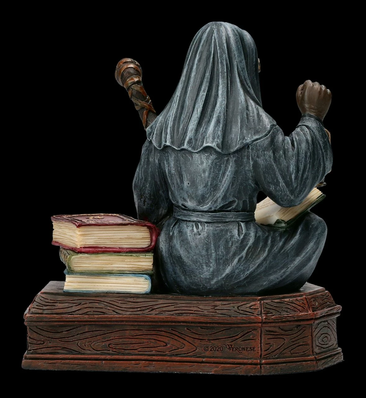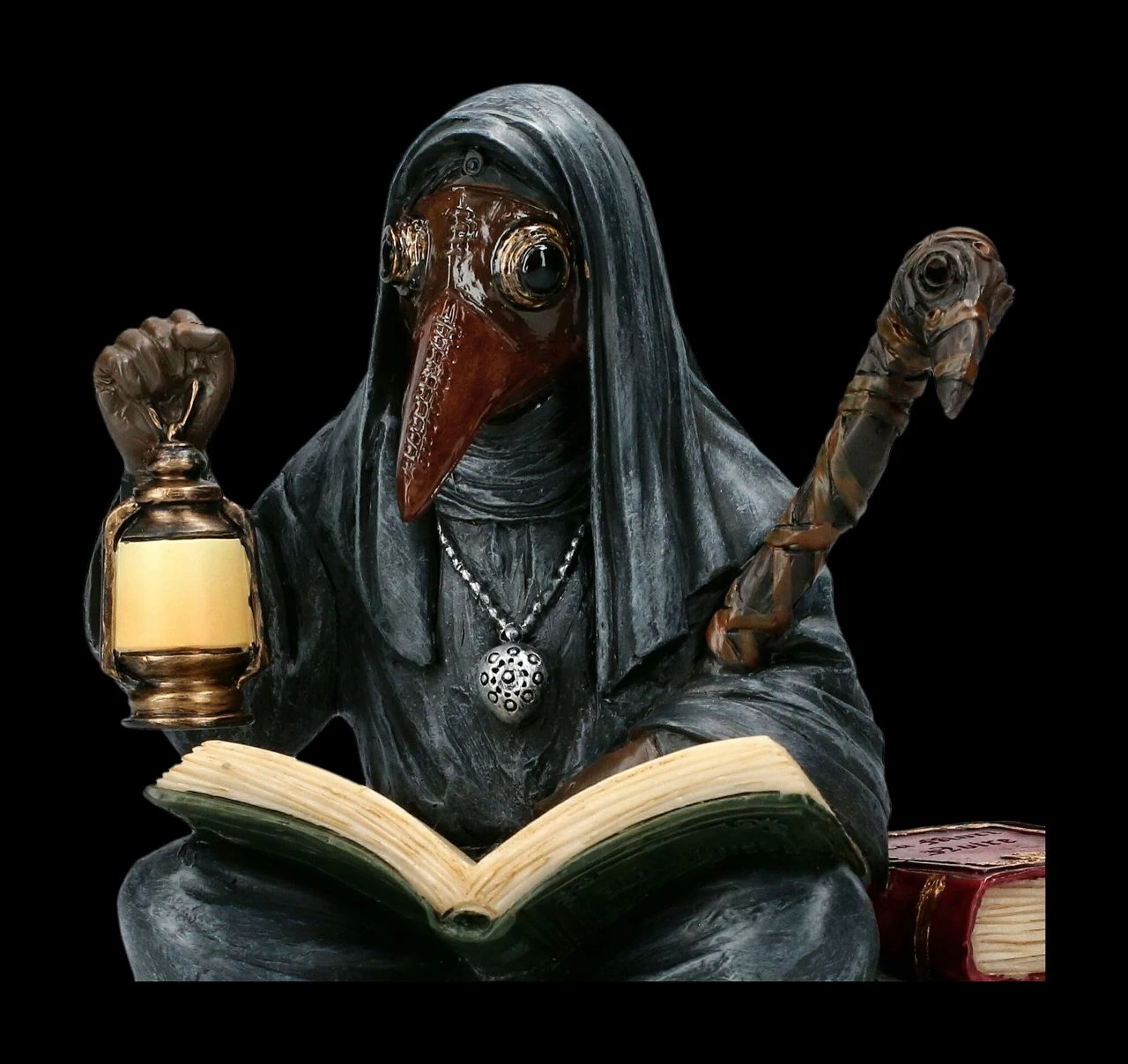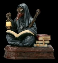 In Zeiten wie diesen, in denen sich Seuchen wieder ungehindert ausbreiten können, fragt sich nicht nur dieser wundersame Pestdoktor Apothecarius, wie er helfen kann, die Seuche zu bezwingen. Forschend in seinen Büchern blätternd, sitzt er auf einem Sarg und studiert im Scheine seiner Laterne seine wichtigen Notizen. Die 13 cm hohe, 12 cm breite und 7 cm tiefe handbemalte Figur des Pestdoktors aus der Studio Collection von Veronese ist fantastisch detailreich aus Kunststein (Polyresin) gefertigt. Der Apothecarius ist ein vielsagendes Geschenk und eine effektvolle Dekoration für eine Apotheke oder Praxis.