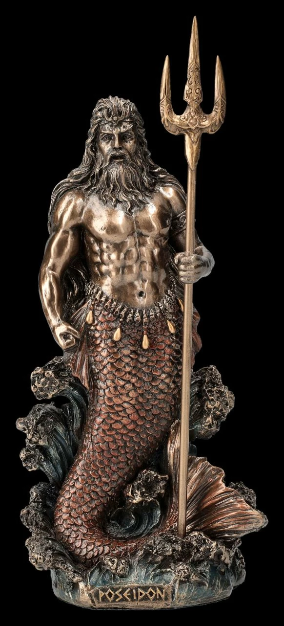 In der altgriechischen Mythologie war Poseidon der zweite Sohn Kronos und Bruder des Zeus und gehörte zu den zwölf Göttern auf dem griechischen Olymp. Als Herrscher des Meeres, der Quellen und der Seen hatte Poseidon von Hephaistos, dem für die Schmiedekunst zuständigen Gott, den Dreizack als Zepter erhalten. Diese wunderbare Skulptur des Poseidon als Herrscher des Meeres mit seinem Dreizack zeigt ihn halb Fisch und halb athletischen Mann mit Bart und langen Haaren. Die sorgsam bronzierte und zurückhaltend colorierte Figur aus der Studio Collection von Veronese ist 18,5 cm hoch, 8 cm breit und 6 cm tief. Sie wurde sehr detailreich aus hochwertigem Kunststein (Polyresin) gefertigt und wirkt ausgesprochen edel. Die Figur des griechischen Gottes Poseidon ist nicht nur ein dekorativer Blickfang, sondern auch ein perfektes Geschenk für alle, die sich für die altgriechische Götterwelt interessieren.