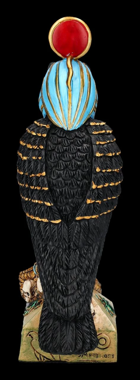 Der Sonnengott Ra war einer der bedeutendsten Götter der Alten Ägypter. Während Ra die Sonne symbolisiert, ist das Horus-Auge das Sinnbild des Himmels- oder Lichtgottes Horus. Gott Ra wird wie Horus in Falkengestalt dargestellt und so vom bekannten Fantasy-Künstler Stanley Morrison fantasiereich umgesetzt. Auf einem mit ägyptischen Hieroglyphen verzierten Podest, auf den Skarabäen hoch klettern, sitzt Ra in seiner Gestalt als Falke. Stanley Morrison, der nicht nur für seine Drachen in allen Positionen bei Sammlern sehr beliebt ist, hat auch bei dieser Ra-Figur in Falken-Gestalt aus der Ägypten-Serie seine Fantasie spielen lassen. Die 20 cm hohe, 6 cm breite und 8,5 cm tiefe Figur des Sonnengottes Ra in Falken-Gestalt wurde detailreich aus handbemaltem Kunststein (Polyresin) geschaffen. Bei Sammlern ist der Fantasy Künstler Stanley Morrison für alle seine fantasievollen Arbeiten, die es auch in unserem Shop zu finden gibt, sehr beliebt. Sicher wird jeder Fan begeistert sein, wenn er diese ausgefallene Figur als Geschenk bekommt.